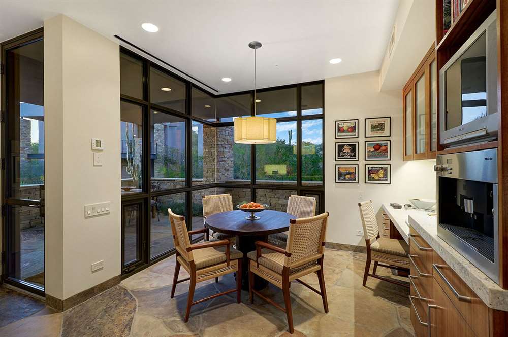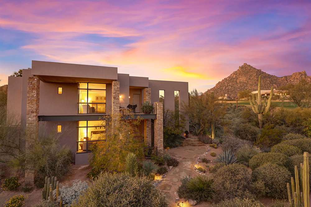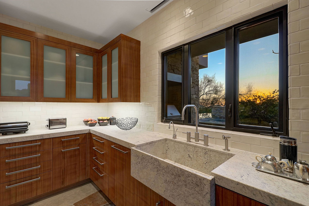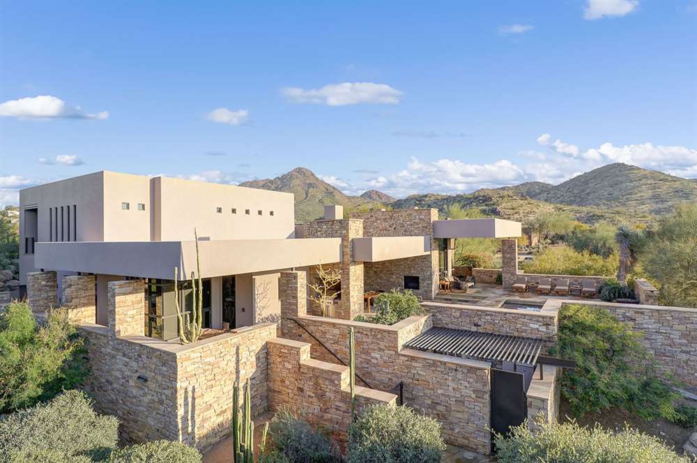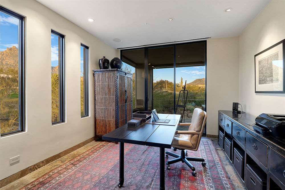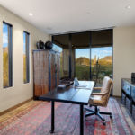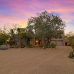 Timeless architecture and design grace this contemporary styled home with beautiful organic elements throughout. This masterpiece is located in the prestigious guard-gated community of Glenn Moor at Troon Village, home to the back nine of Troon Country Club’s private course. Featured in Phoenix Home and Garden Masters of the Southwest issue, the home was designed by renowned architect Hugh Knoell (Knoell Quidort Architects) and offers design elements that embrace the desert setting allowing for seamless living inside and out including steel and glass doors, flagstone flooring throughout, high ceilings, locally sourced stacked stone walls and clean lines.