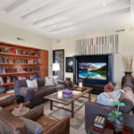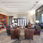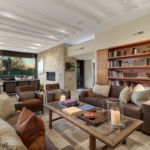 Large gathering spaces including a dual setting great room with recessed beam ceilings, built in bookcases, floor to ceiling windows and cozy fireplace adjacent to the dining room overlooking the wall fireplace in the backyard.
