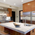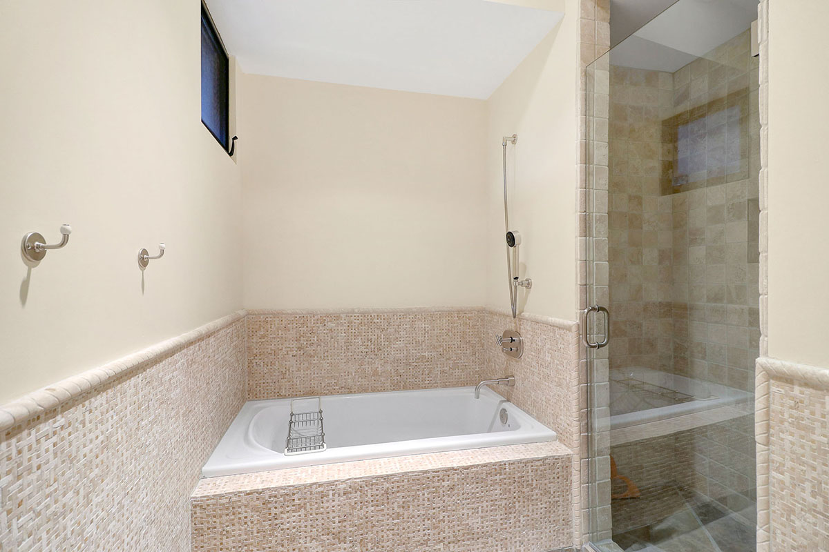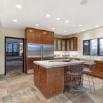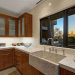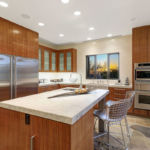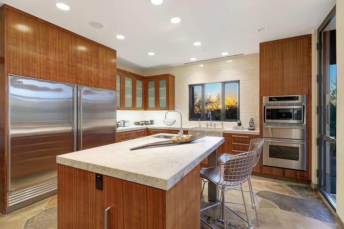 Back inside the home, the kitchen is a chef’s delight with a Subzero refrigerator and freezer, Thermador wall oven and microwave, Viking gas stove with hood vent, and Miele coffee maker all in stainless steel. The matte finish countertops and tile backsplash bring a delicacy to the custom Hawaiian Koa wood cabinetry extended to the built-in desk at the intimate breakfast area with a wall of windows.