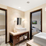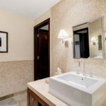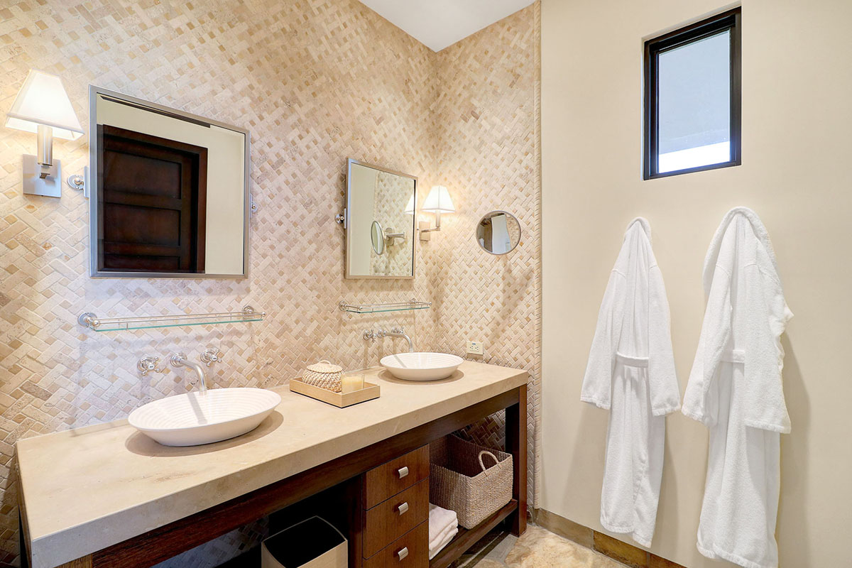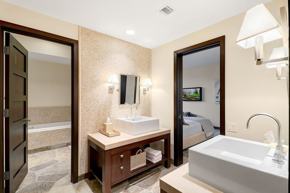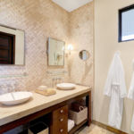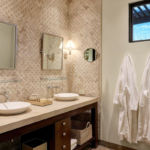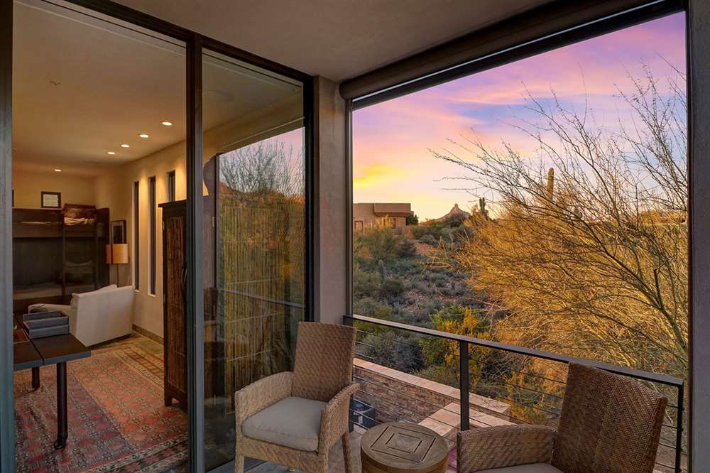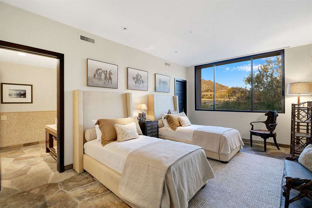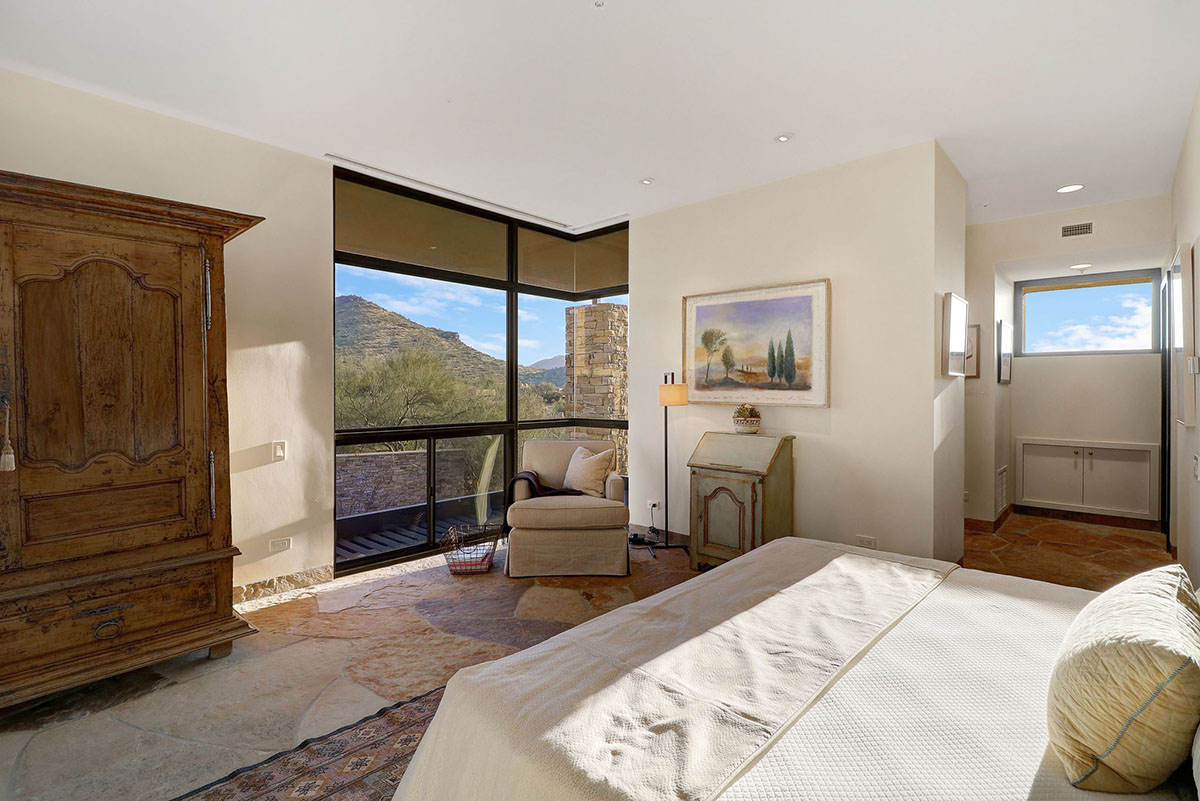 The home features a main level master with a spa-like bath including a private vanity area, large soaking tub and a dual entry shower. Upstairs finds two additional guest bedrooms with shared bath featuring basket weave tile accents, dual sinks and a separate shower/toilet room opening to the loft with built-in entertainment center. Two more ensuite guest rooms can be found in the detached guest house with a private laundry and views overlooking the surrounding McDowell Mountain range, Pinnacle Peak and Troon Mountain, golf course, and pool offering a resort style experience for visiting guests.