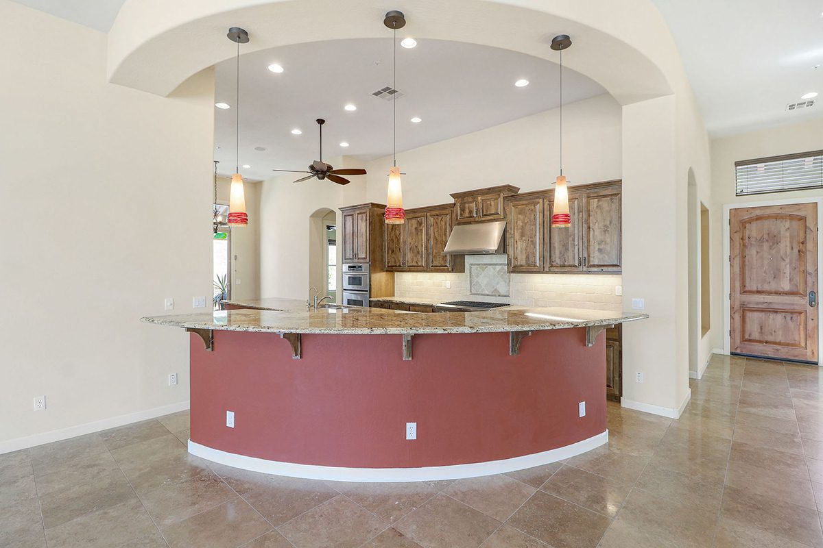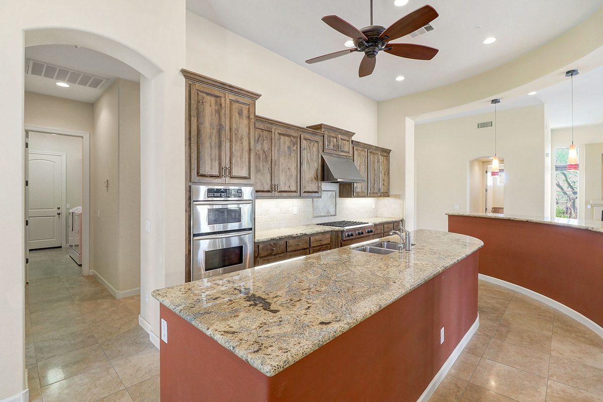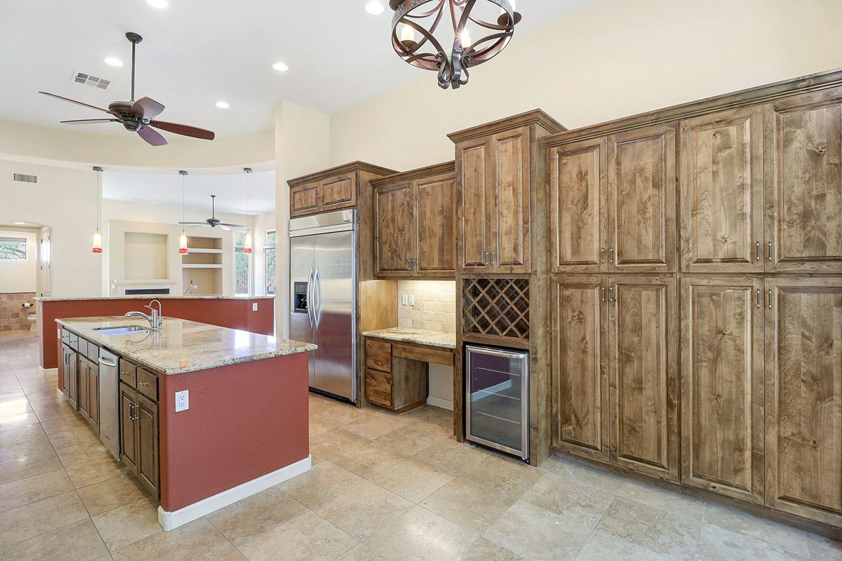 The kitchen has a private patio off the breakfast area, stainless steel appliances including a gas cooktop and beverage fridge, large center prep island with sink, built-in desk, beautiful cabinetry and a curved bar top with seating. The master bedroom has two exterior access areas, sitting room, and a large master bath with separate vanities, large soaking tub framing the entrance, separate walk-in shower, and two walk-in closets.