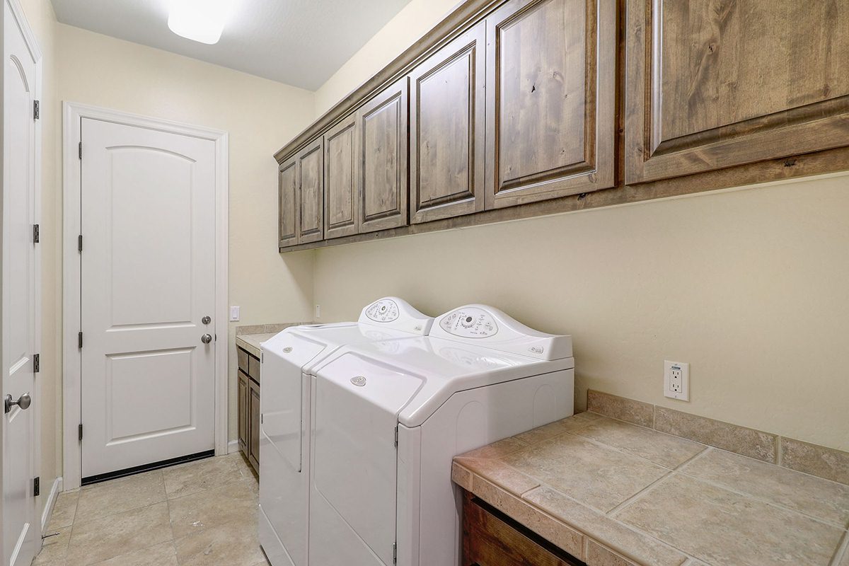 The three-car garage with chevron patterned doors, tile roof, paver drive and exterior stacked stone accents create a beautiful first impression. The open dining and living room spaces feature lots of windows overlooking the rear yard, a cozy fireplace and built-in entertainment center and shelves.