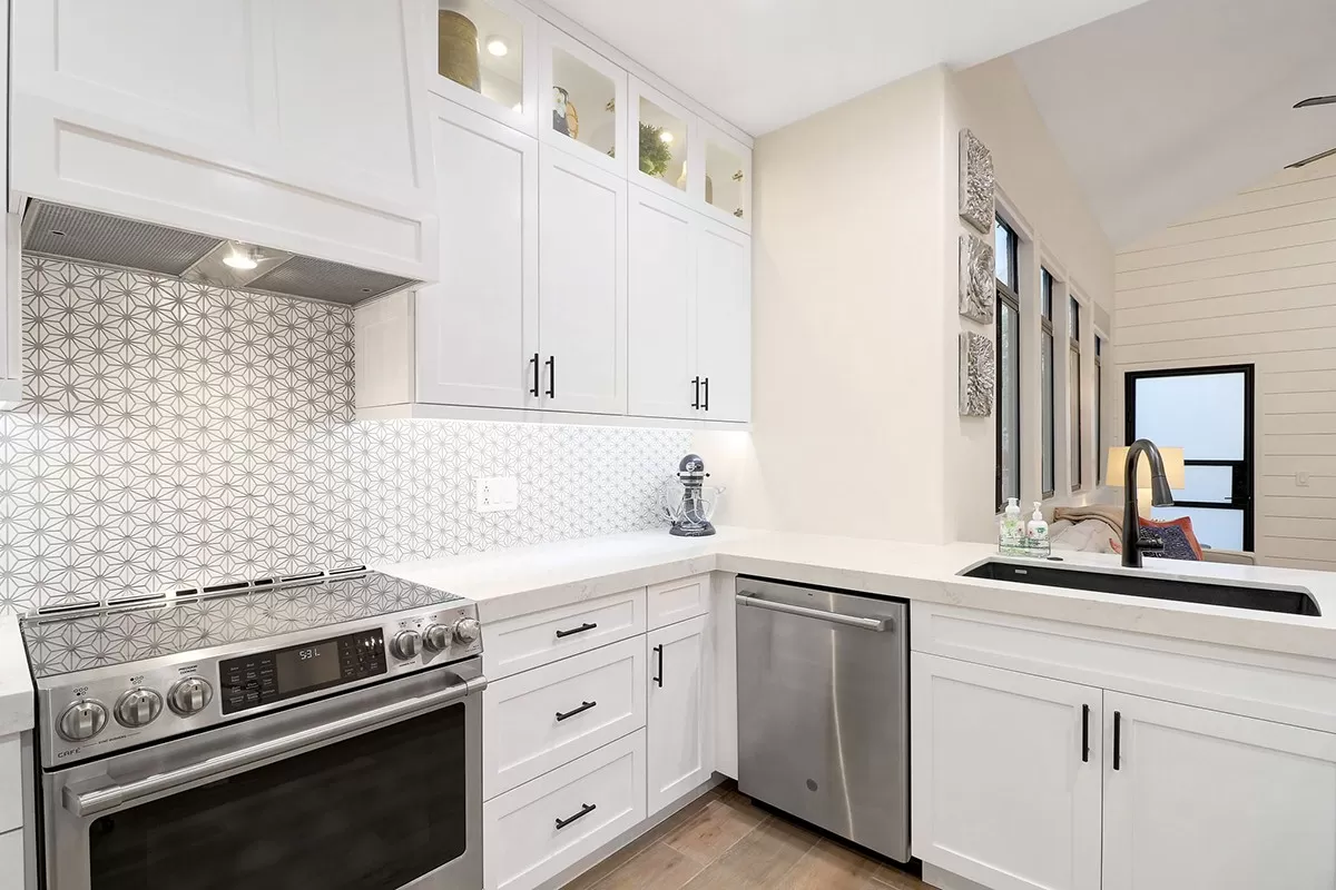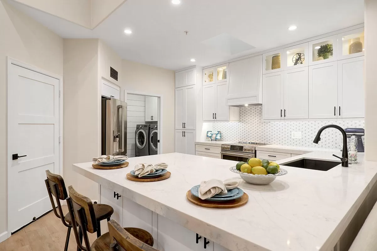 The kitchen has ample storage, soft close cabinetry, tile backsplash, quartz counters, stainless steel appliance package and an eat-in breakfast bar. This serene, quiet, and gated subdivision features a community pool and paved paths for walking and jogging, all within walking distance to top notch shopping and dining.
