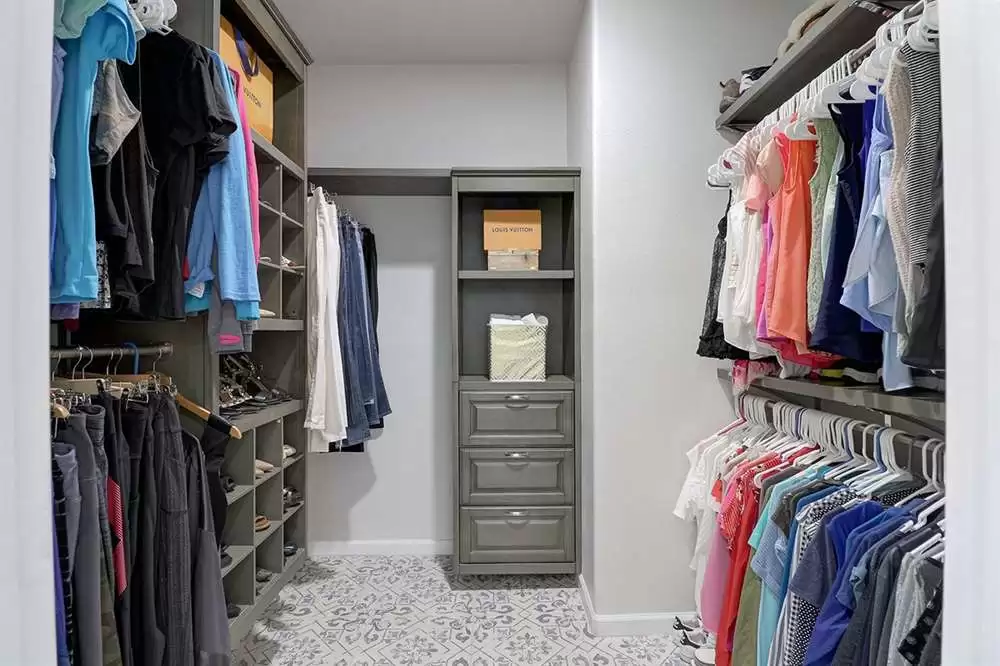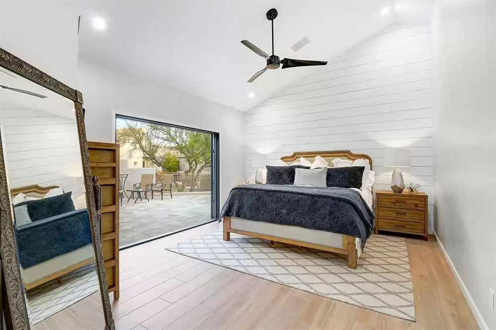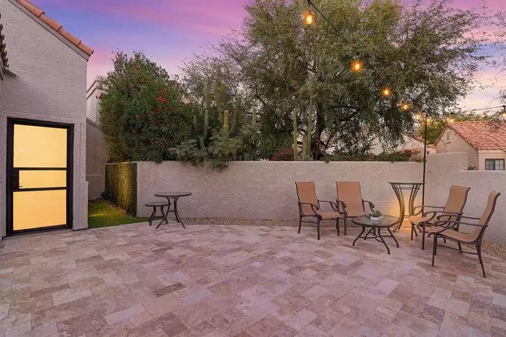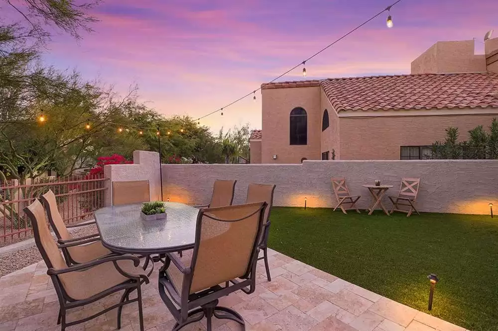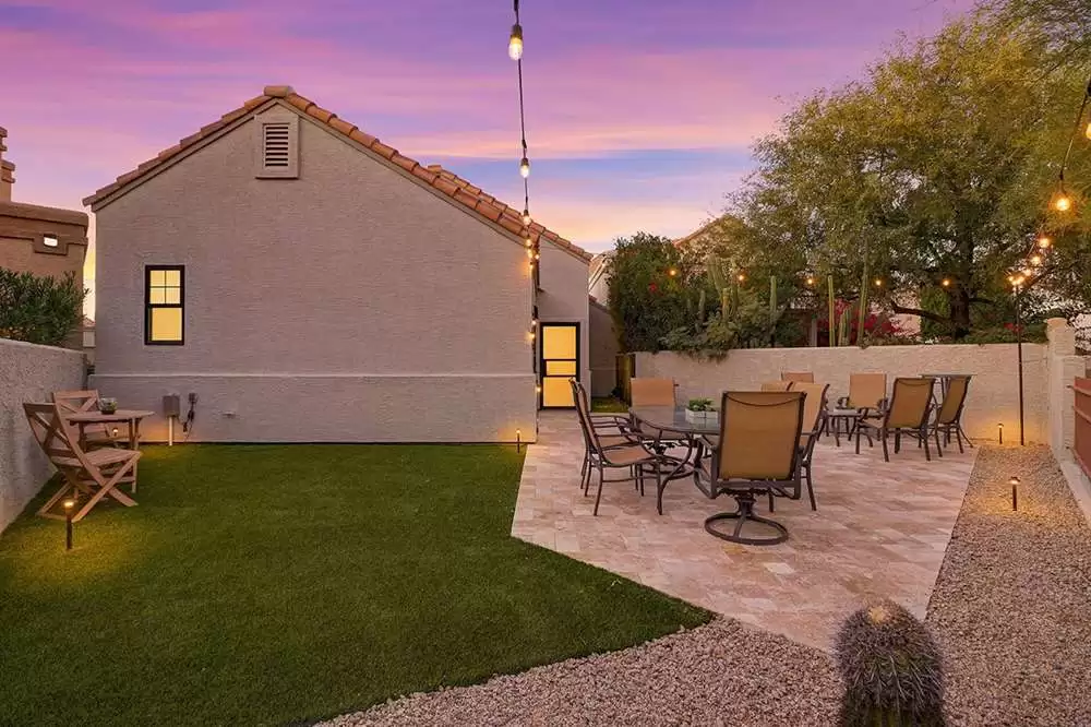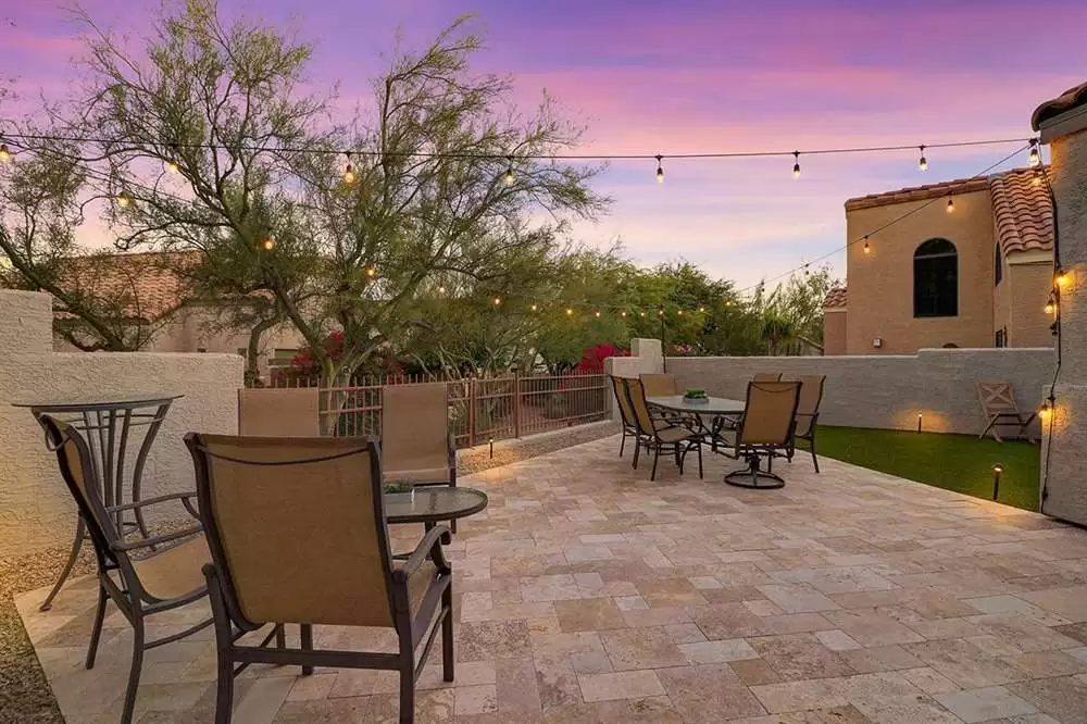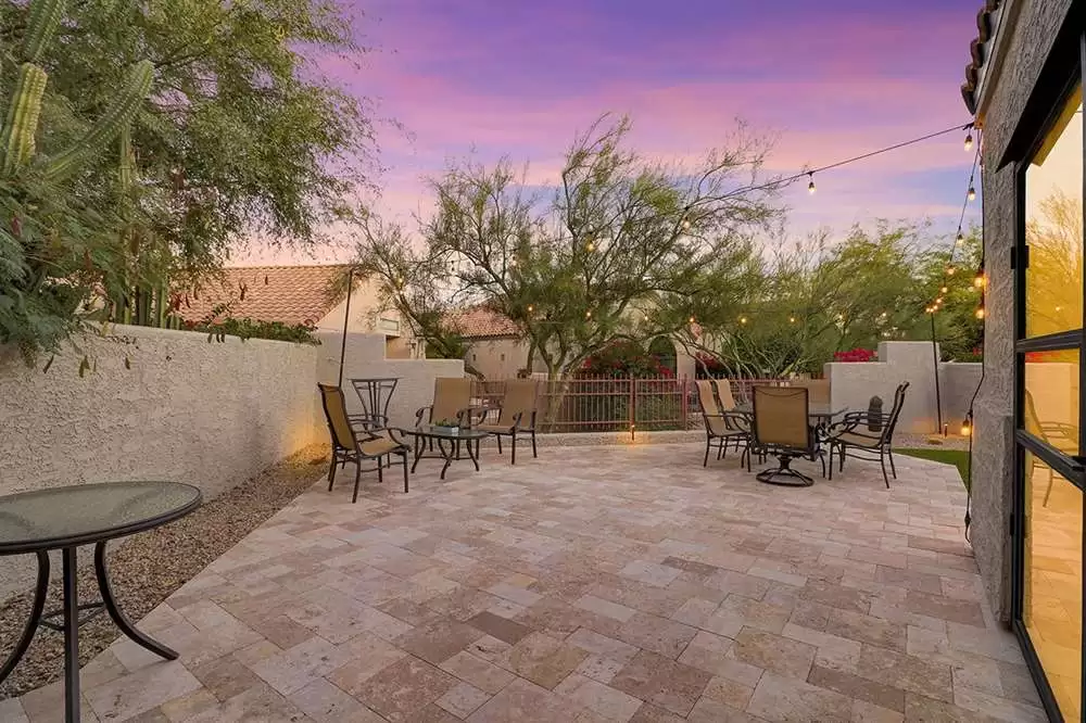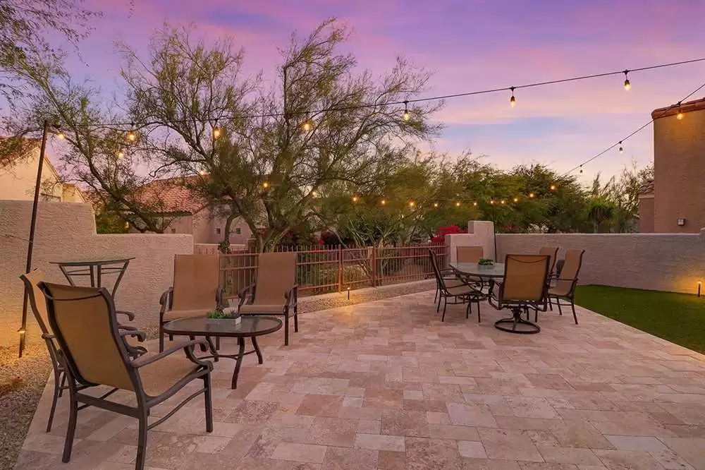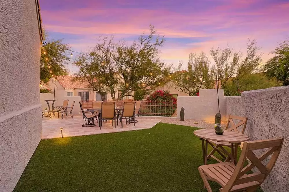The master bedroom has custom metal double doors leading to the backyard with travertine hardscape, artificial turf, and zero maintenance landscaping all to enjoy the picturesque Arizona skies. The master bath has a soaking tub, double vanity, walk-in shower and a large closet with built-ins.
