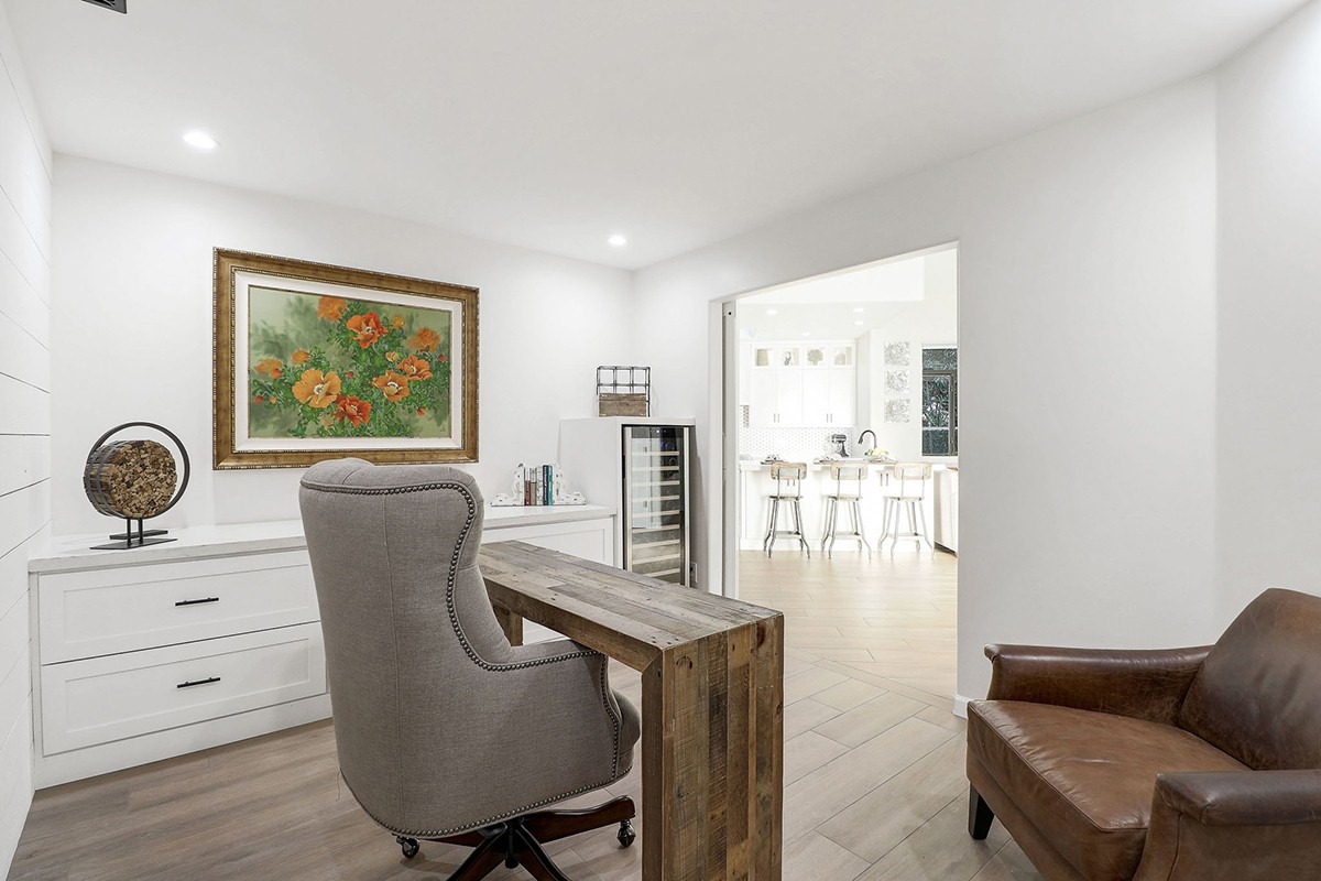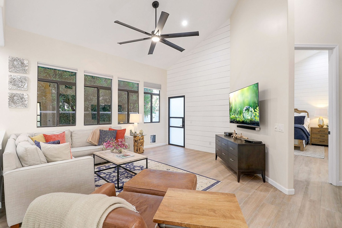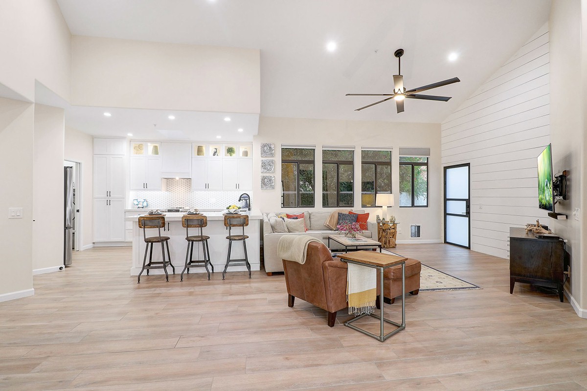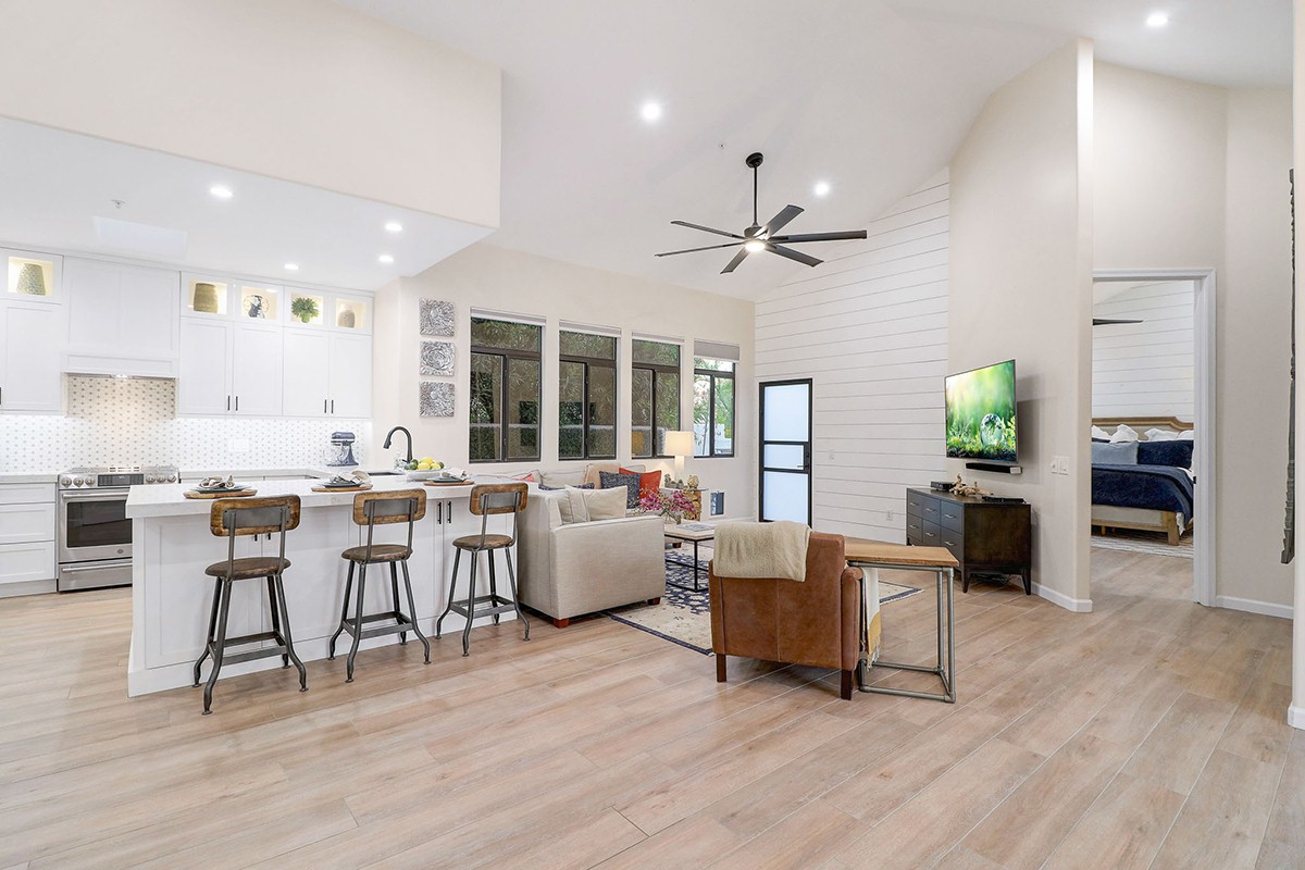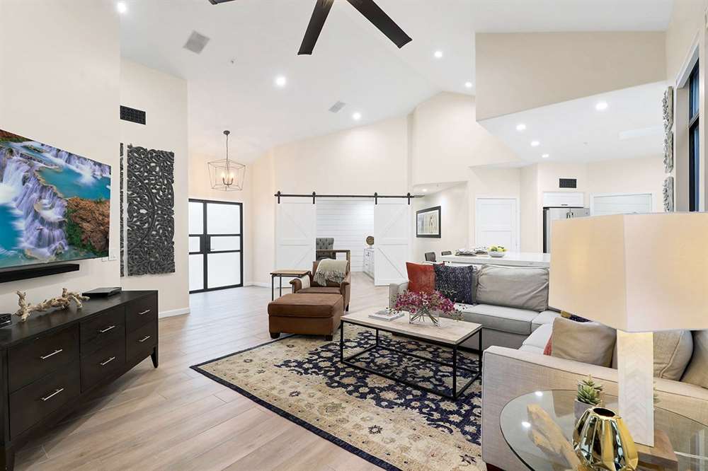 Perfect for either a seasonal or full-time easy care residence, this two bedroom plus den (or third bedroom!) and two bath home showcases high ceilings, wood look tile floors throughout, great room open floor plan, shiplap and patterned tile accents, sliding barn doors, and a two car garage with electric charger and epoxy floors.