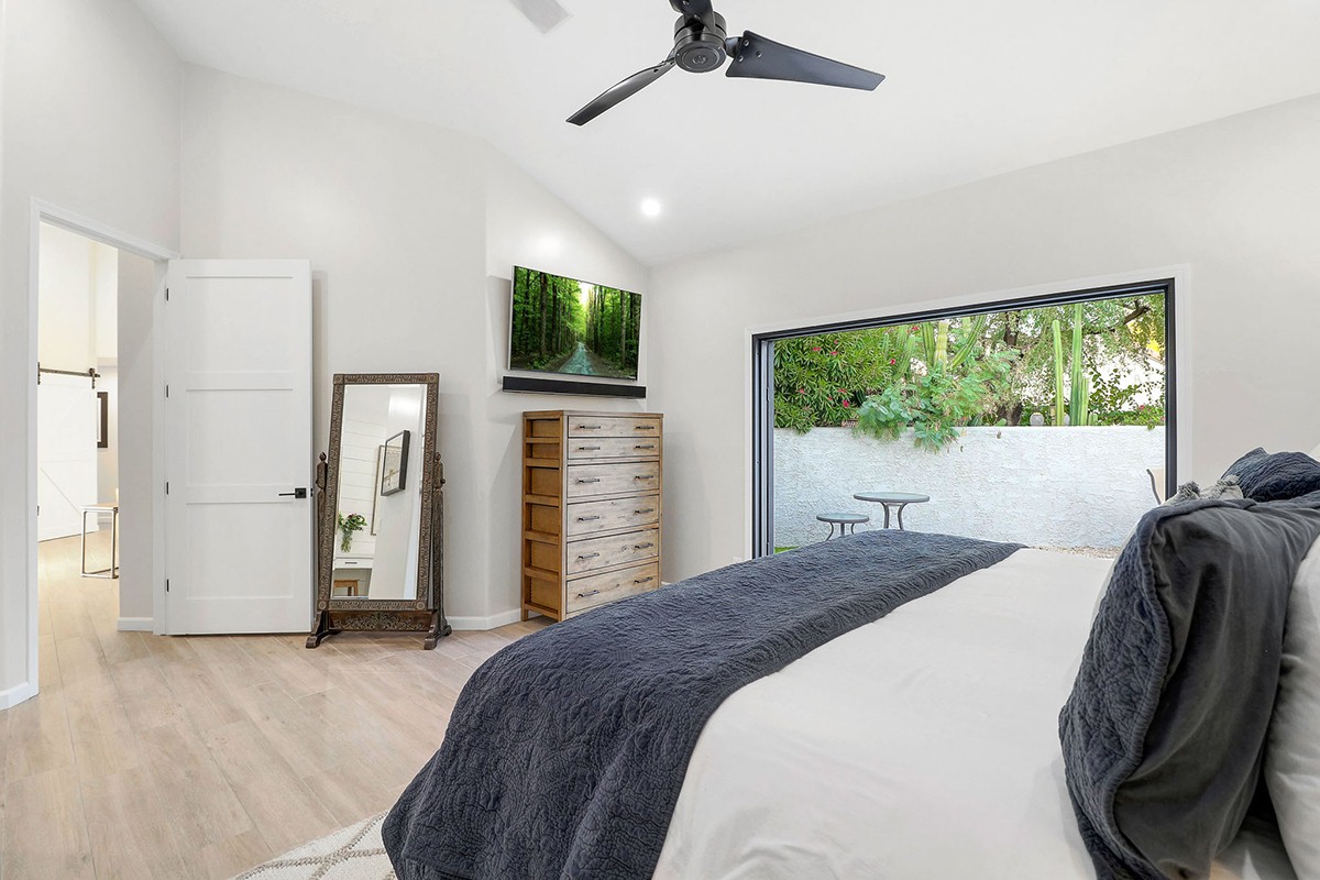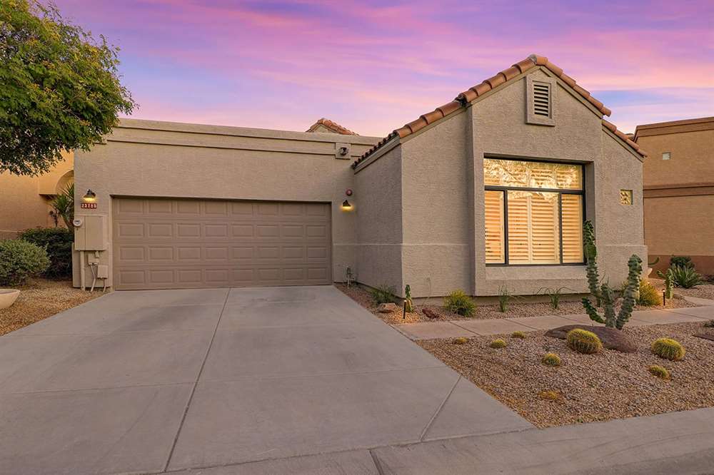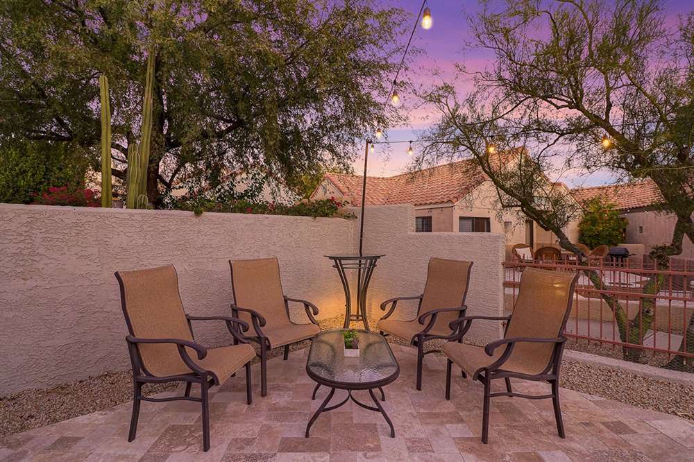 The master bedroom has custom metal double doors leading to the backyard with travertine hardscape, artificial turf, and zero maintenance landscaping all to enjoy the picturesque Arizona skies. The master bath has a soaking tub, double vanity, walk-in shower and a large closet with built-ins.