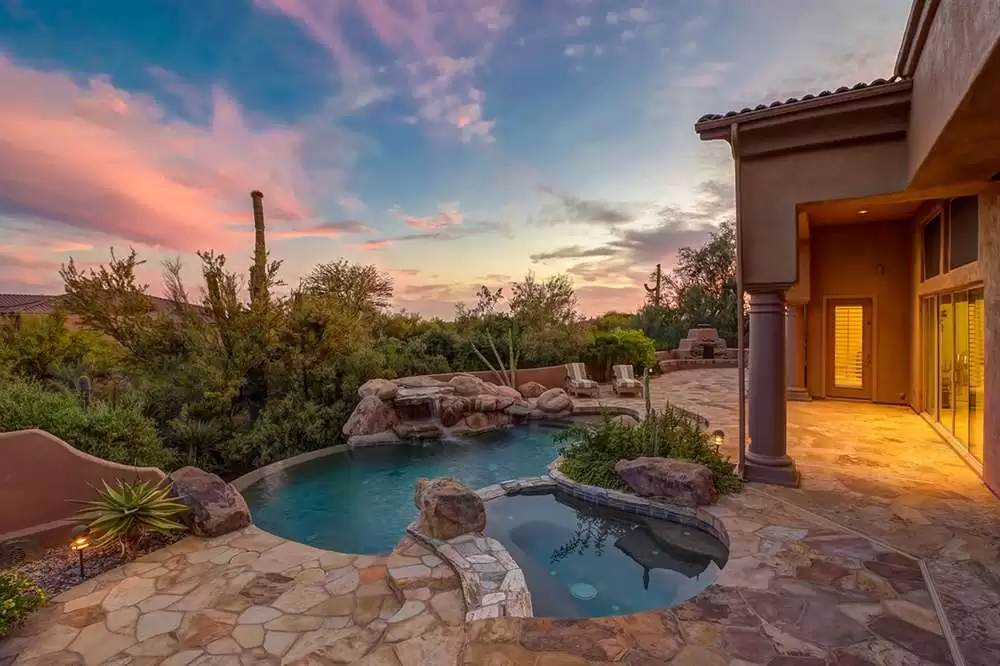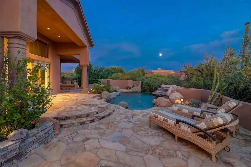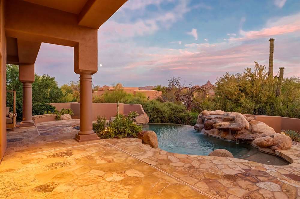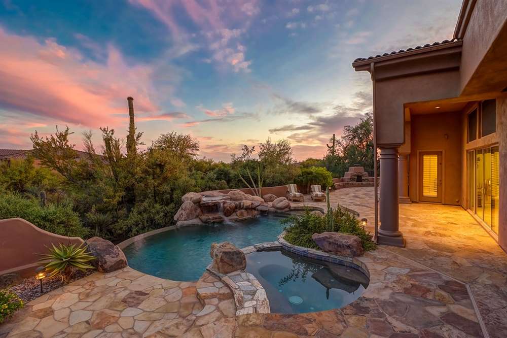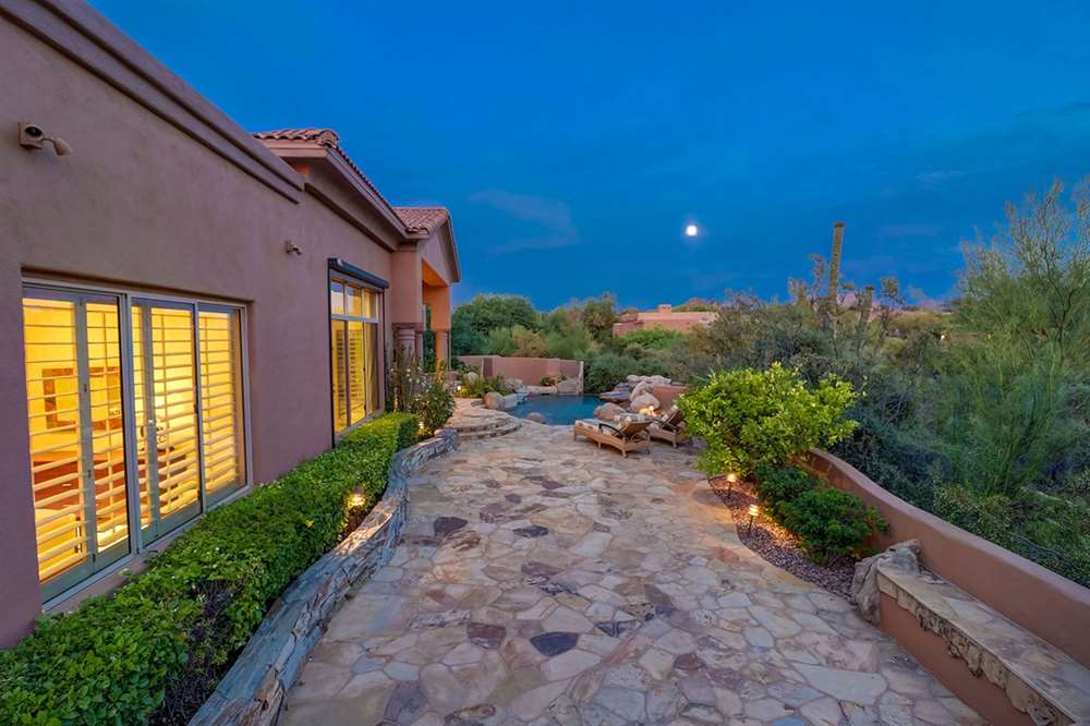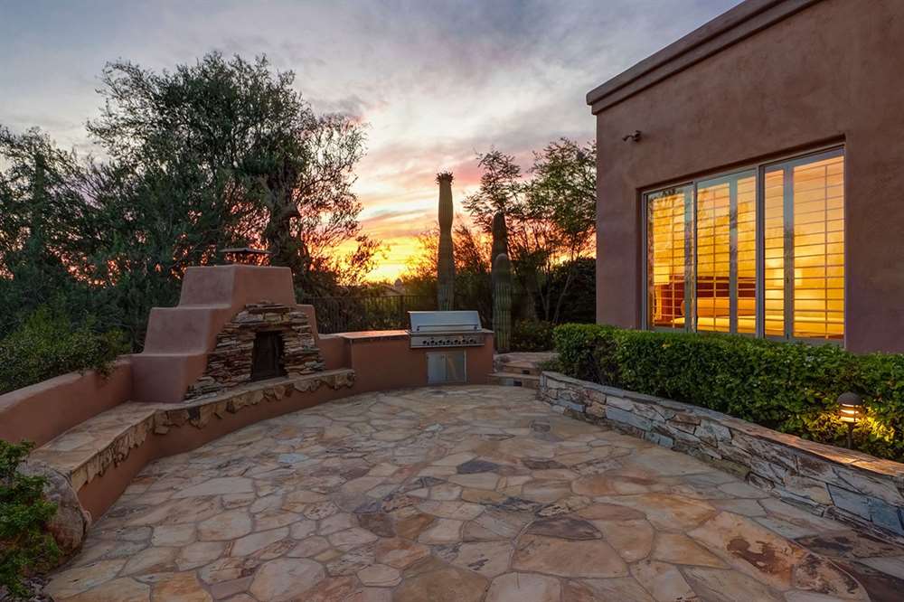 It is situated on a corner lot surrounded by Natural Area Open Space and adjacent to the 5th tee of Troon North’s Monument course. The low maintenance backyard has flagstone coverings throughout with a negative edge heated pool, rock waterfall feature, heated spa, large fireplace with built-in seating and barbecue, covered patios, landscaped planters all highlighting the Arizona sunsets and views of Pinnacle Peak.
