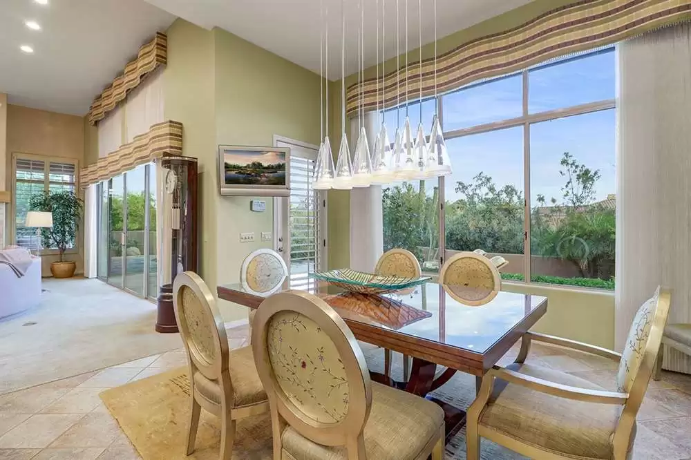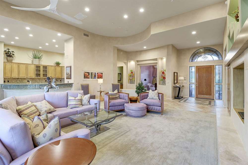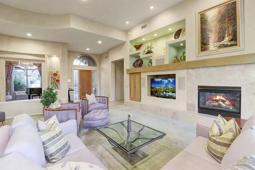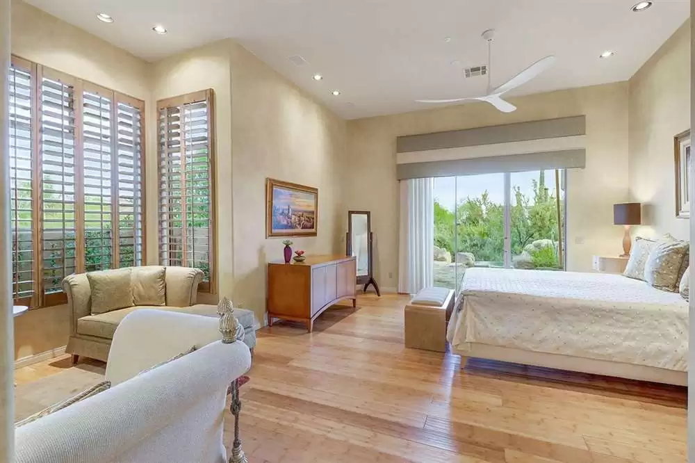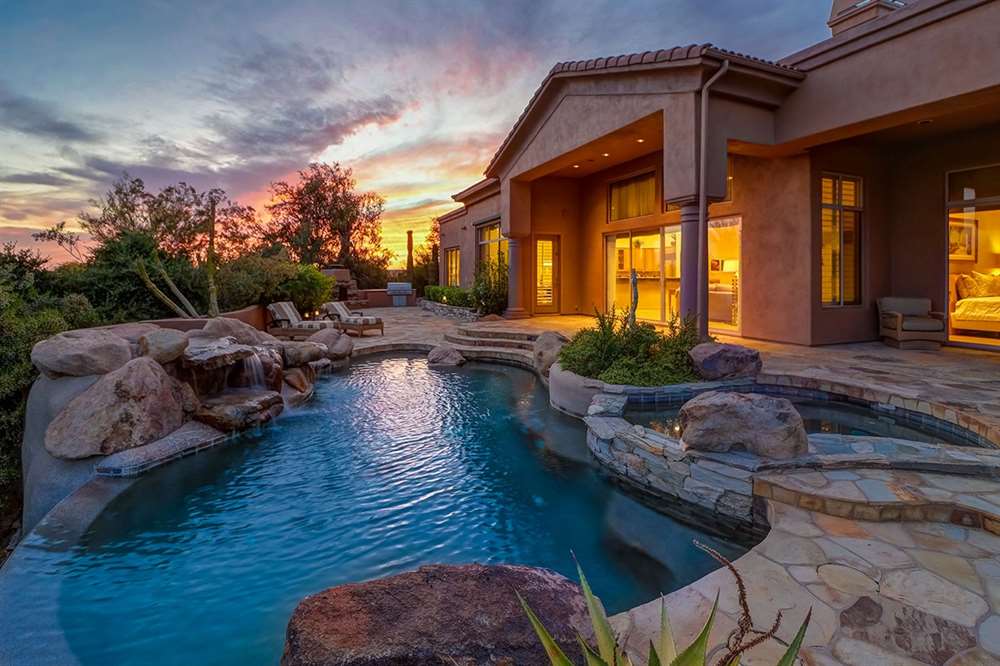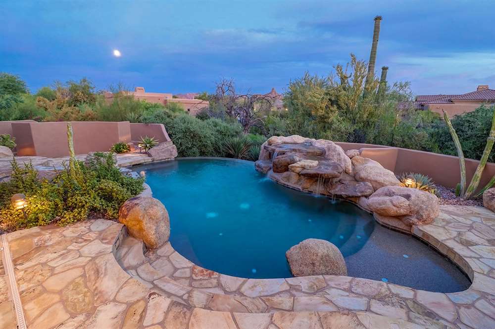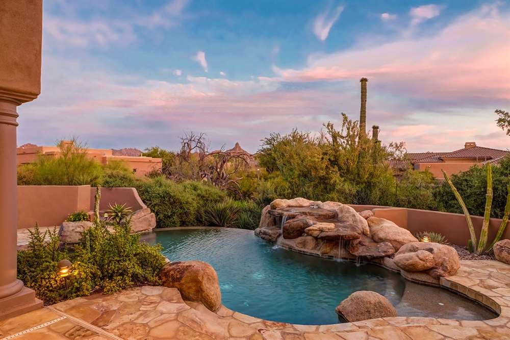 It is situated on a corner lot surrounded by Natural Area Open Space and adjacent to the 5th tee of Troon North’s Monument course. The low maintenance backyard has flagstone coverings throughout with a negative edge heated pool, rock waterfall feature, heated spa, large fireplace with built-in seating and barbecue, covered patios, landscaped planters all highlighting the Arizona sunsets and views of Pinnacle Peak.