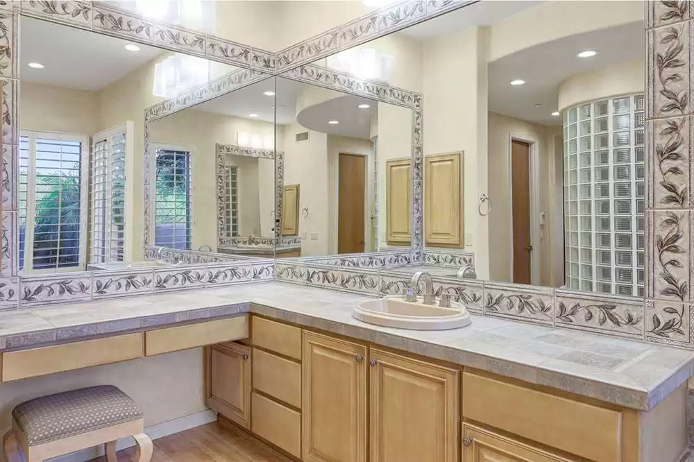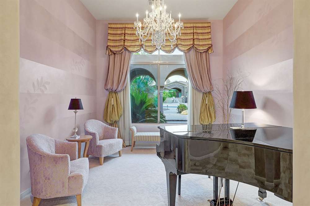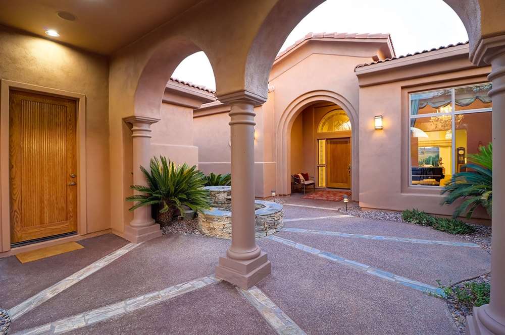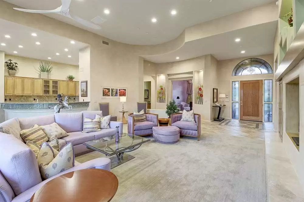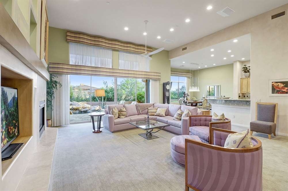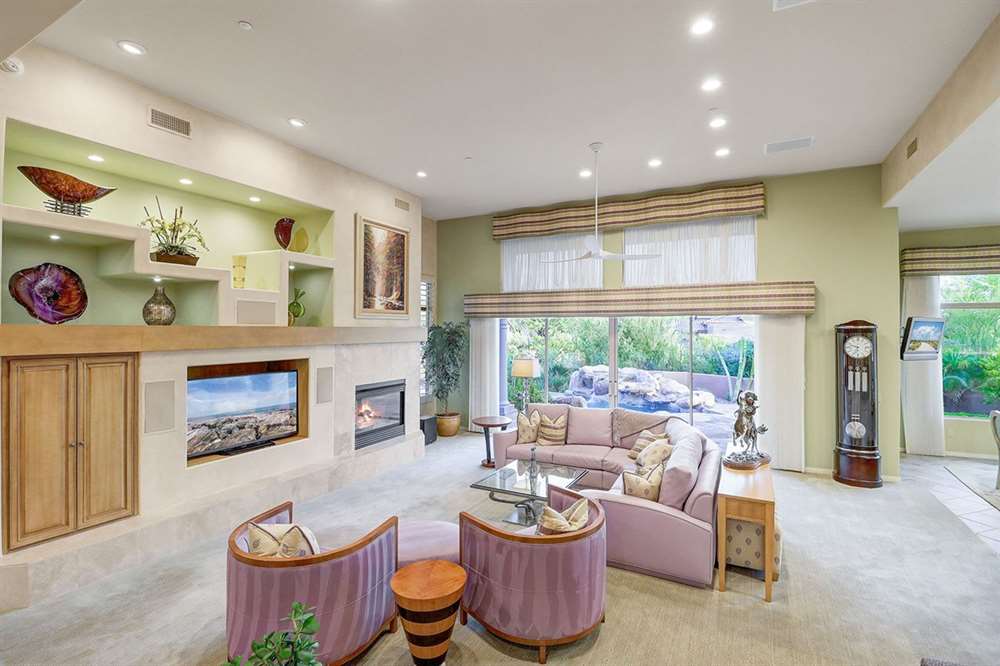 It is situated on a corner lot surrounded by Natural Area Open Space and adjacent to the 5th tee of Troon North’s Monument course. The low maintenance backyard has flagstone coverings throughout with a negative edge heated pool, rock waterfall feature, heated spa, large fireplace with built-in seating and barbecue, covered patios, landscaped planters all highlighting the Arizona sunsets and views of Pinnacle Peak.