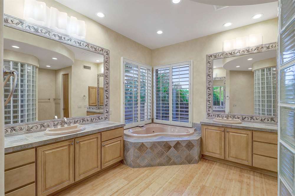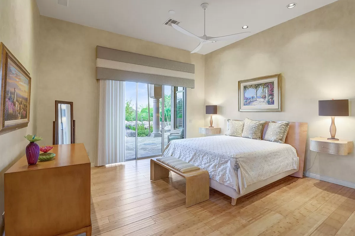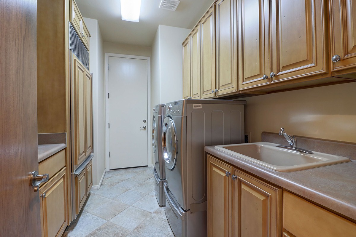 The large master has a large walk-in closet, master shower, separate soaking tub, dual vanities, beautiful bamboo wood flooring, and a sitting room with exterior access to the covered patio. The large laundry has plenty of storage and a sink along with a second subzero fridge.