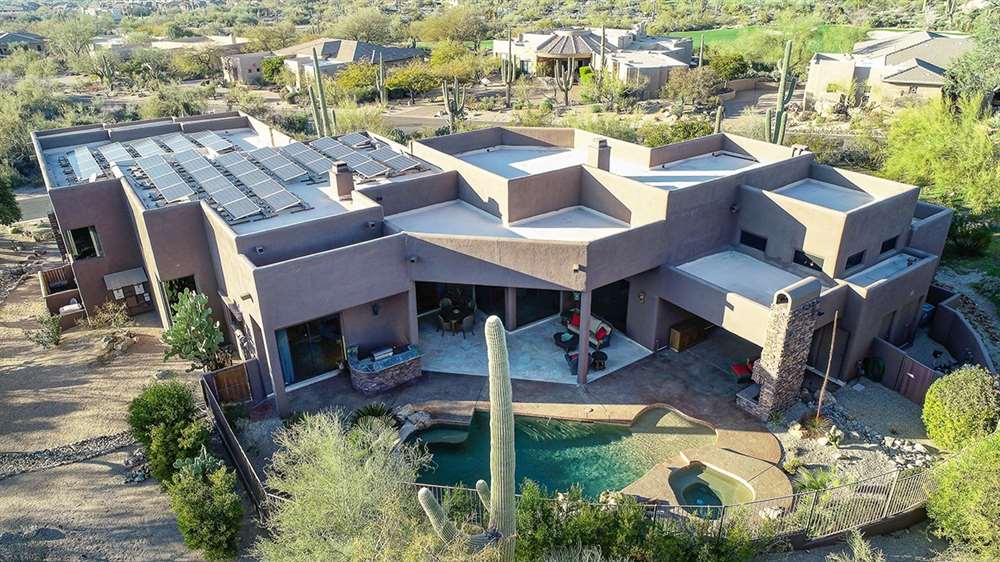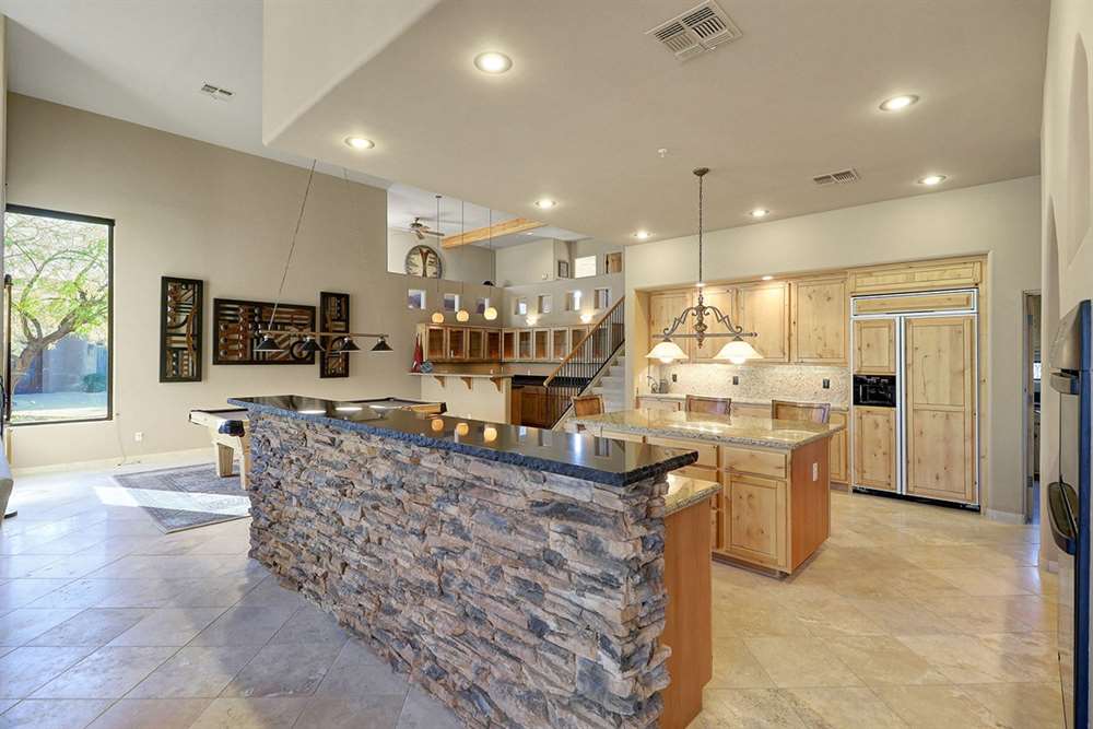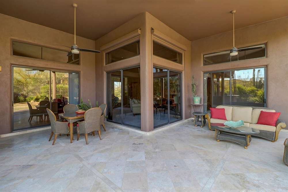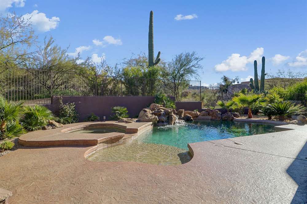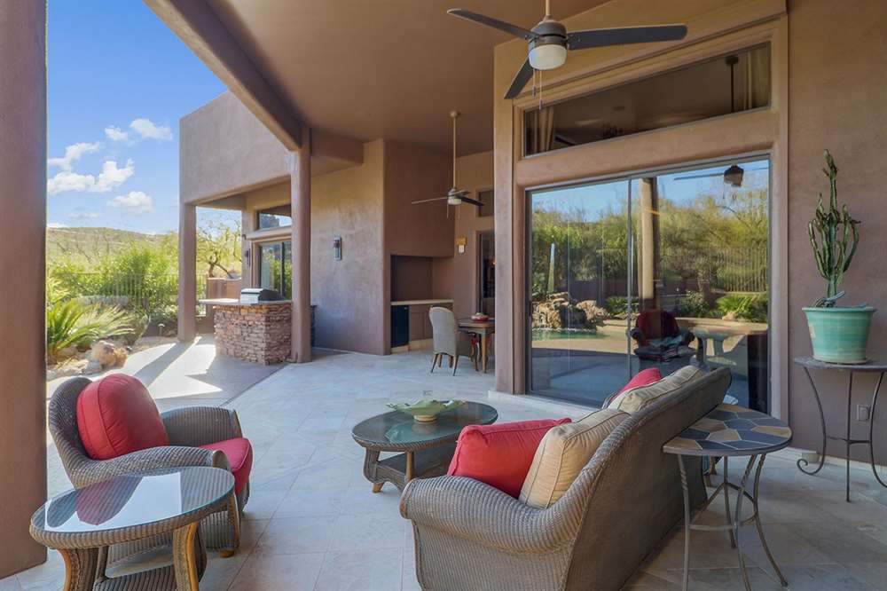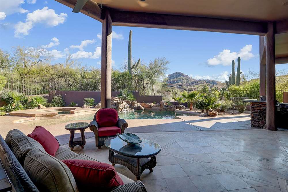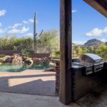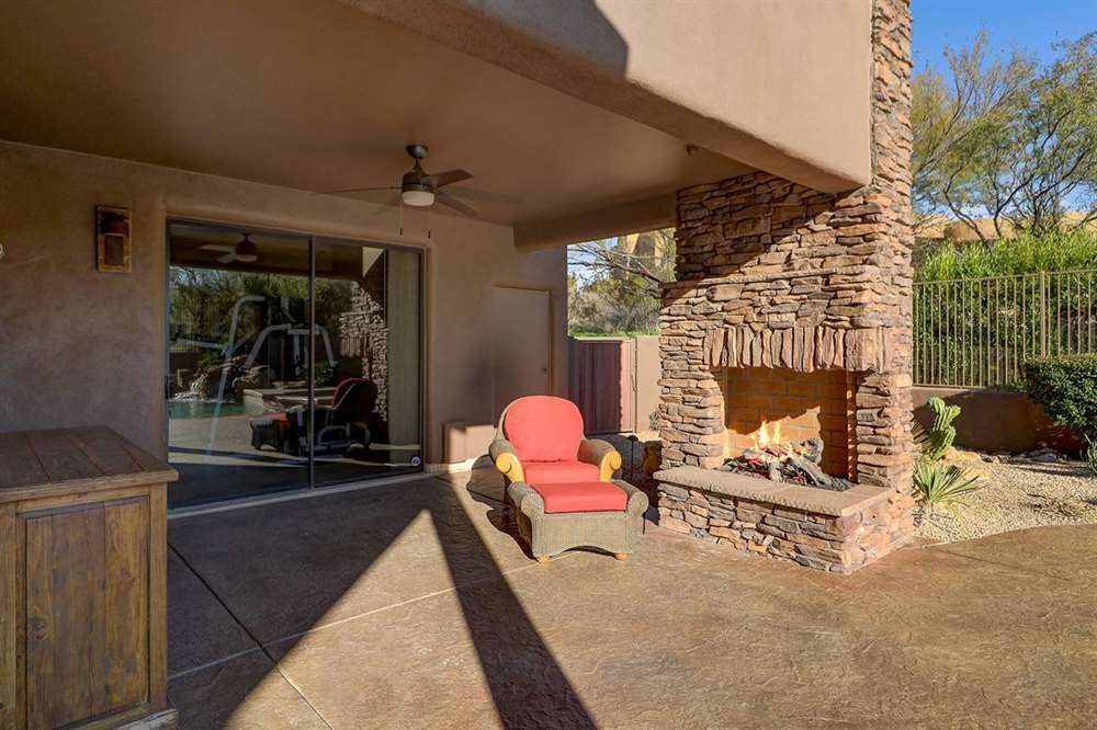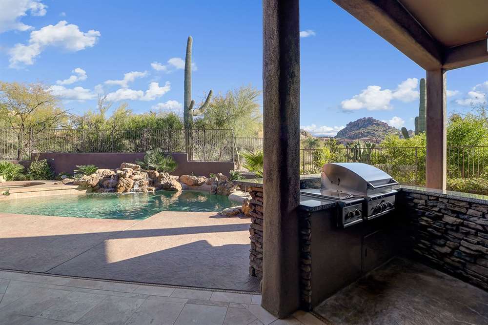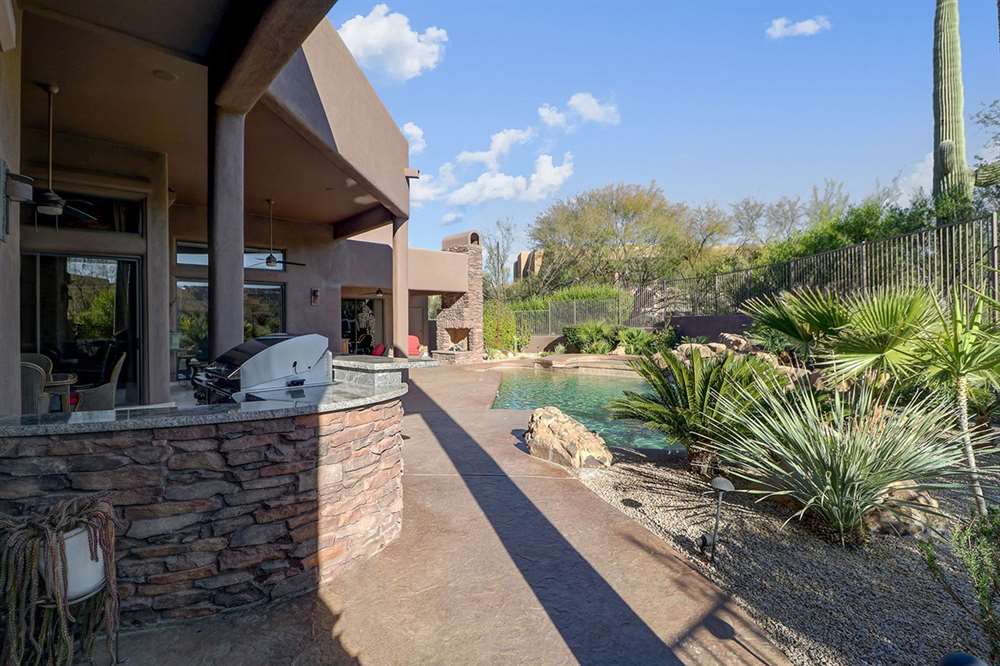 Step outside to the over 800 square feet of covered patio areas including multiple lounge and dining areas, built-in barbecue, stacked stone fireplace, heated pool and spa with rock waterfall feature, mature desert landscaping and views of Troon boulder formations. The owned solar panels provide alternate power to the home for added efficiency and cost savings.
