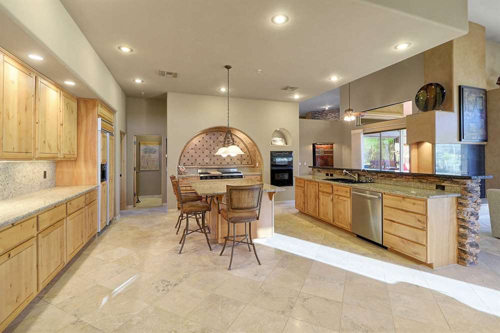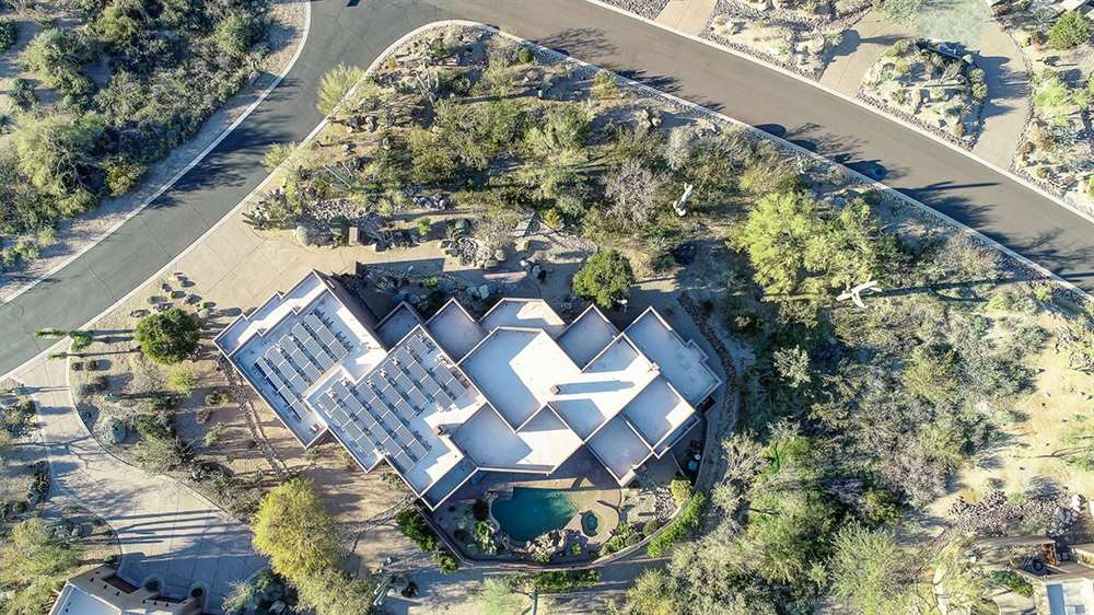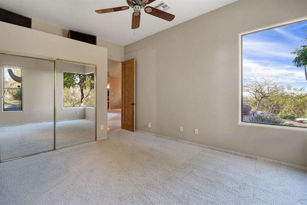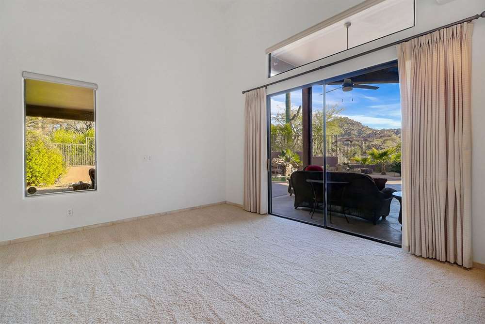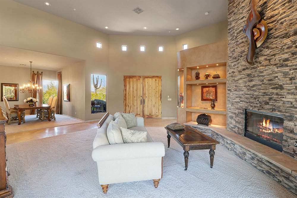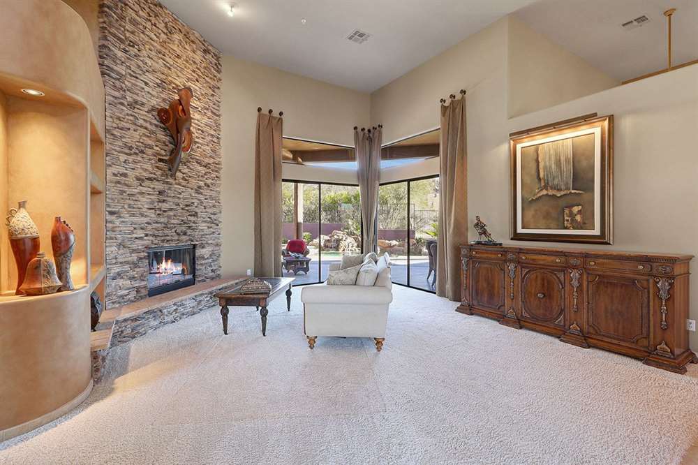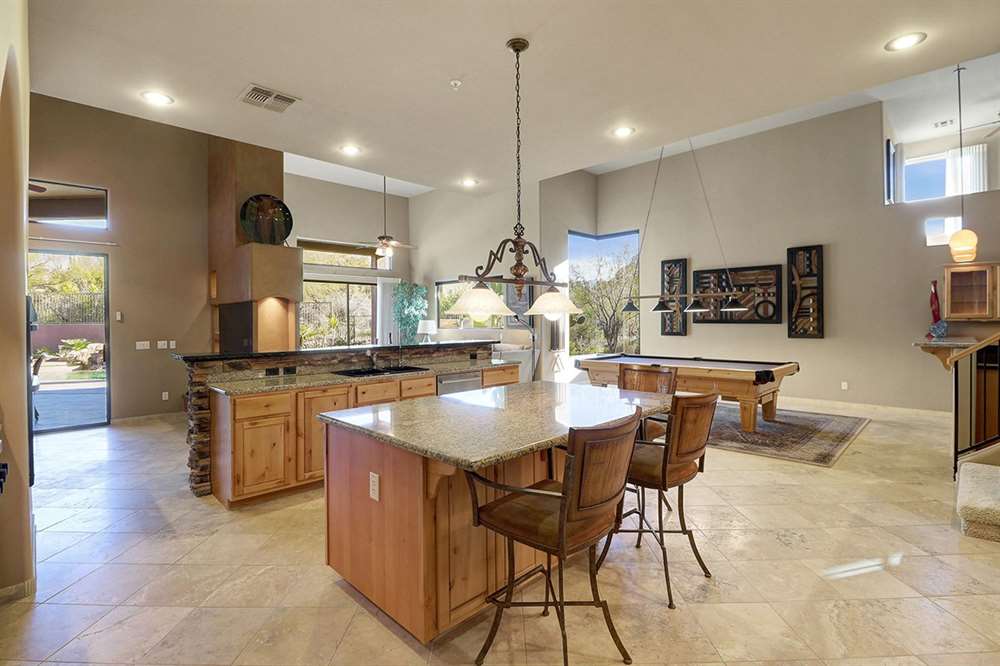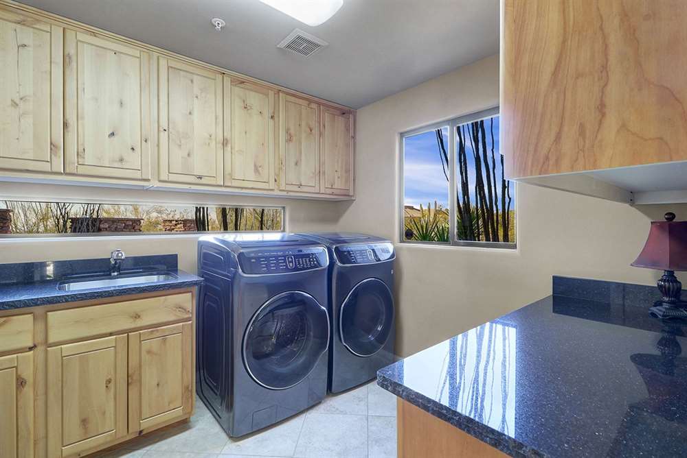Step outside to the over 800 square feet of covered patio areas including multiple lounge and dining areas, built-in barbecue, stacked stone fireplace, heated pool and spa with rock waterfall feature, mature desert landscaping and views of Troon boulder formations. The owned solar panels provide alternate power to the home for added efficiency and cost savings.
