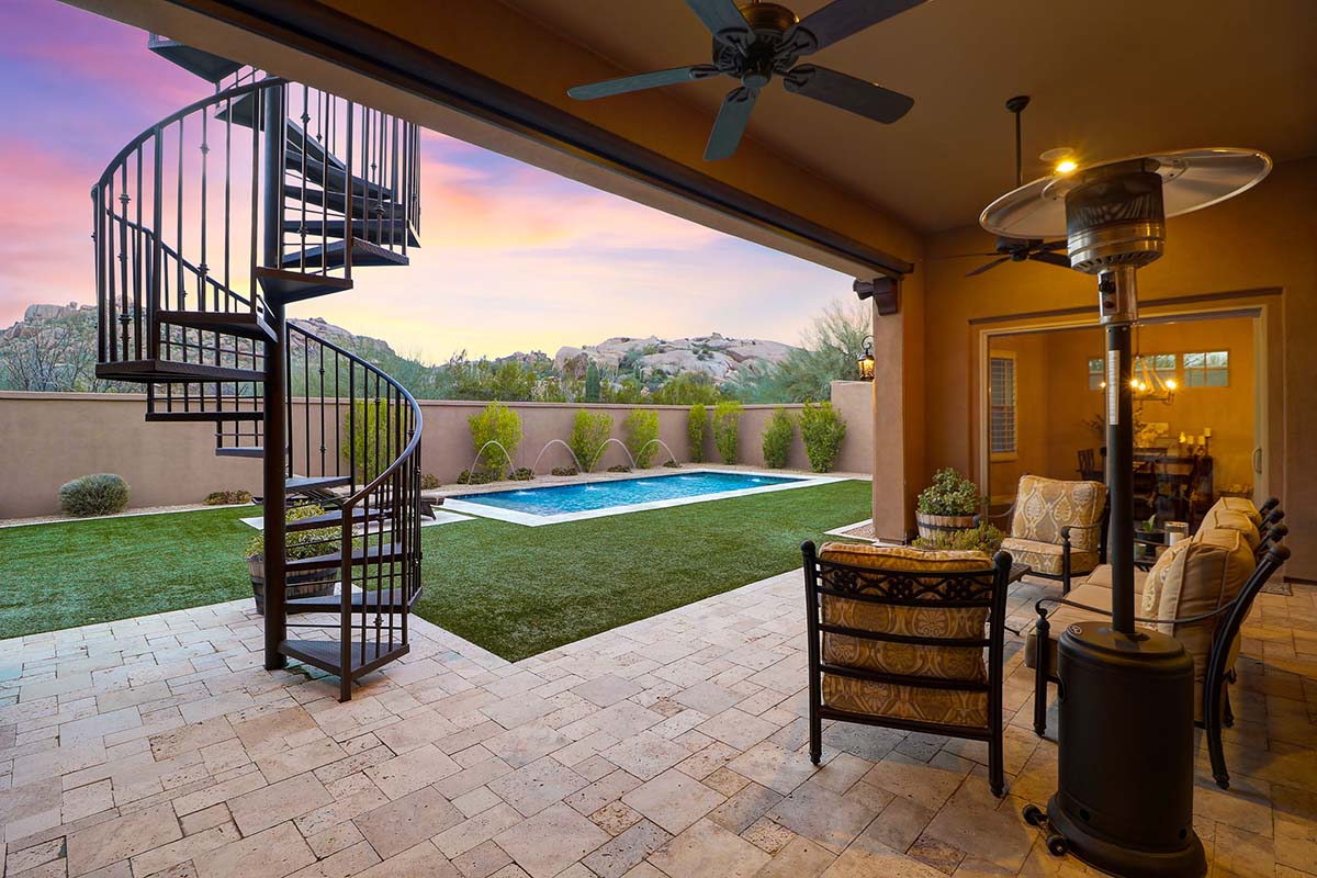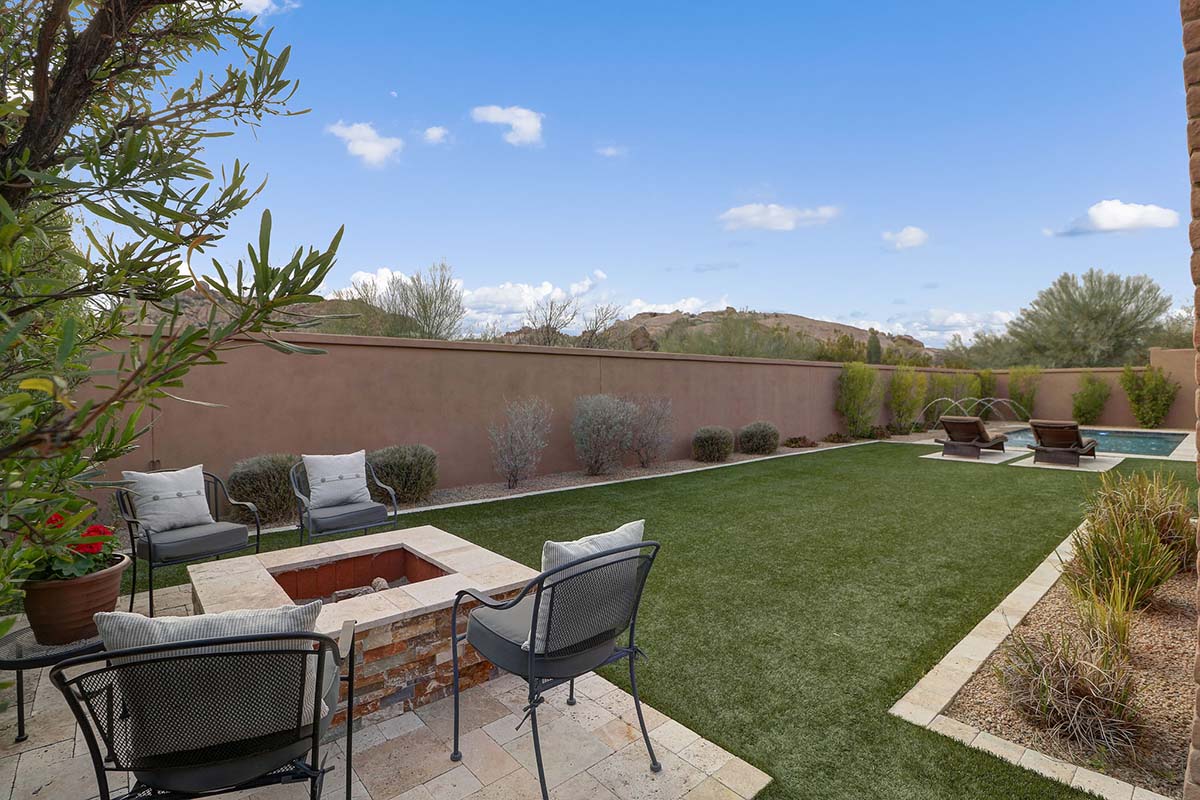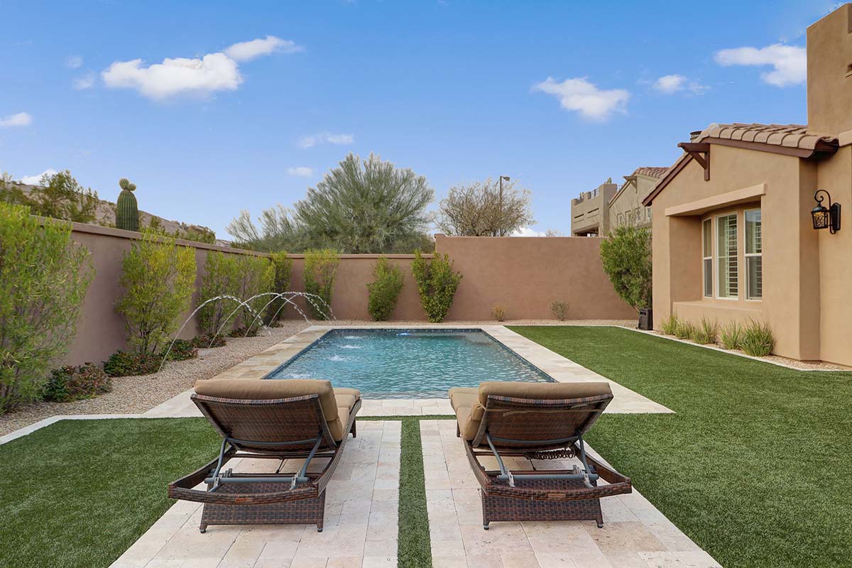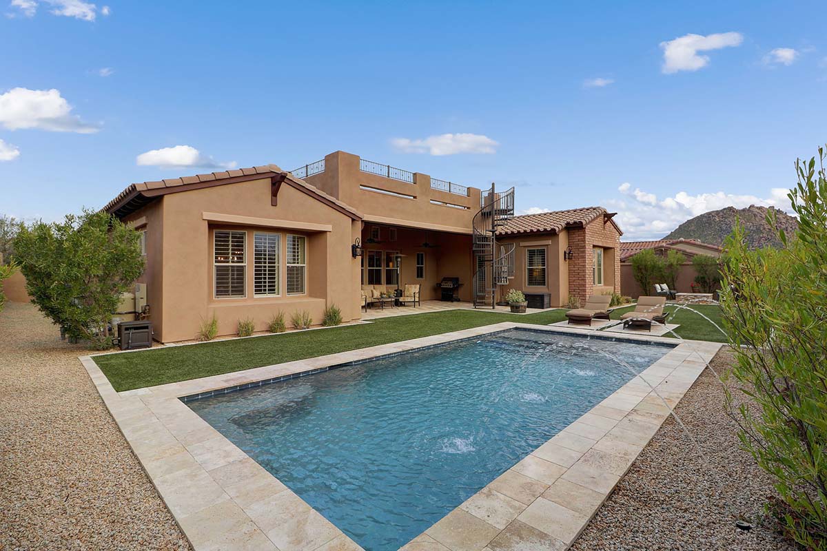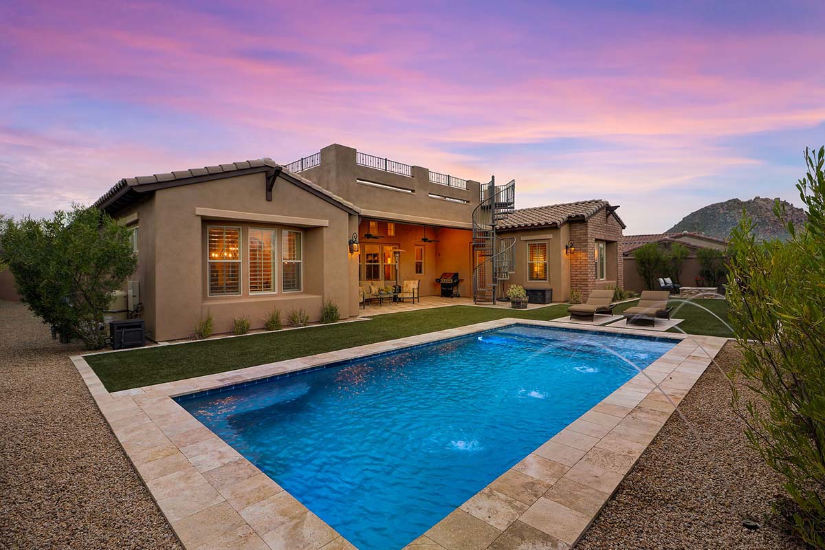 The backyard is a wonder land with artificial turf, symmetrical salt water pool, water fountain feature, covered patio, and a view deck accessed by a spiral staircase to enjoy the mountains views and Arizona sunsets.