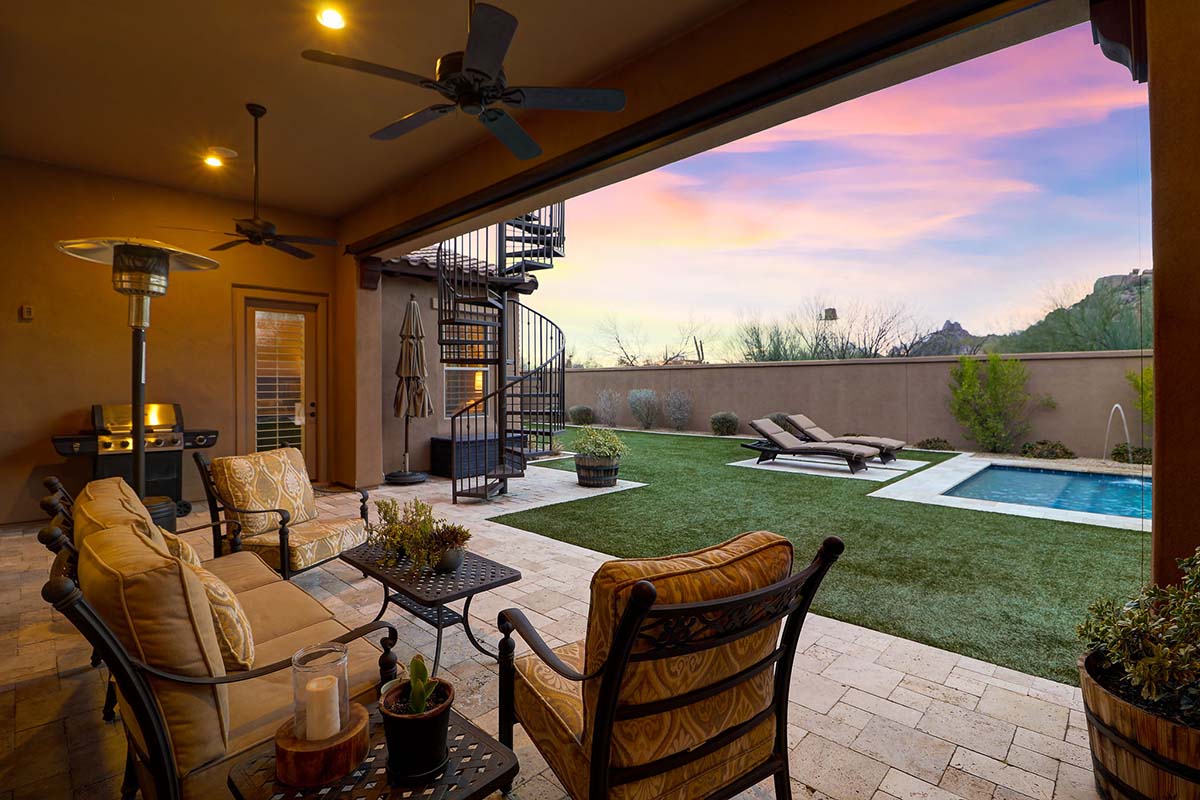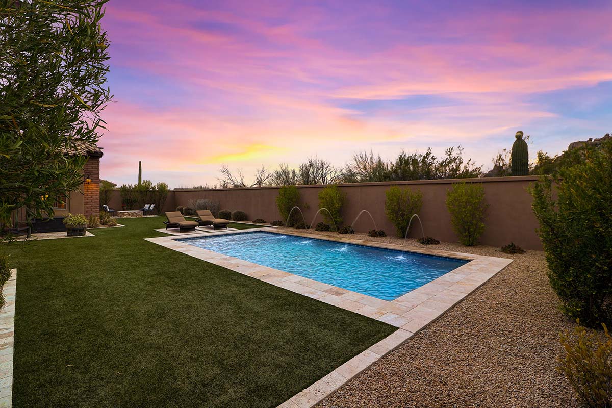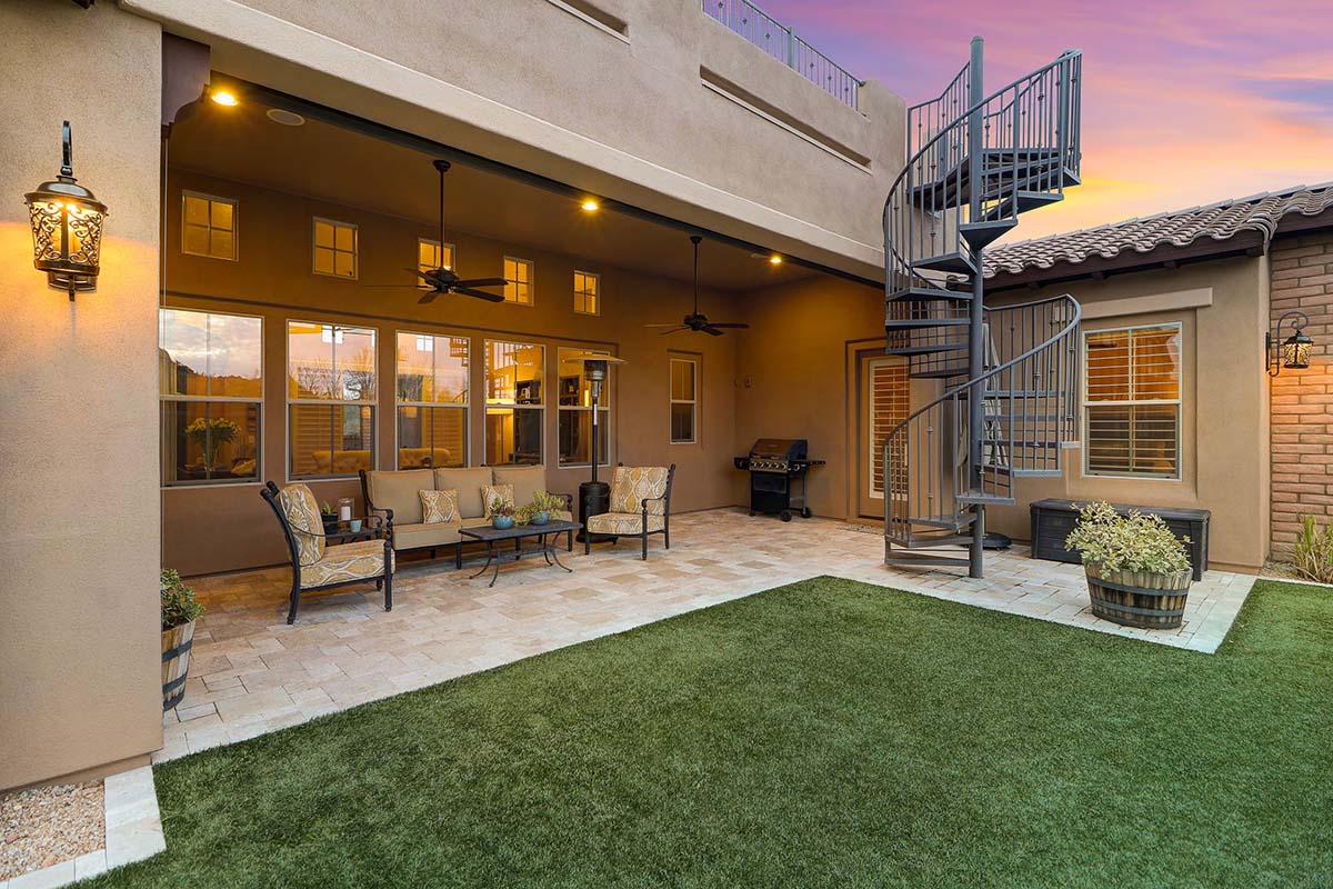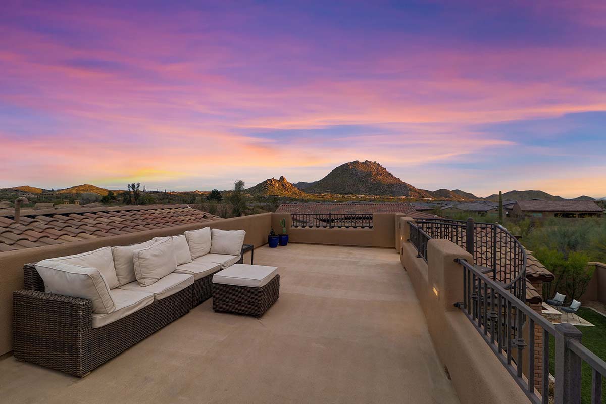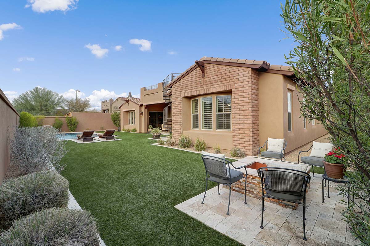 The backyard is a wonder land with artificial turf, symmetrical salt water pool, water fountain feature, covered patio, and a view deck accessed by a spiral staircase to enjoy the mountains views and Arizona sunsets.