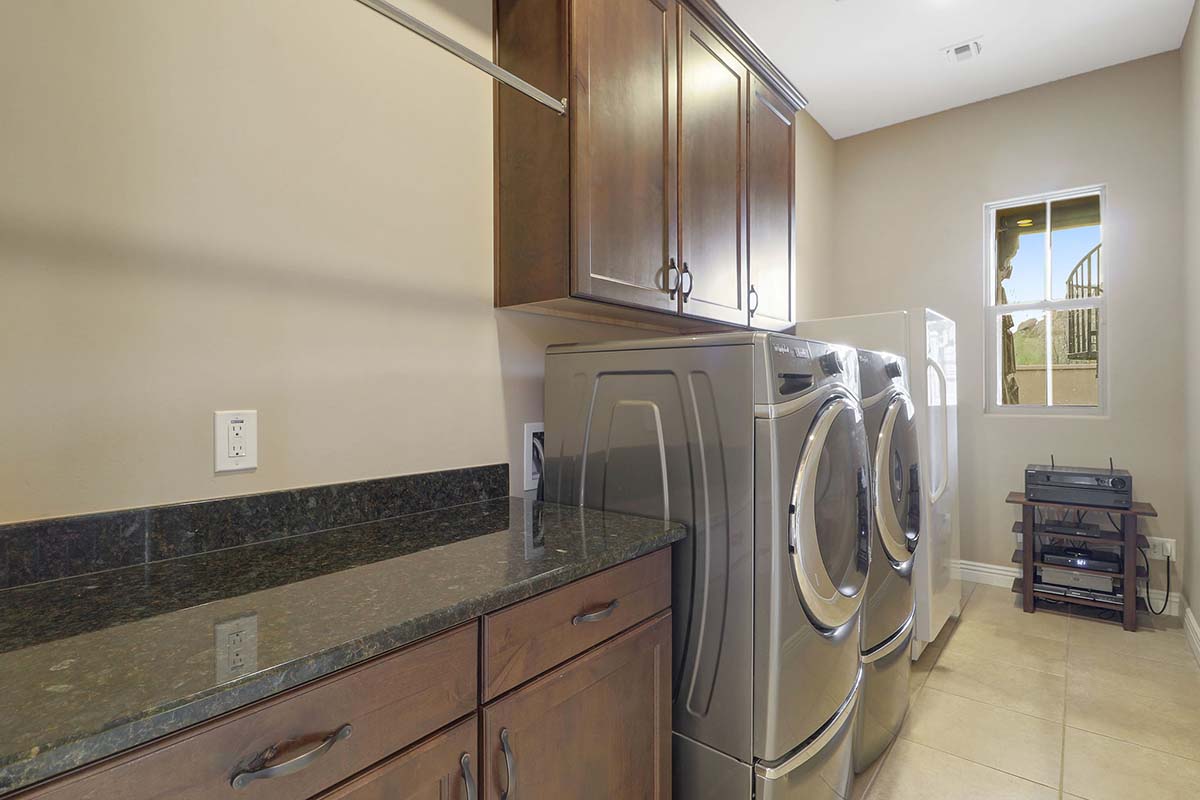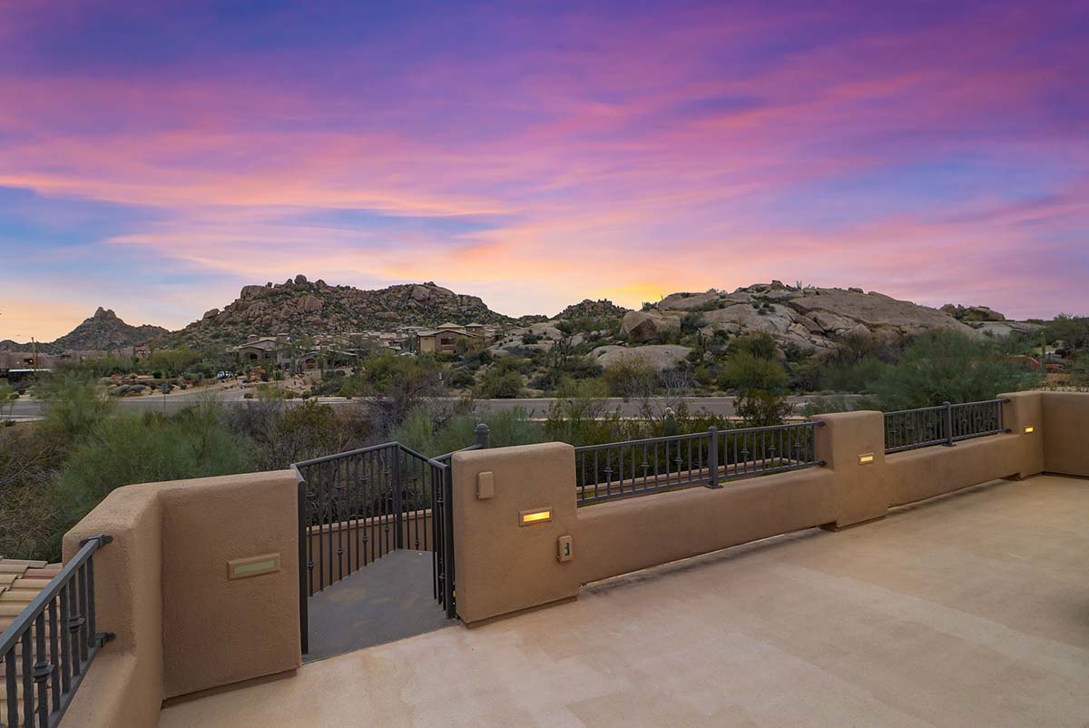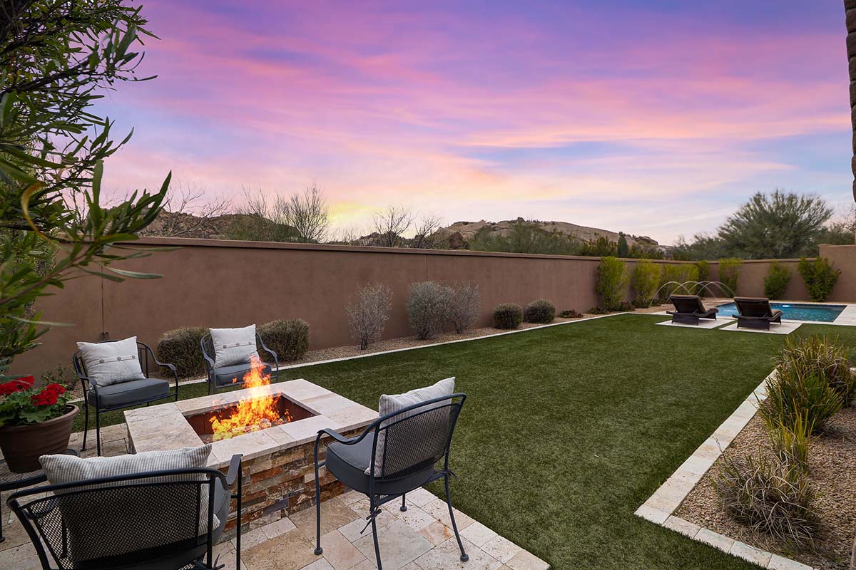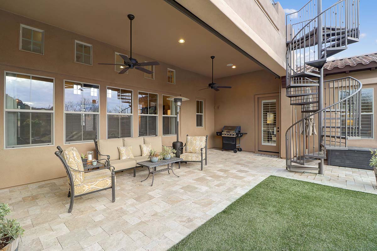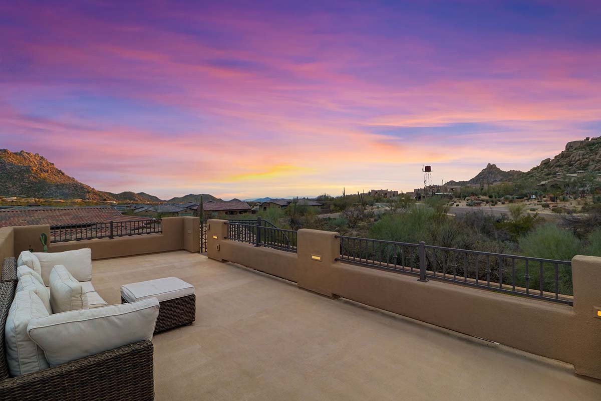 The backyard is a wonder land with artificial turf, symmetrical salt water pool, water fountain feature, covered patio, and a view deck accessed by a spiral staircase to enjoy the mountains views and Arizona sunsets.