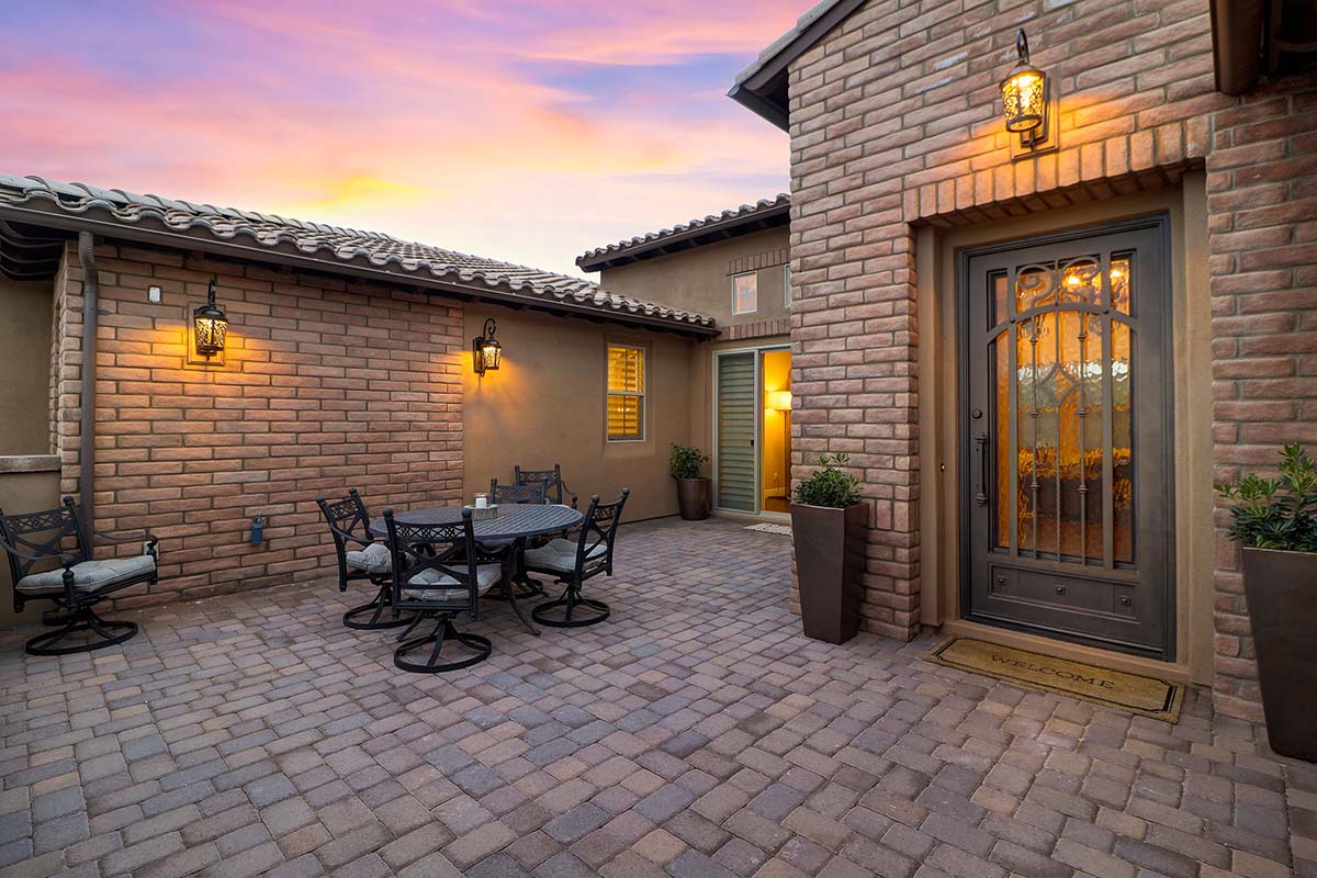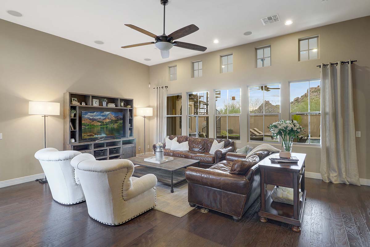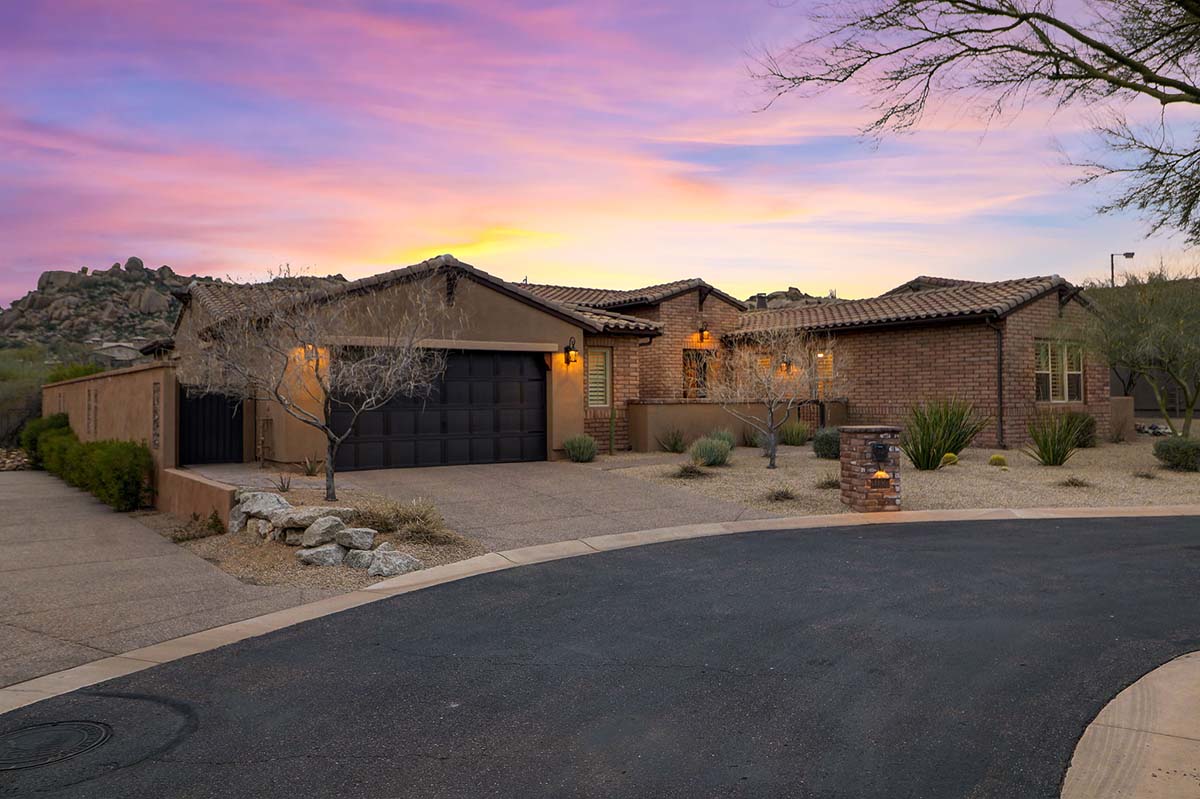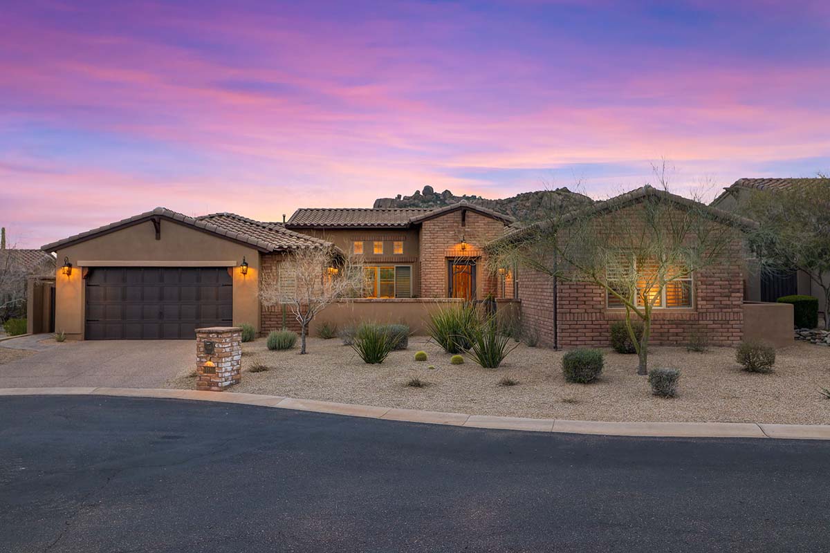This meticulously maintained 2014 build in charming and gated Quisana features a great room floor plan with warm finishes and lots of natural light. The front courtyard allows for additional outdoor living space, accented by a brick entry way finish and direct views of Pinnacle Peak and boulder outcroppings upon entering.