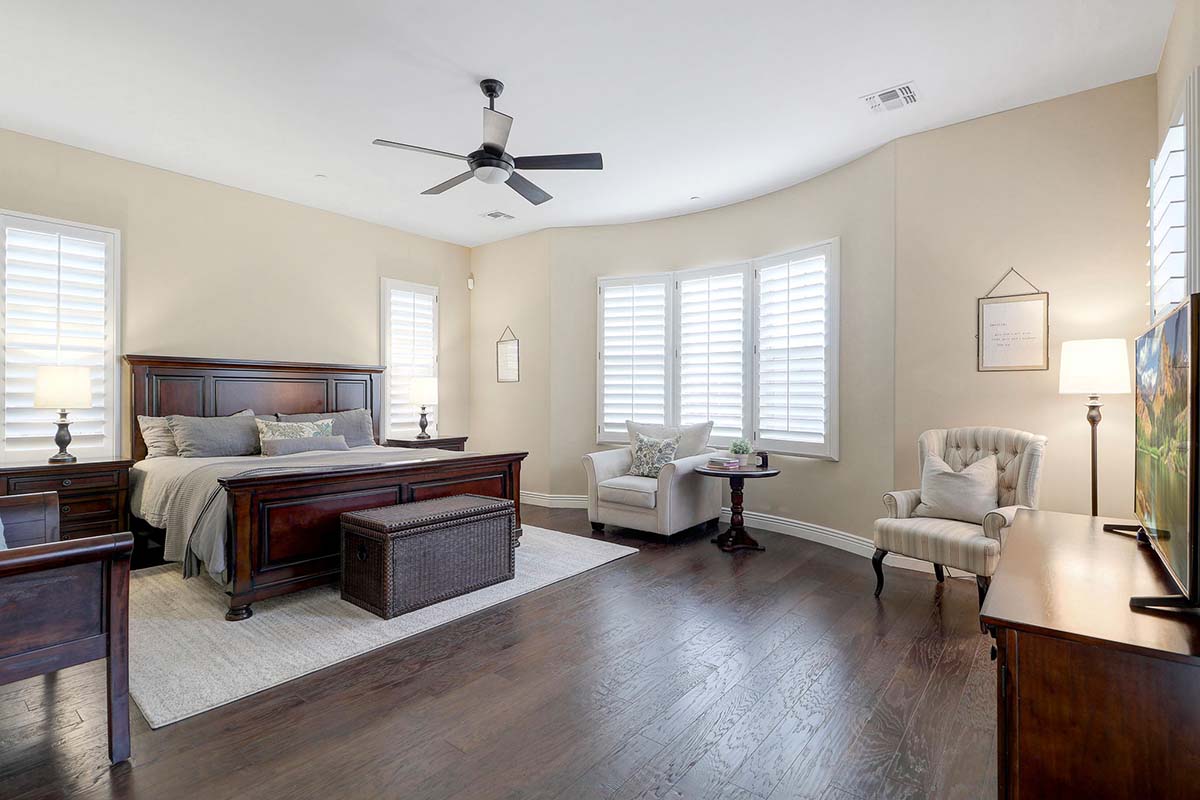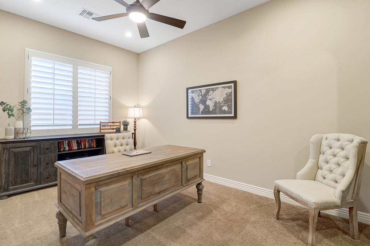 The interior is an open floor plan with the kitchen, dining, and great room all open to each other and featuring a large master ensuite, two additional bedrooms, and a private office/den. Real wood flooring, plantation shutters and shades, name brand appliances, gas cooktop, newly painted exterior, plenty of storage, two car garage, and a front yard maintained by the HOA make this a move-in ready home!