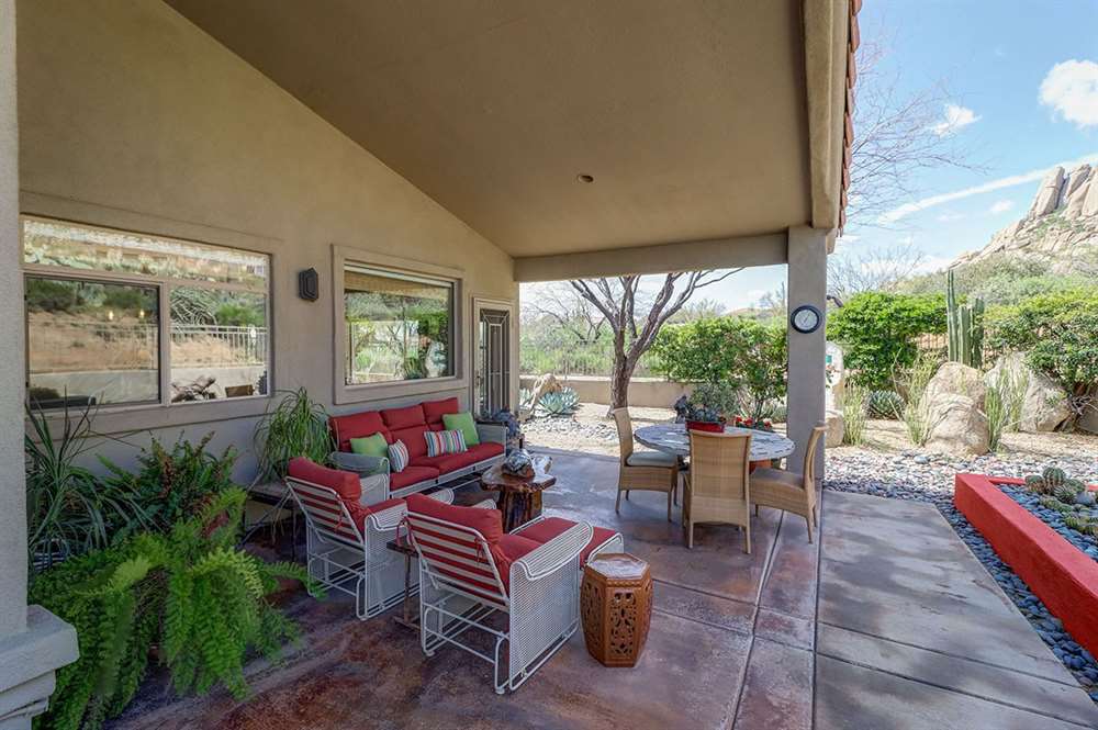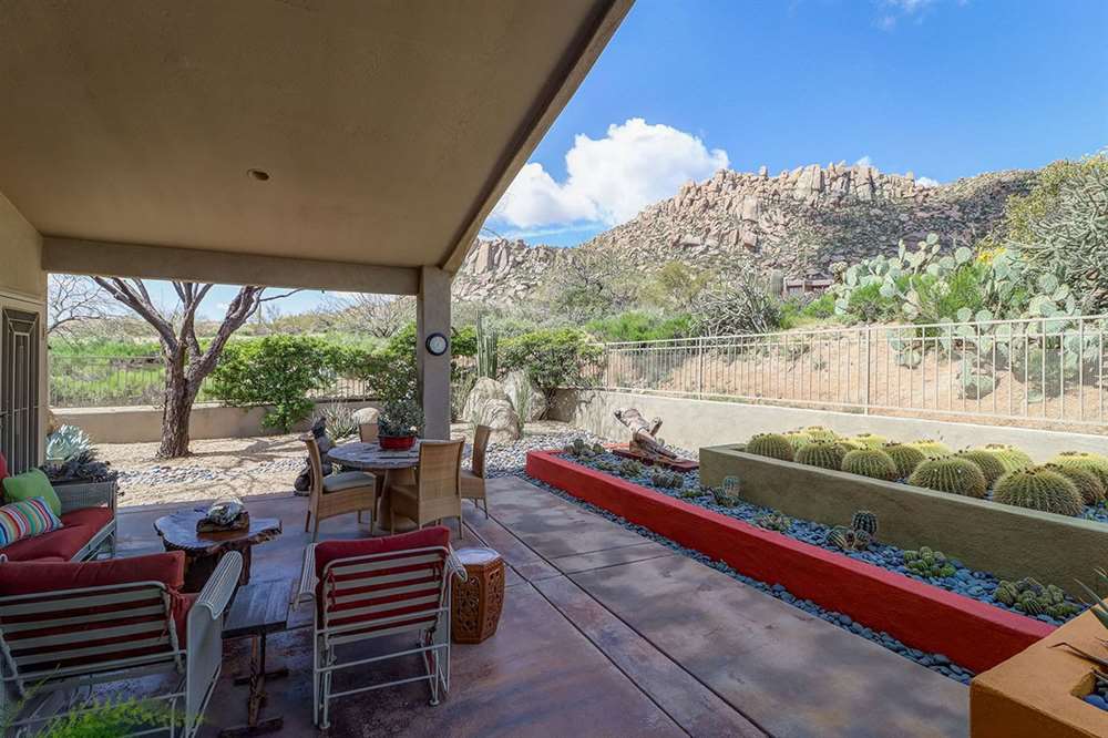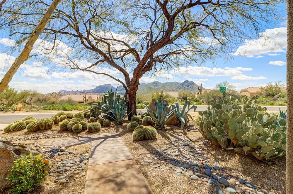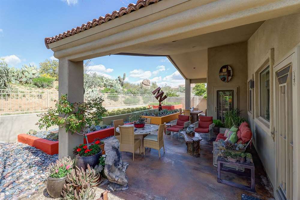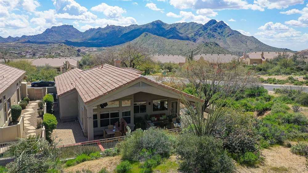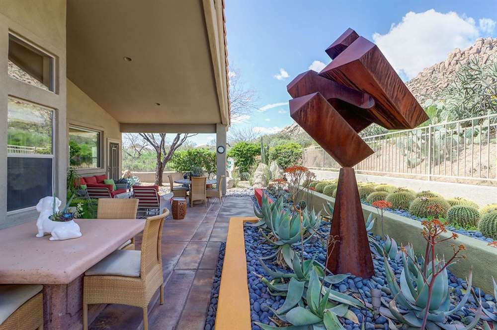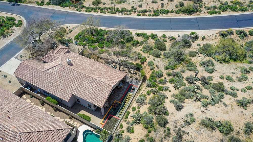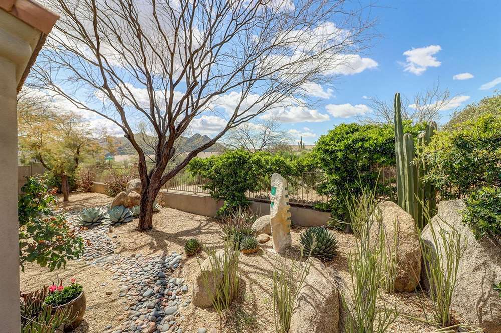 The backyard has an extended covered patio highlighting the mountain views, stained concrete hardscape finish, overlapping cactus and bamboo garden planters, allowing for private backyard setting with no one behind you. Don’t miss out on this Troon Village home!