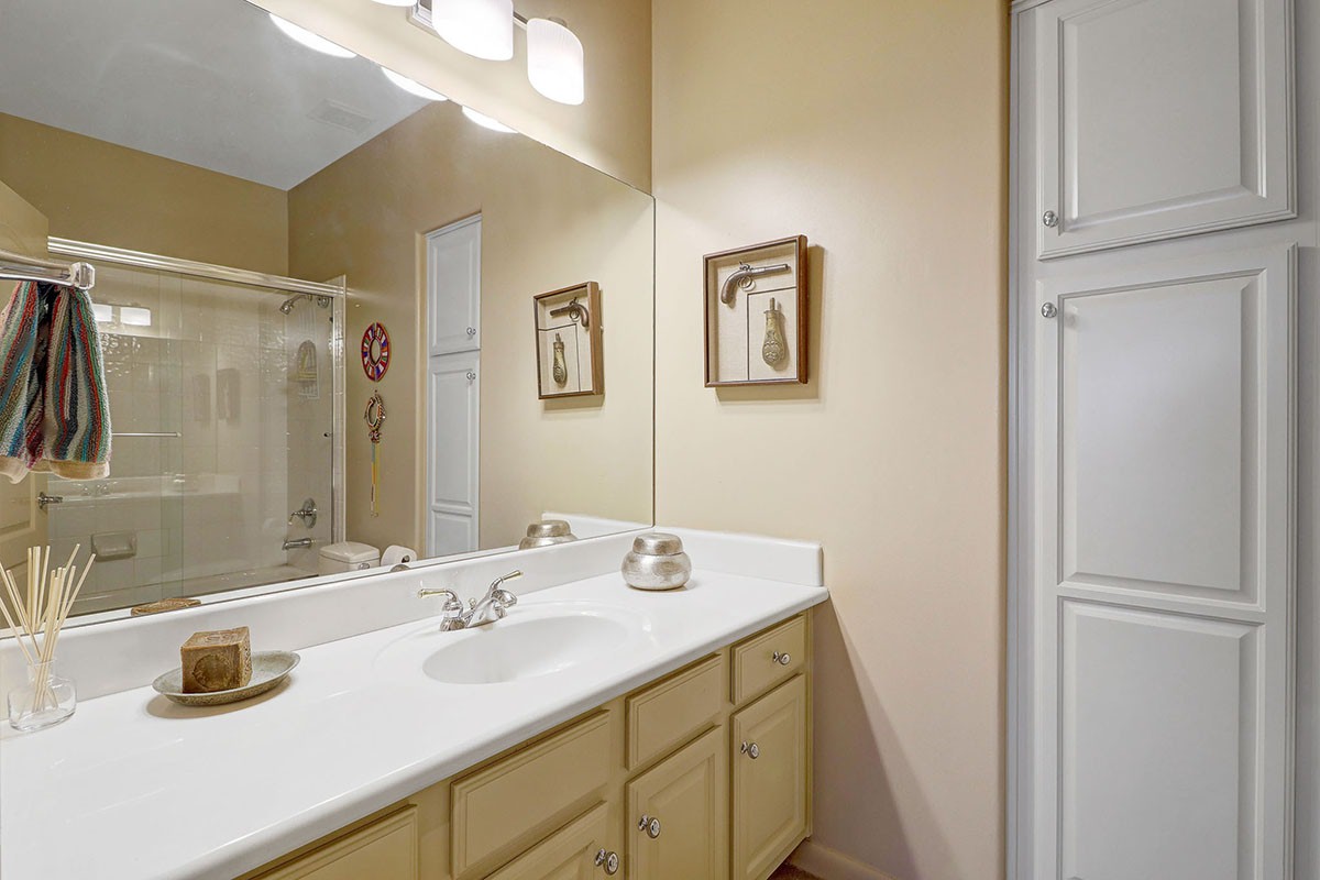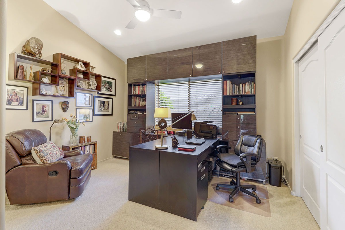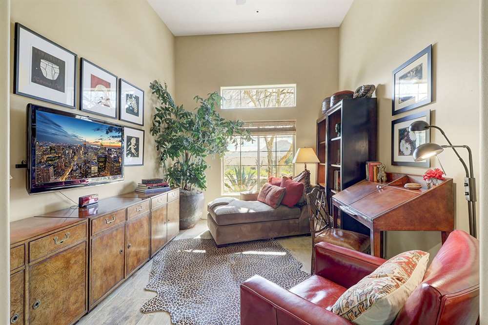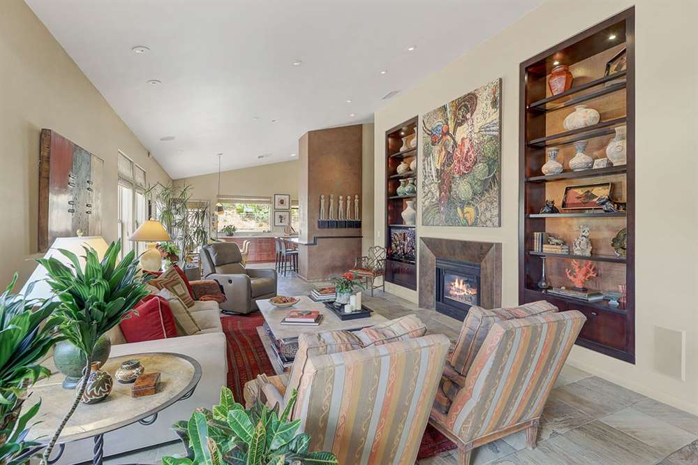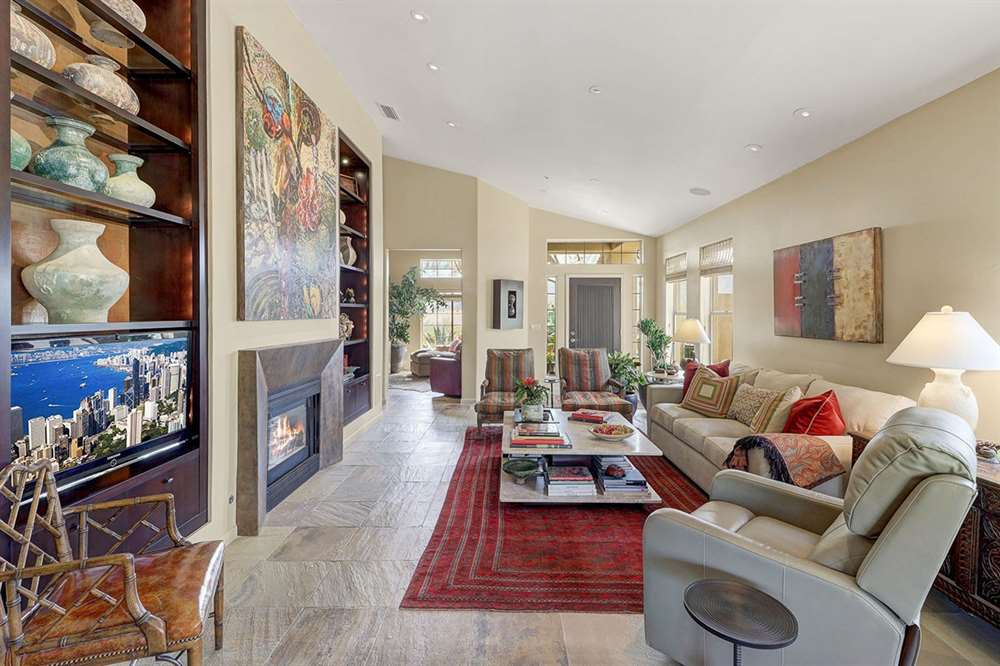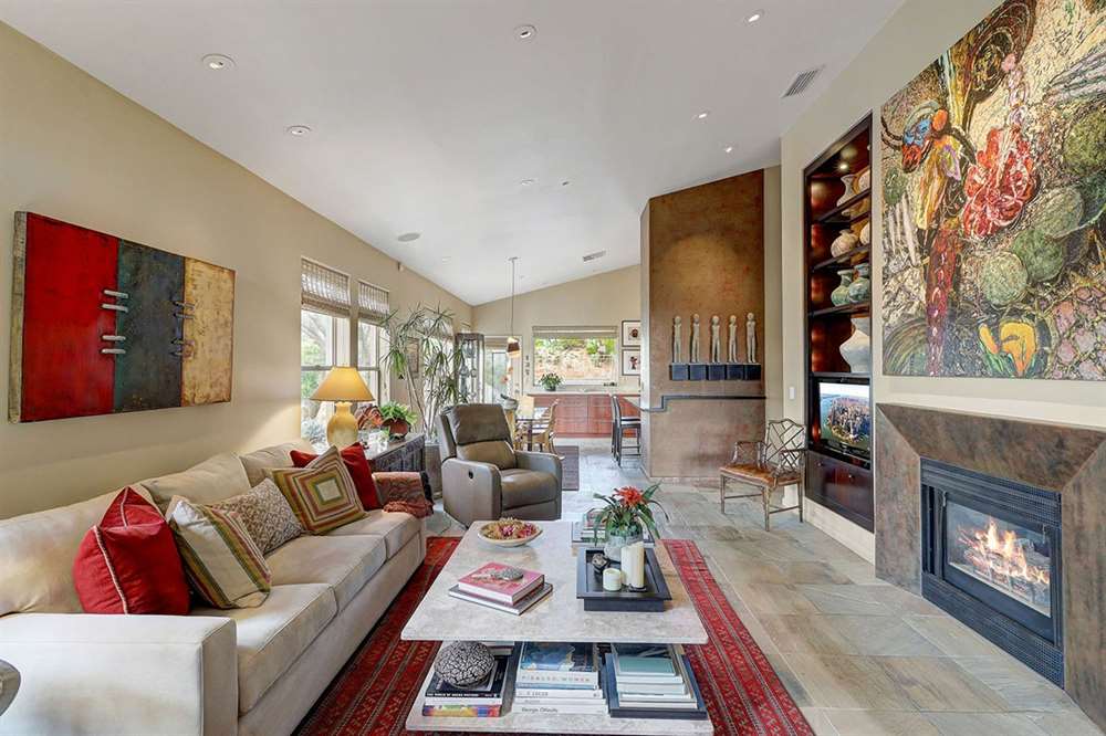 This two bedroom plus den, two and a half bath, 1,840 sq ft home is perfectly sized for year round enjoyment or a lock in leave for seasonal visiting. Upon entering, the great room holds a cozy feel with a centerpiece fireplace, custom wood and glass built-in shelves, natural fossilized sandstone flooring, and vaulted ceilings.