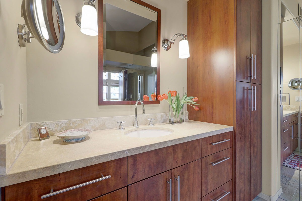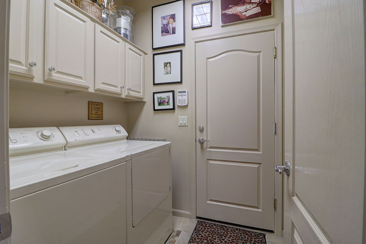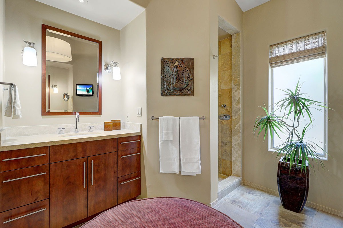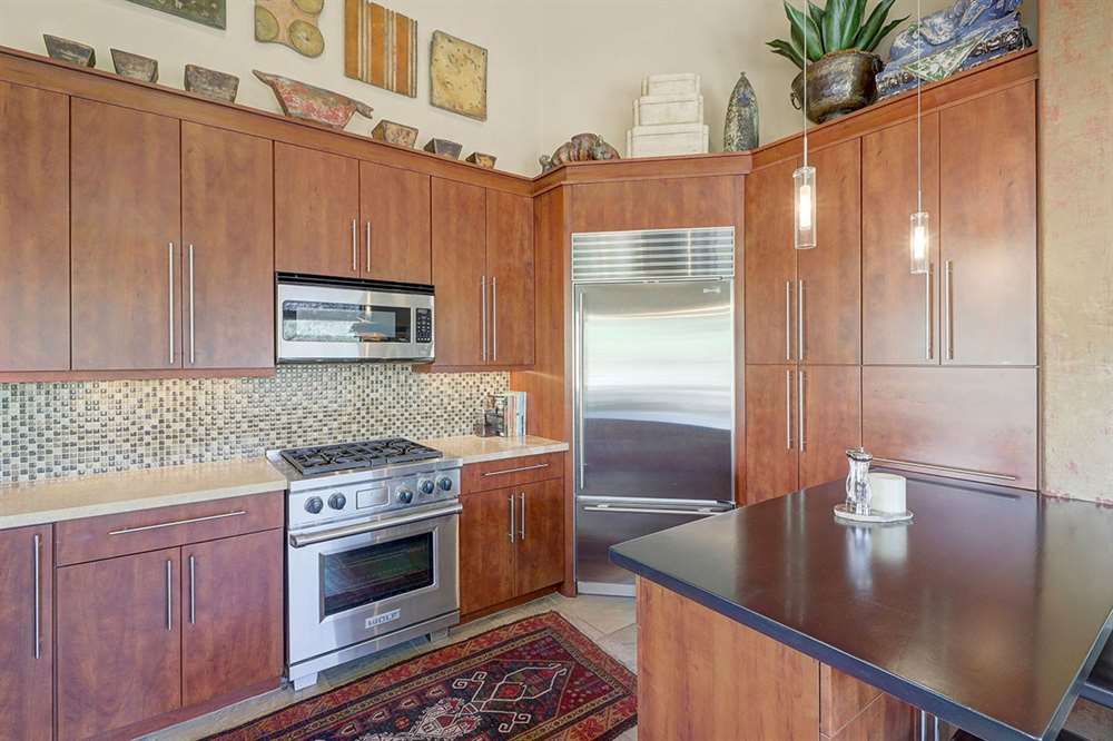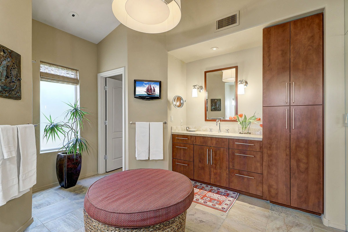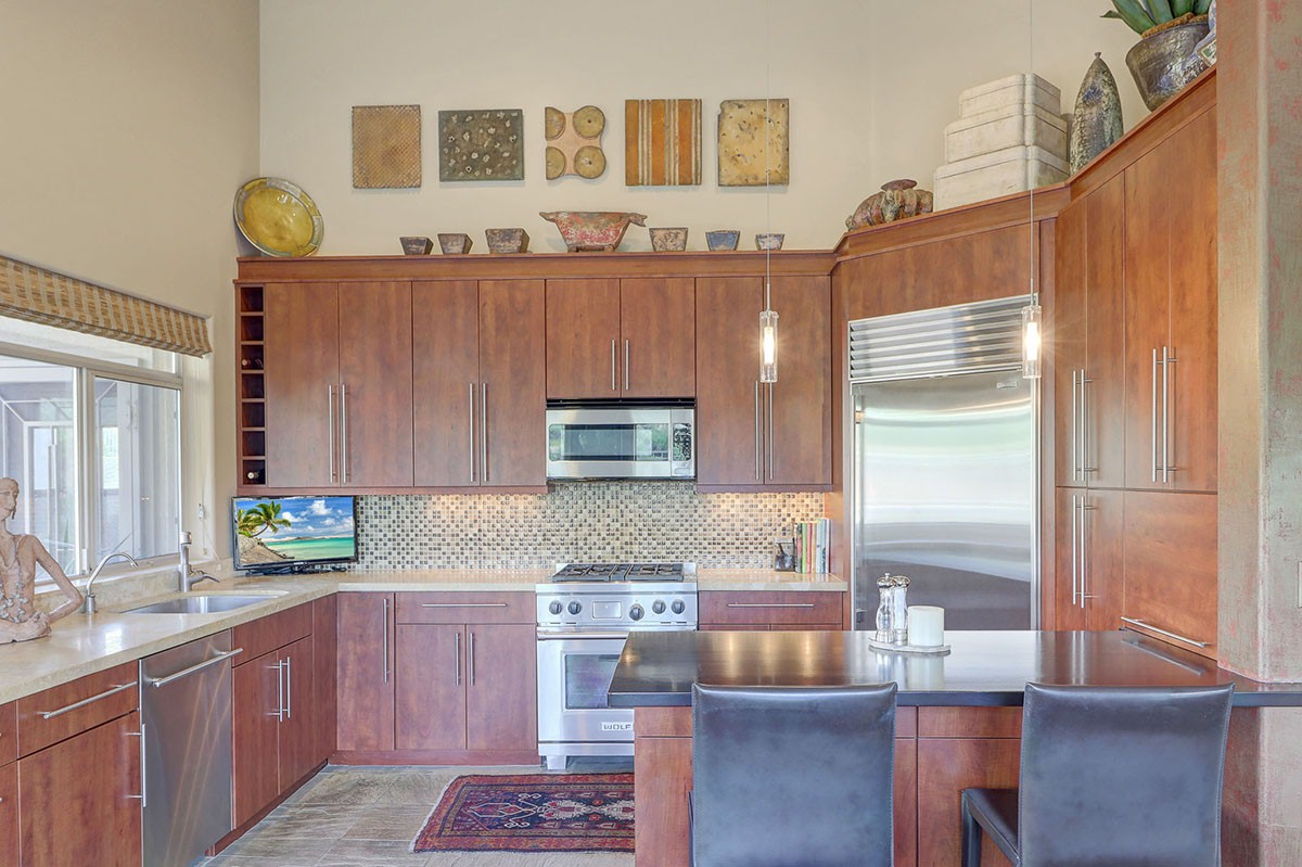 The kitchen is open to the dining room and overlooks the great room for an open feel to this single level floor plan. Features include high-end stainless steel appliances including a Wolf gas range and Sub-Zero fridge, flat panel cabinetry, ample slab limestone counters, tile backsplash, and peninsula with additional seating. The master suite features a consistent theme with transitional finishes, separate vanities, lots of storage, walk-in travertine shower, and exterior access to the rear yard.