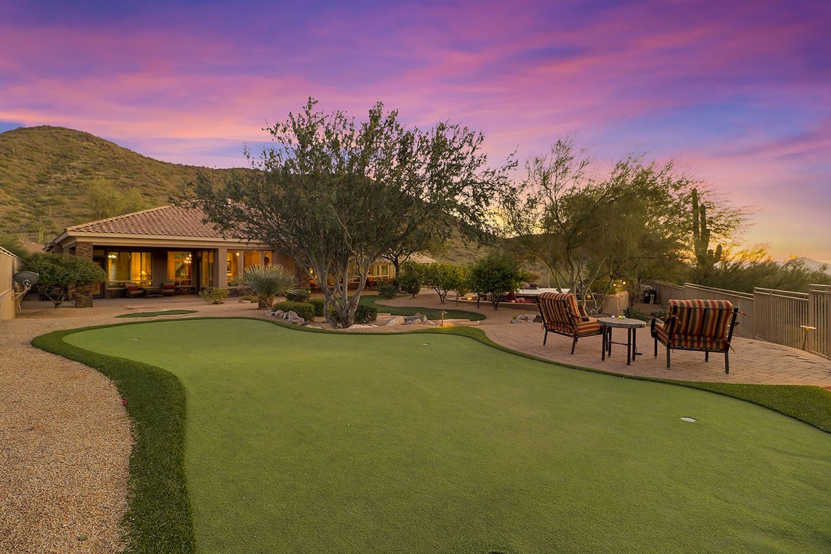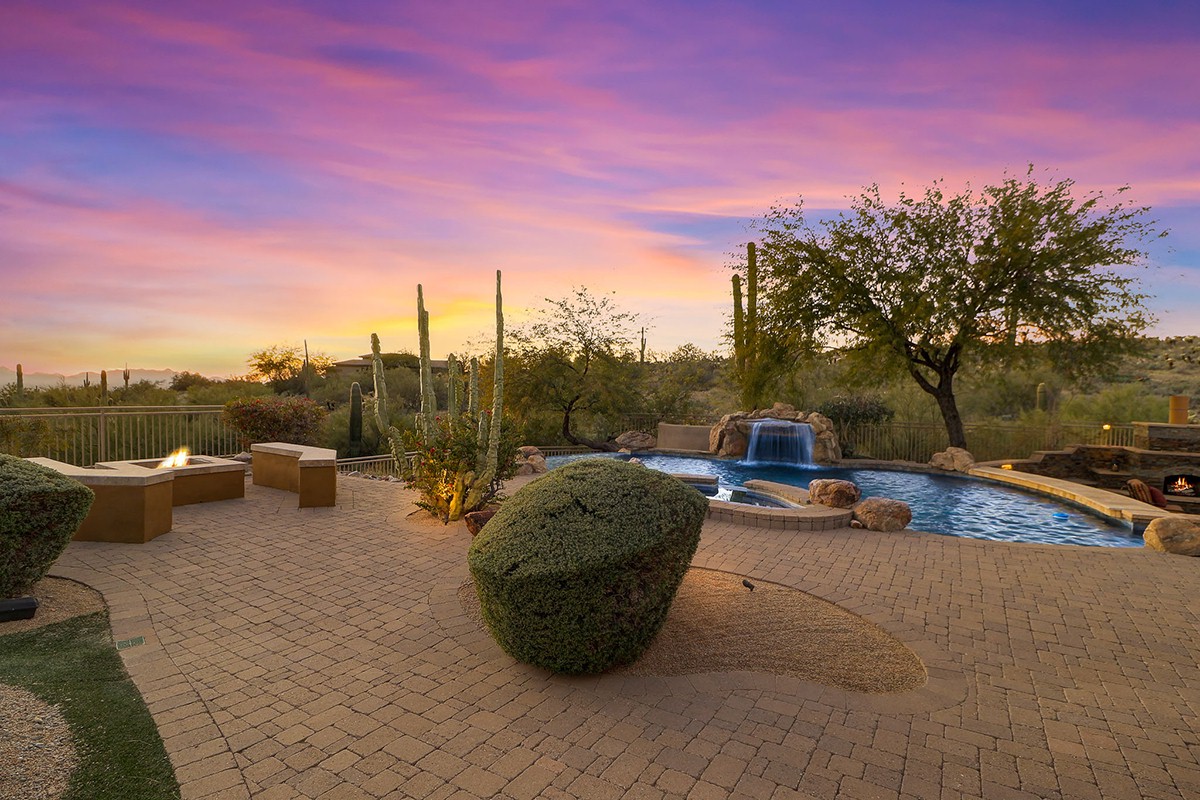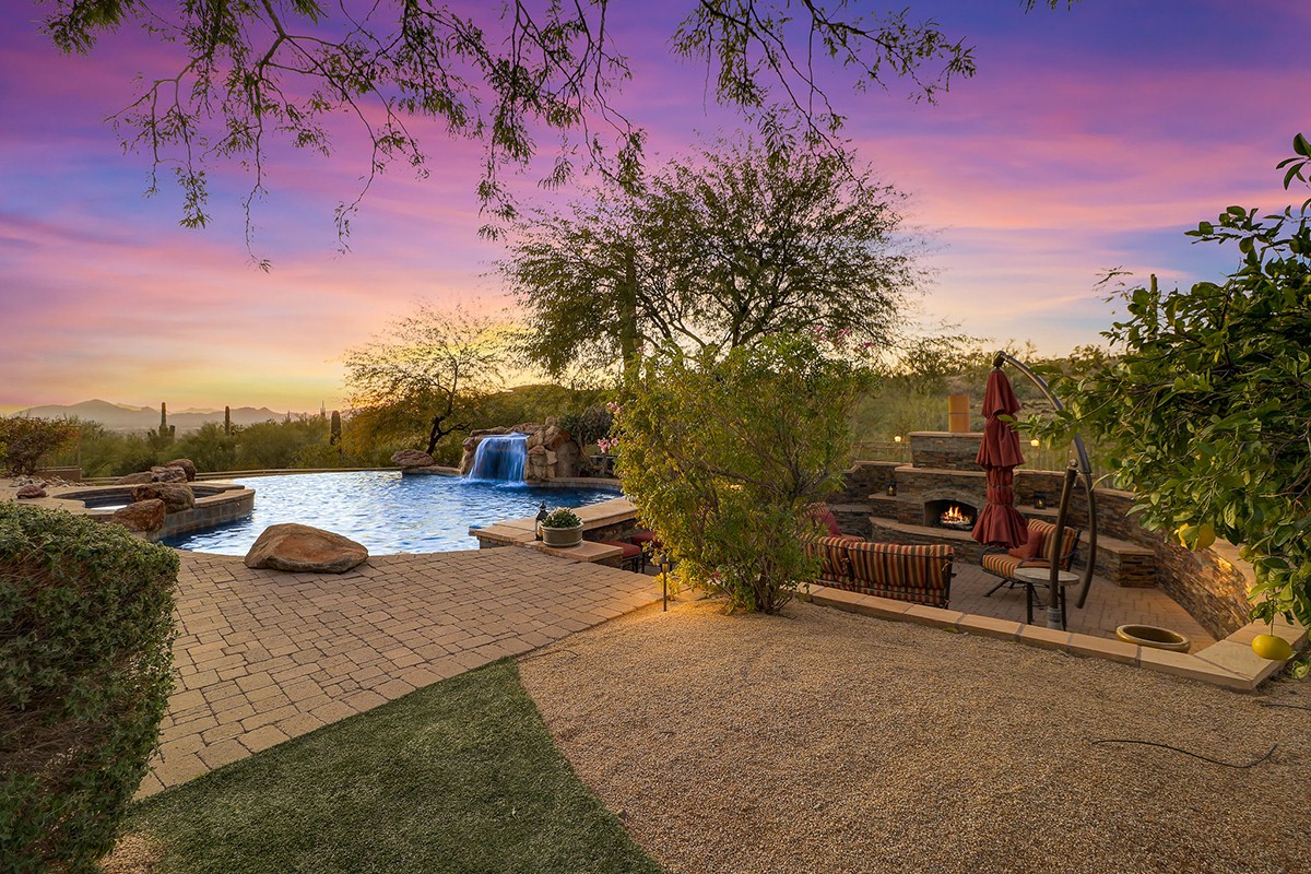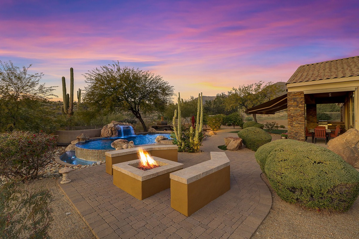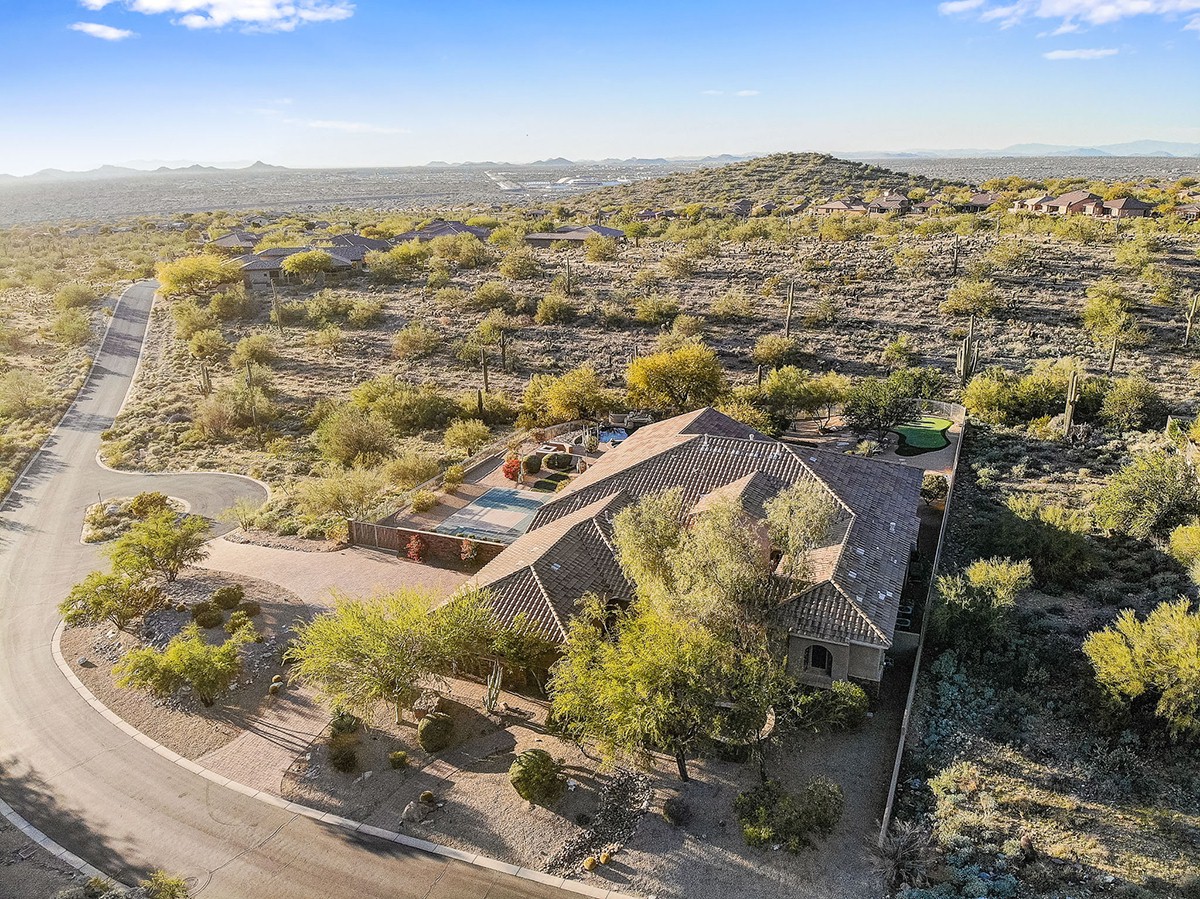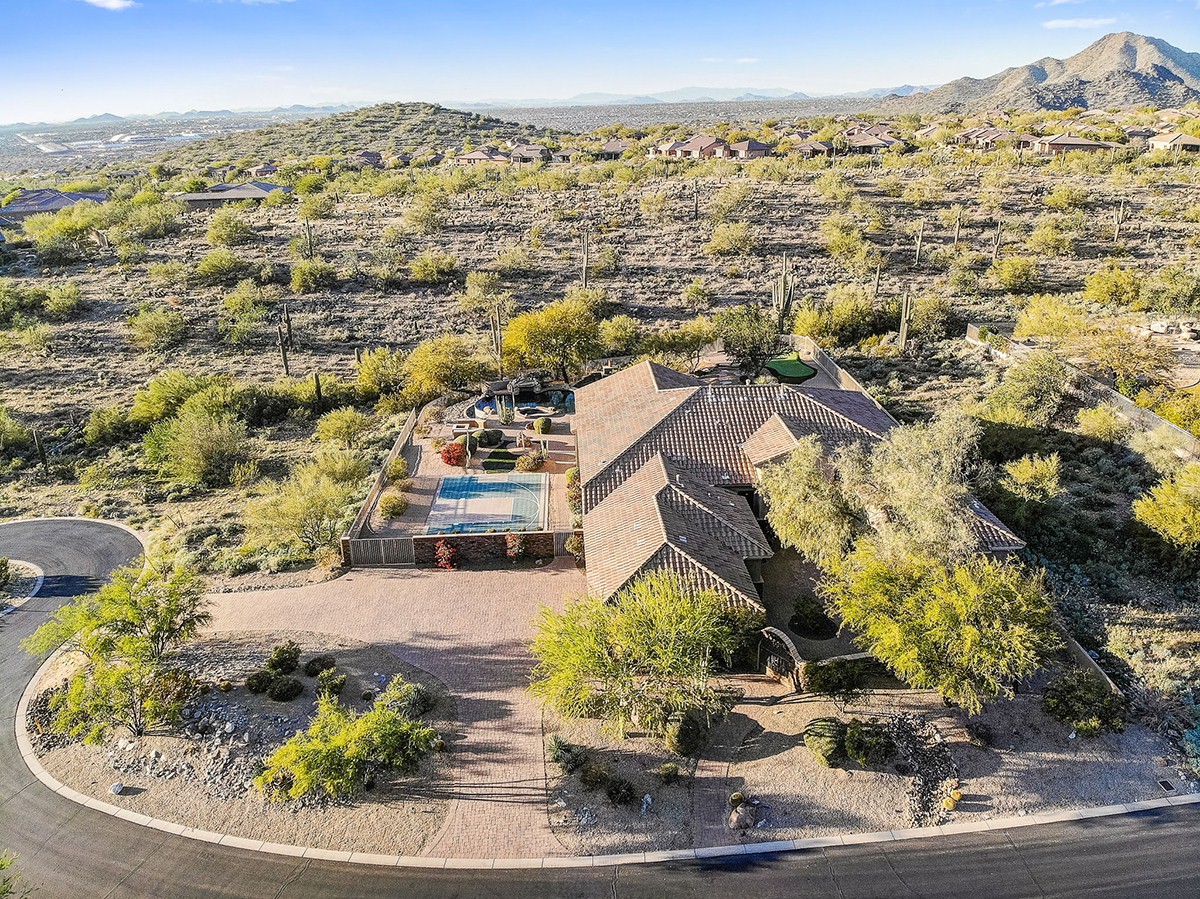 Privacy abounds for this 3,900 plus SF home on a 1.78 acre lot located in the gated Sonoran Estates II at McDowell Mountain Ranch. The outdoor living spaces are perfect for entertaining with tumbled pavers, large covered patio, negative edge pool with waterfall grotto, recessed patio with fireplace and poolside bar seating, sports court, five hole putting green, built-in barbecue, retractable awnings, mature landscaping with lighting, fruit trees, fire pit with built-in seating, numerous lounge and dining area, all with endless views.