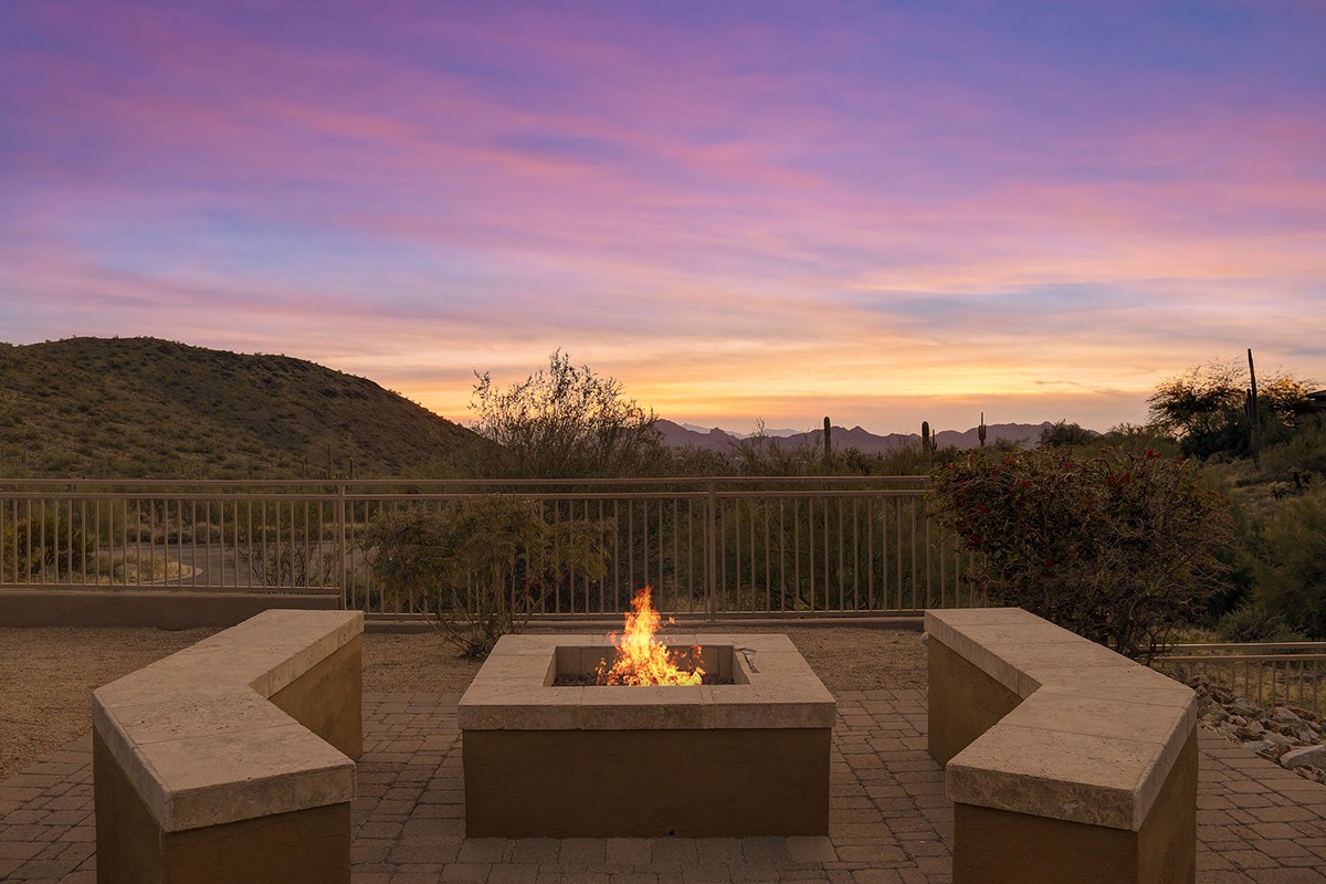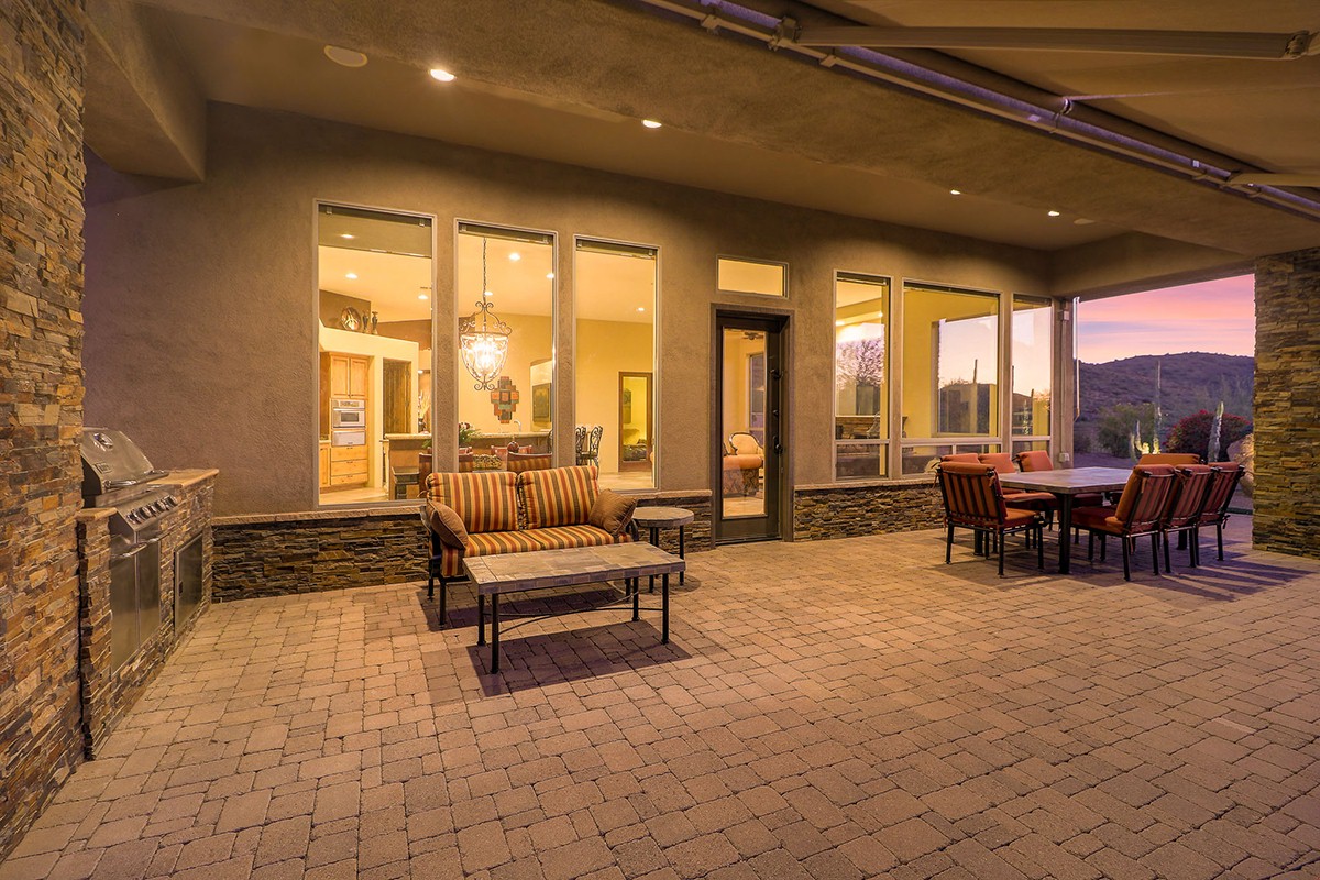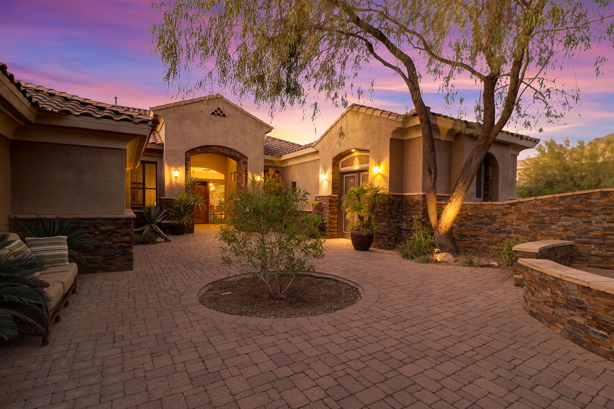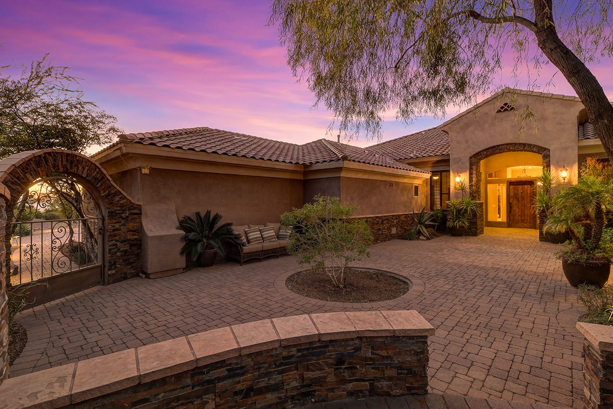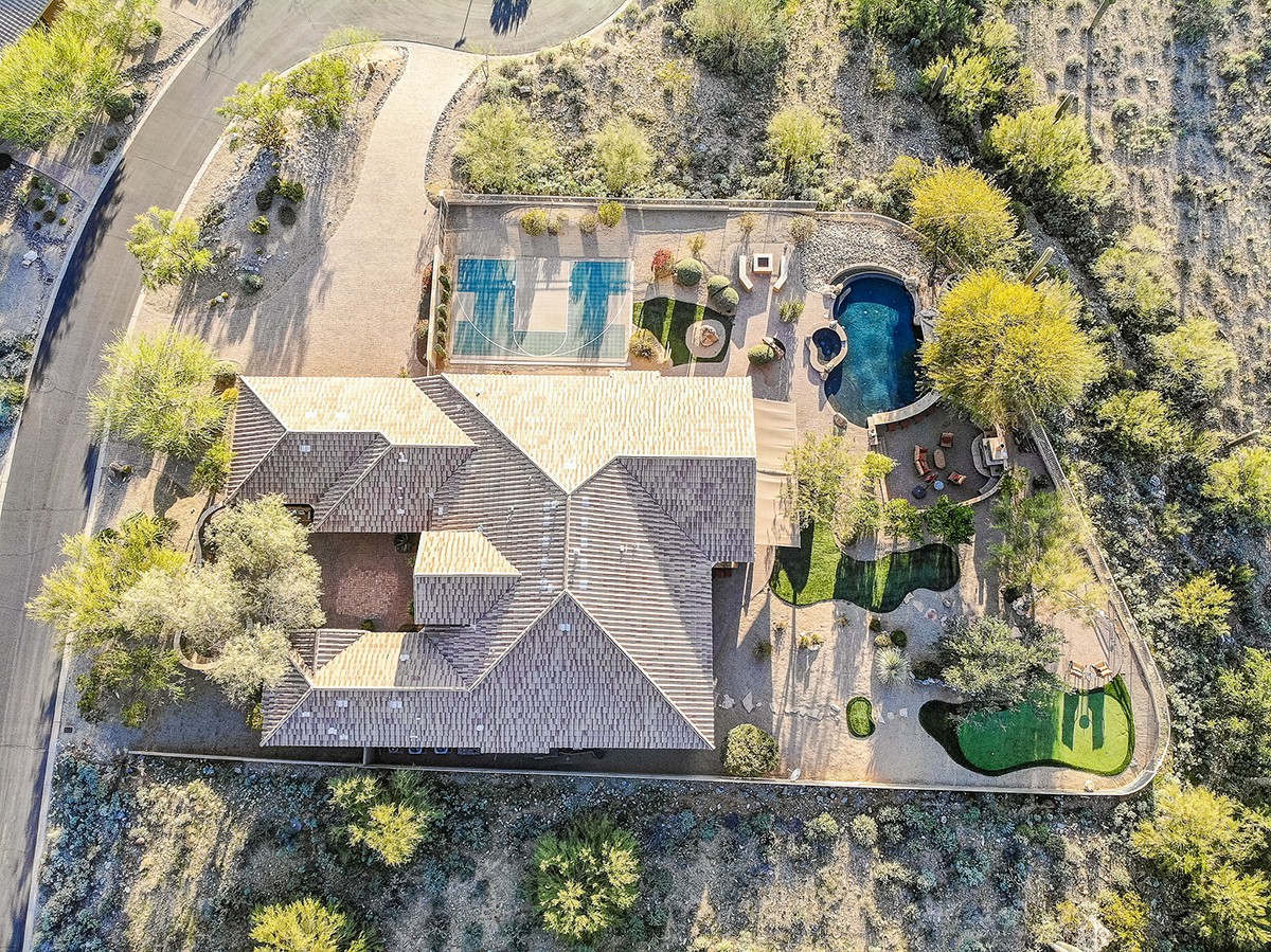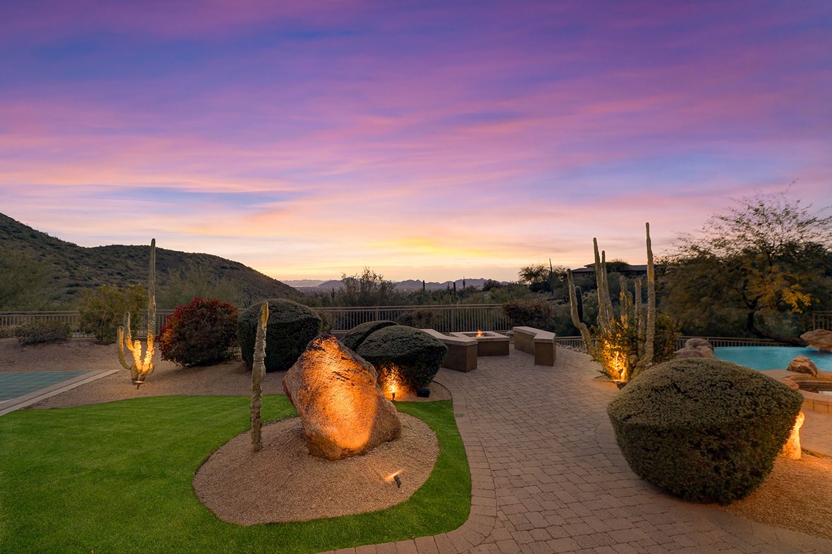 Privacy abounds for this 3,900 plus SF home on a 1.78 acre lot located in the gated Sonoran Estates II at McDowell Mountain Ranch. The outdoor living spaces are perfect for entertaining with tumbled pavers, large covered patio, negative edge pool with waterfall grotto, recessed patio with fireplace and poolside bar seating, sports court, five hole putting green, built-in barbecue, retractable awnings, mature landscaping with lighting, fruit trees, fire pit with built-in seating, numerous lounge and dining area, all with endless views.