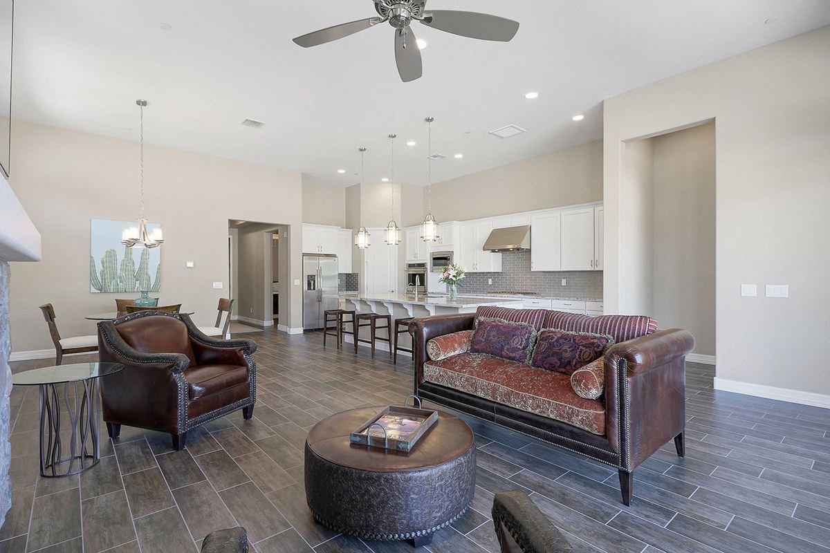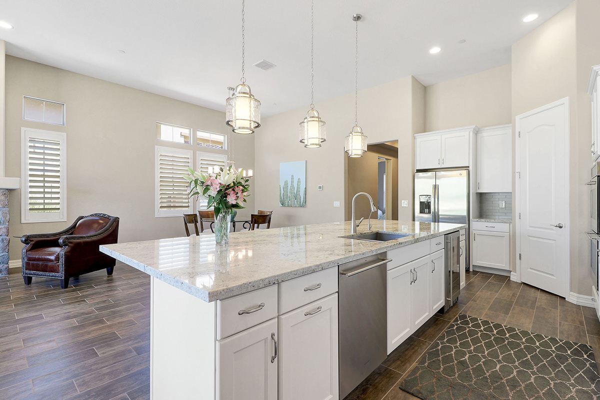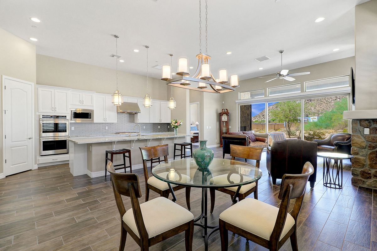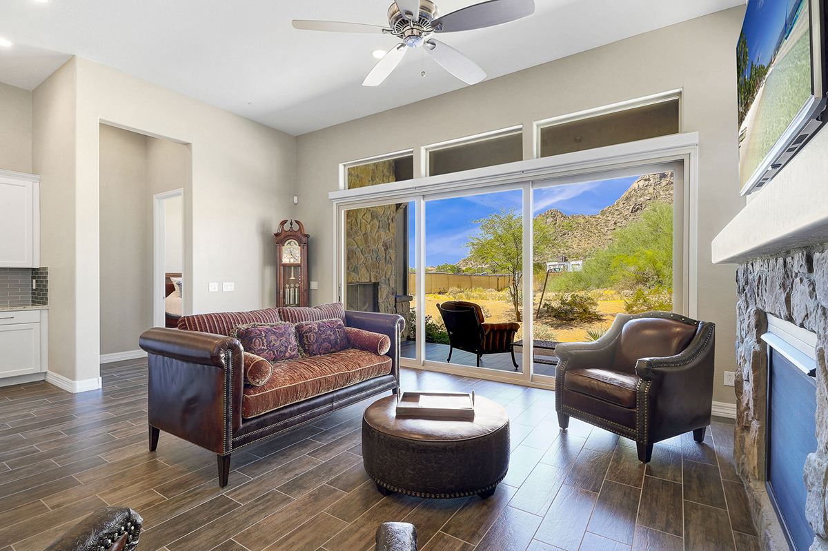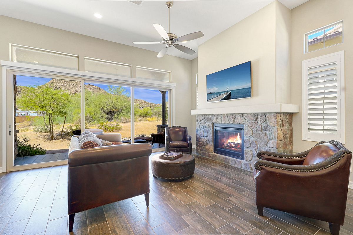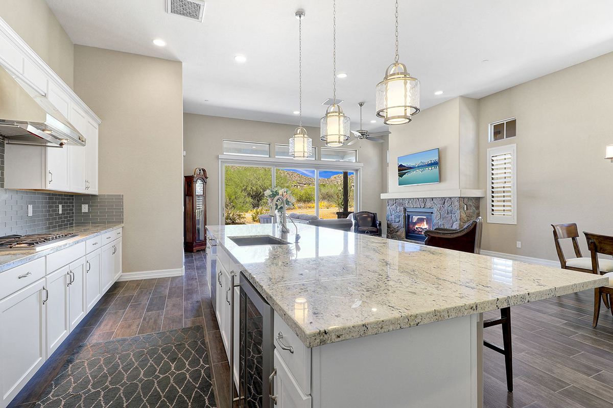 The three panel sliding door brings the outdoors in as it overlooks the charming patio with a cozy fireplace and direct views of Pinnacle Peak. Kitchen amenities include a large center island with countertop seating, under cabinet wine fridge, walk-in pantry, granite counters, glass tile backsplash, stainless steel appliance package, and pendant accent lighting.