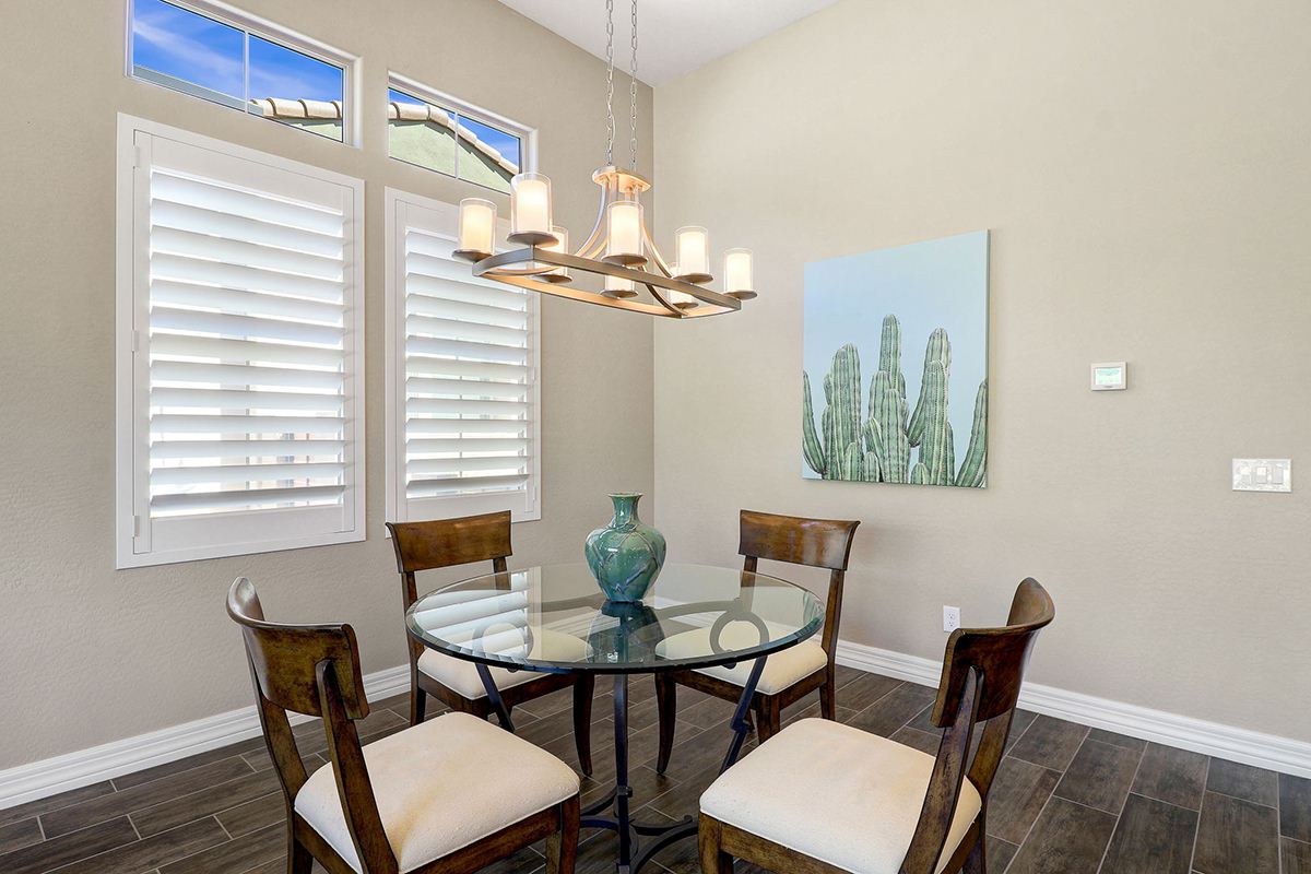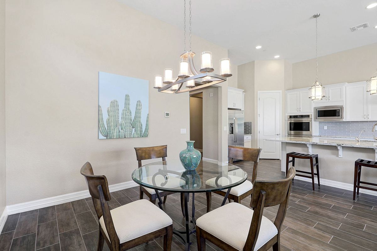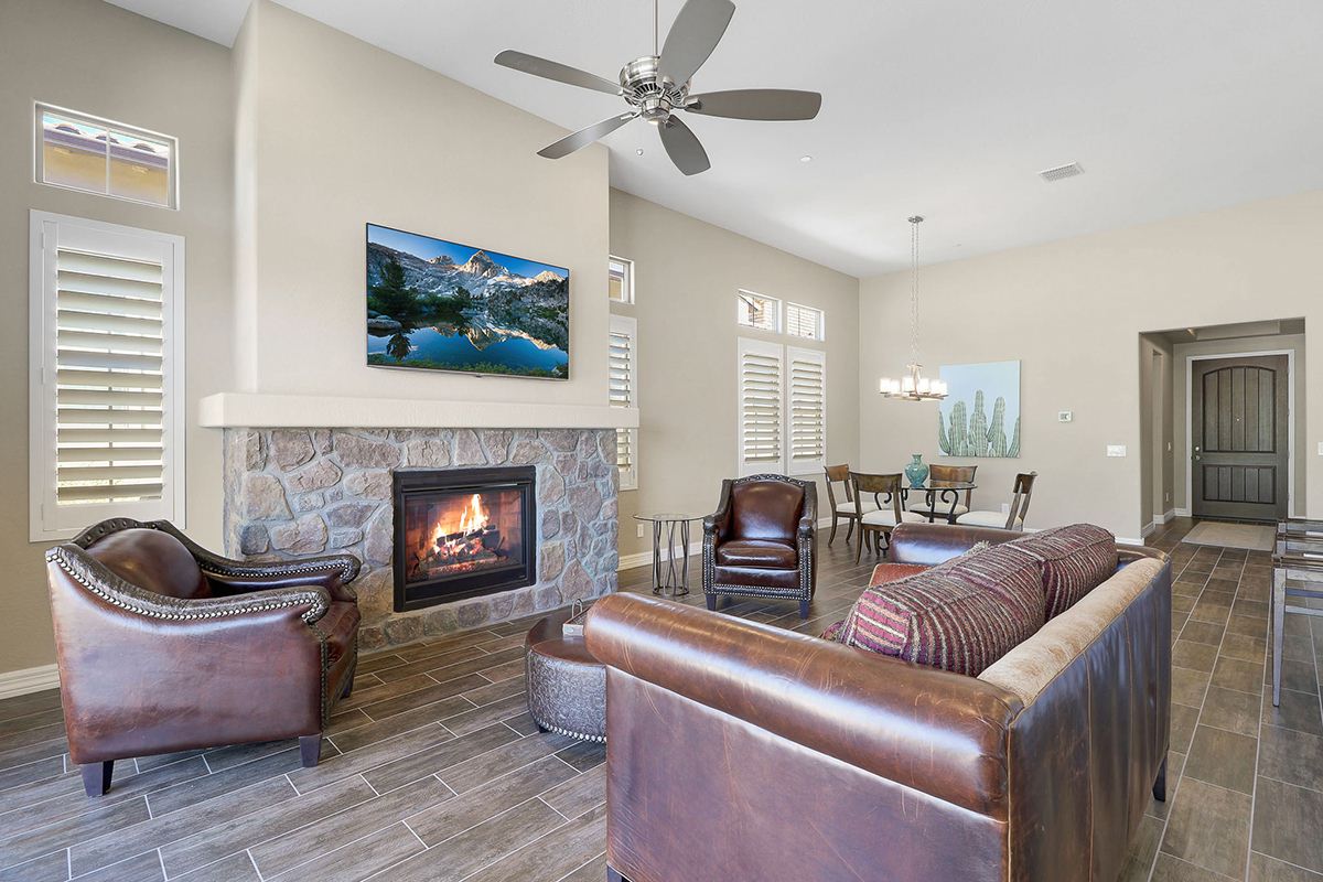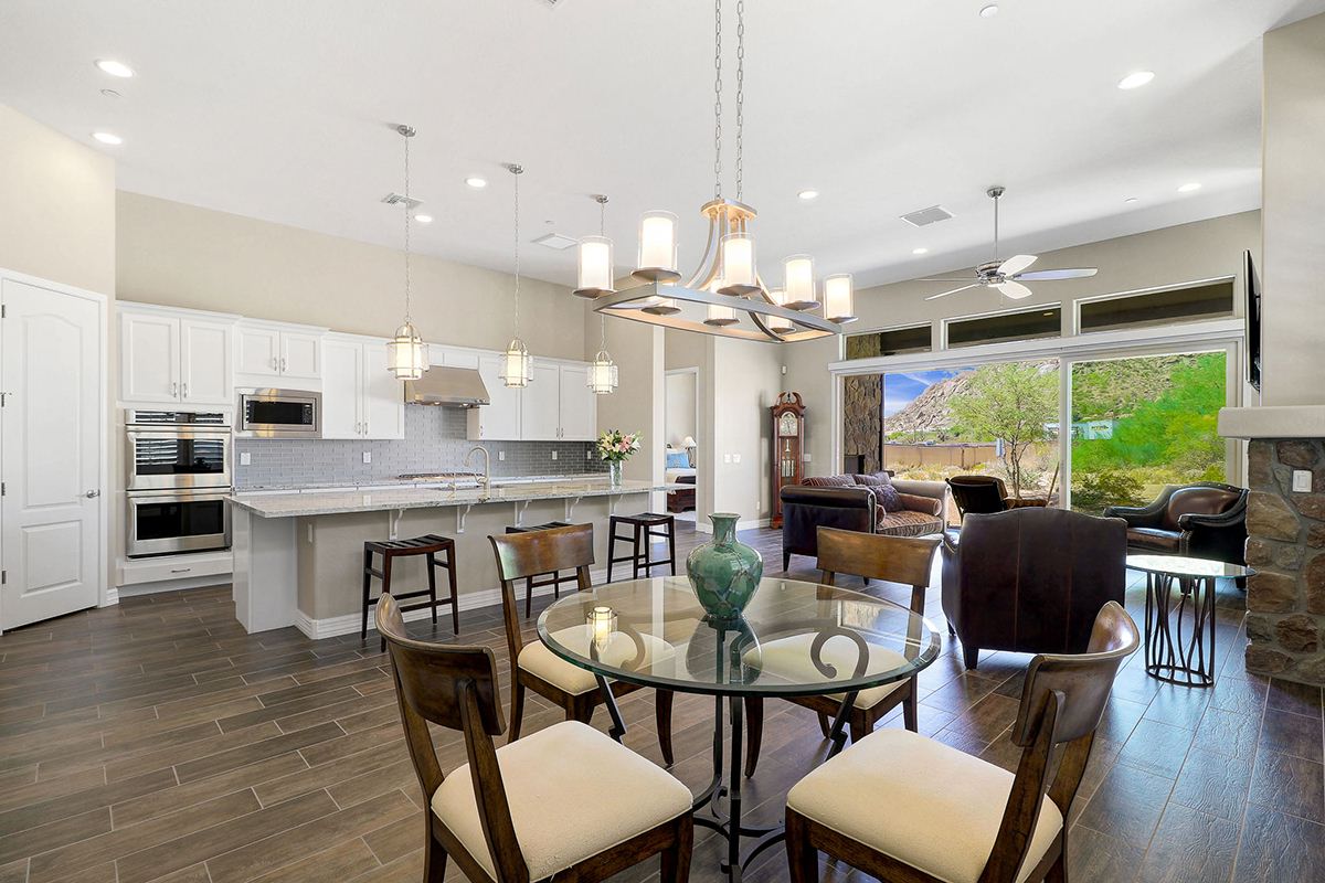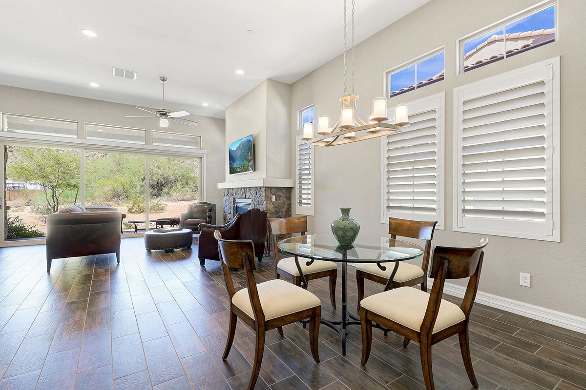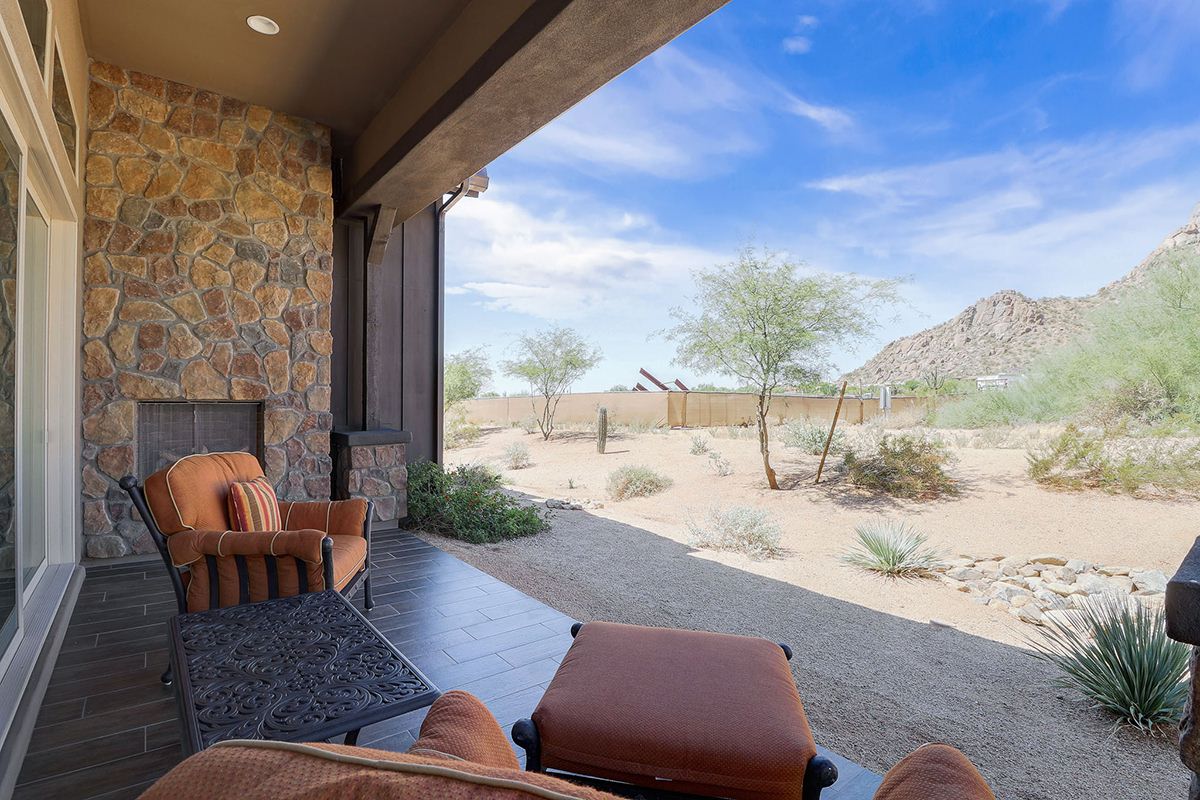The single-level great room floor plan inspires tranquility with the on-trend neutral color palette and stone fire place. The three panel sliding door brings the outdoors in as it overlooks the charming patio with a cozy fireplace and direct views of Pinnacle Peak. Kitchen amenities include a large center island with countertop seating, under cabinet wine fridge, walk-in pantry, granite counters, glass tile backsplash, stainless steel appliance package, and pendant accent lighting.