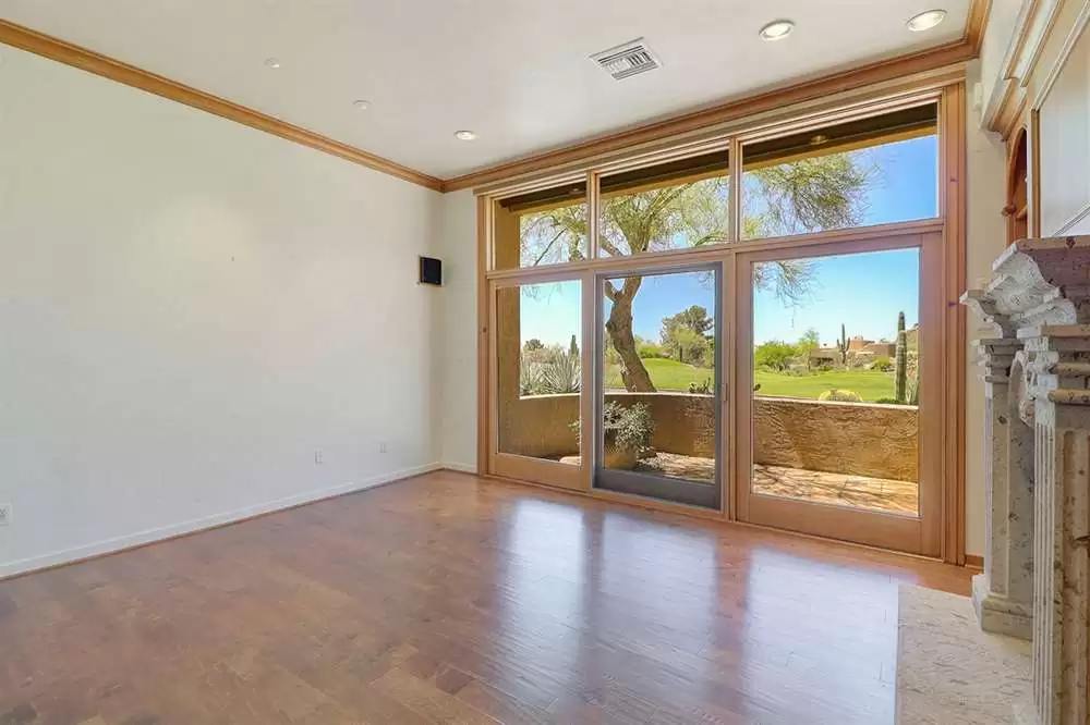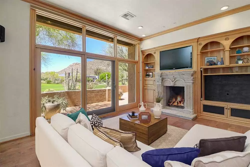 The main living area is an open concept with a family room with grand fireplace and three-panel sliding door, office with exterior access and fireplace, kitchen with beautiful cabinetry, granite counters, adjacent laundry and pantry, all surrounding the dining room under the vaulted ceilings. The master suite also features a large sitting/TV room with built-in entertainment center, canterra fireplace and art shelving and spectacular golf and mountain views.