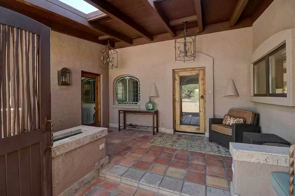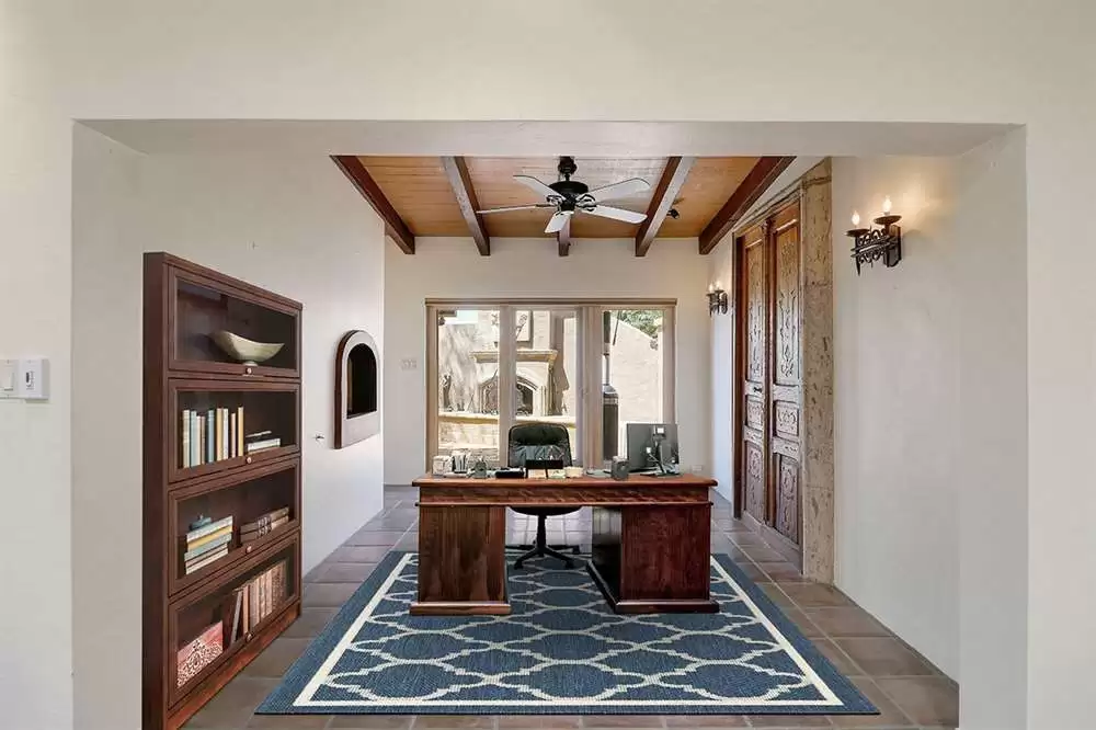 Other highlights include: motorized awnings in the office, family and master bedrooms, one-car garage with a secondary golf cart garage, stained glass windows in the entryway, large circular driveway for additional parking, water fountains in both the front courtyard and rear yard, mature desert landscaping on a corner lot, stained concrete floors in the bonus room and hardwood in the master bed and sitting room, and easy access to the golf cart path and walking distance to the community pool with clubhouse.