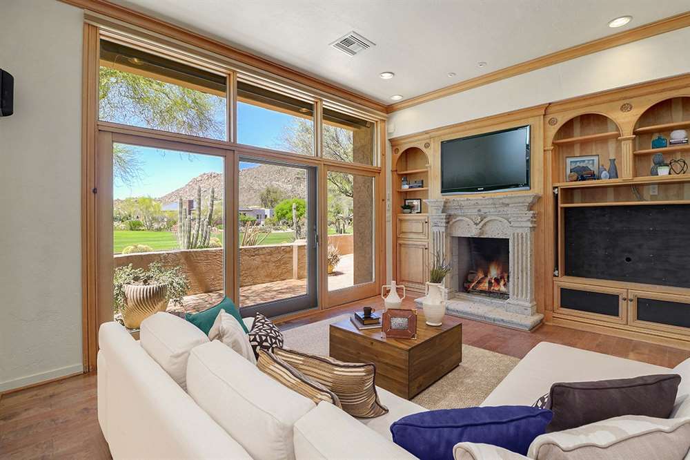 The main living area is an open concept with a family room with grand fireplace and three-panel sliding door, office with exterior access and fireplace, kitchen with beautiful cabinetry, granite counters, adjacent laundry and pantry, all surrounding the dining room under the vaulted ceilings. The master suite also features a large sitting/TV room with built-in entertainment center, canterra fireplace and art shelving and spectacular golf and mountain views.