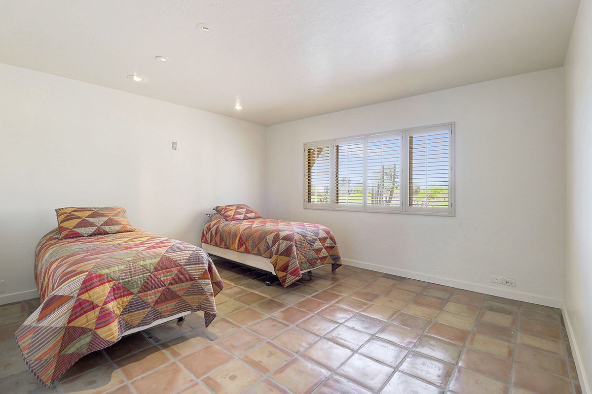 Other highlights include: motorized awnings in the office, family and master bedrooms, one-car garage with a secondary golf cart garage, stained glass windows in the entryway, large circular driveway for additional parking, water fountains in both the front courtyard and rear yard, mature desert landscaping on a corner lot, stained concrete floors in the bonus room and hardwood in the master bed and sitting room, and easy access to the golf cart path and walking distance to the community pool with clubhouse.