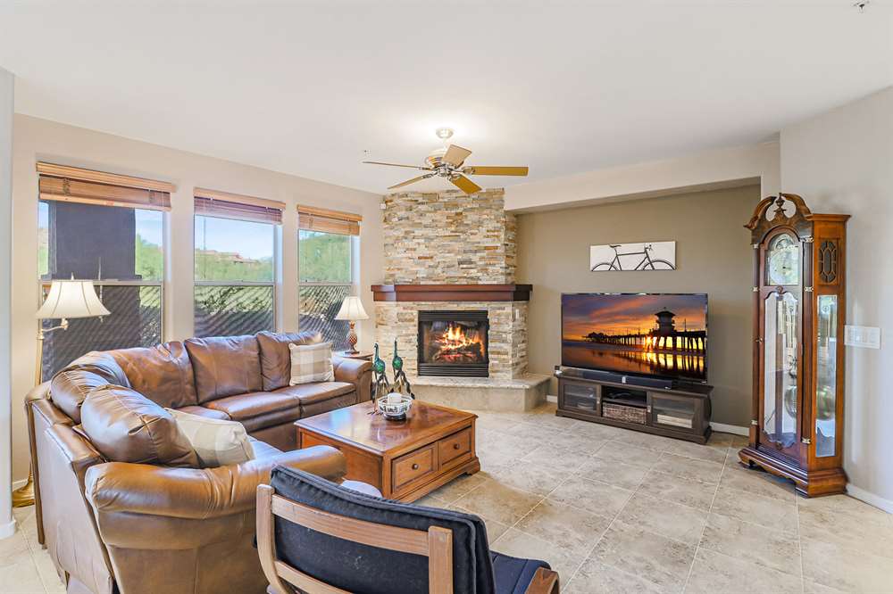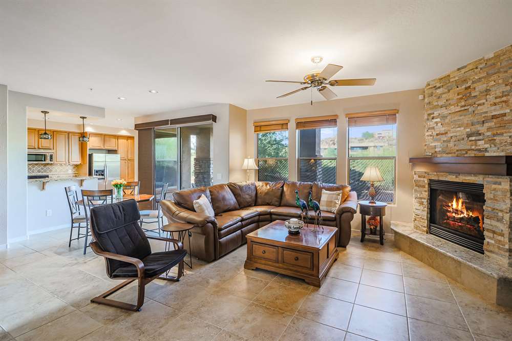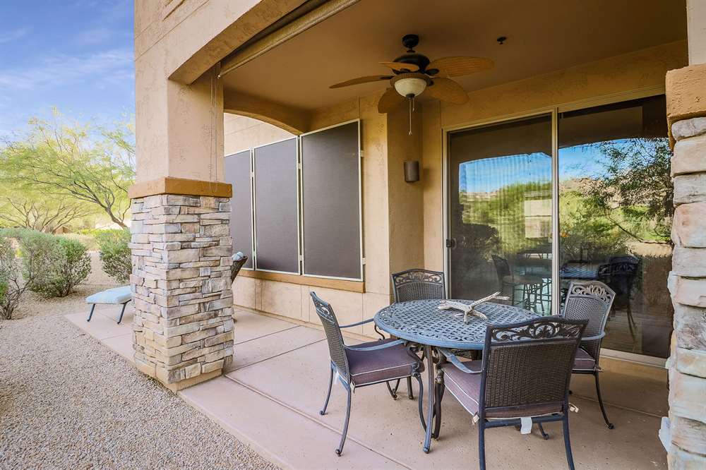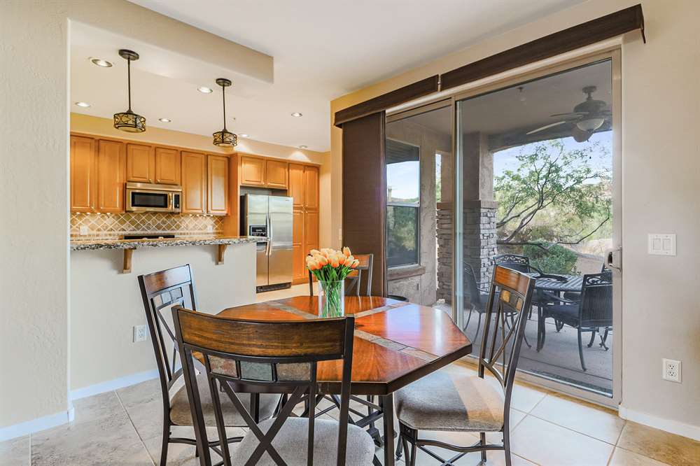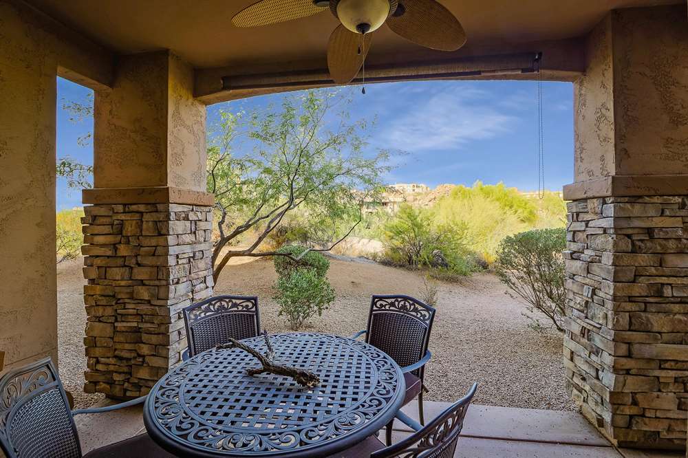 Direct entry from the 1.5-car tandem garage into the well-sized laundry room. The open floor plan allows for seamless entertaining with sliding doors leading to the charming patio that backs to the 1st Fairway of Troon North’s Monument course.