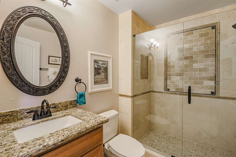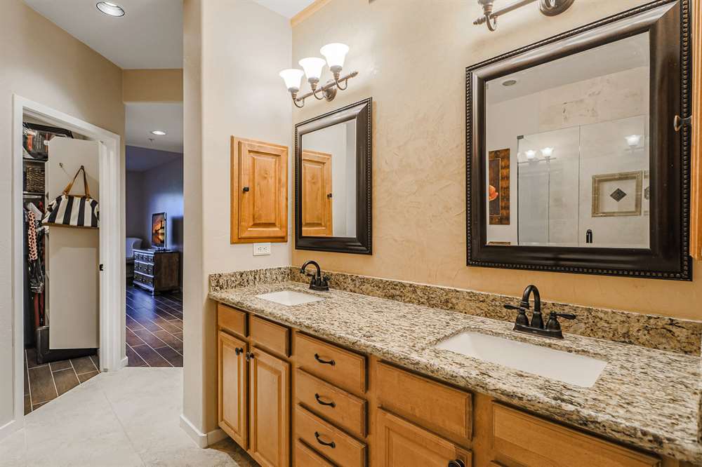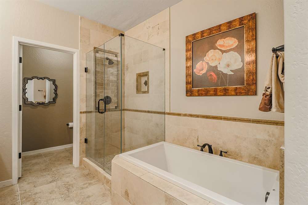 The master bedroom is large with a separate soaking tub and frameless shower, private water closet, dual sinks and a walk-in closet.