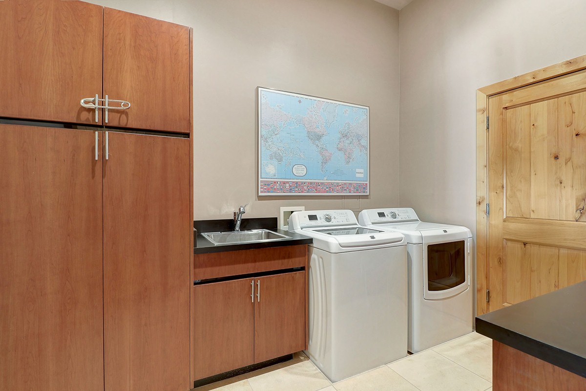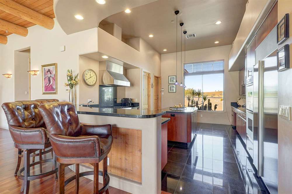 The kitchen has flat panel cabinetry, large center prep island, gas cooktop, double Dacor wall ovens, Sub-Zero side-by-side fridge, stunning black tile floors and granite counters, and opens to the large great room with gas fireplace and multiple doors open to the back patio for seamless entertaining. Once out back enjoy the heated pebble finish pool and spa, Saltillo hardscape, multiple lounge and dining areas, and the direct views of the course and mountains.