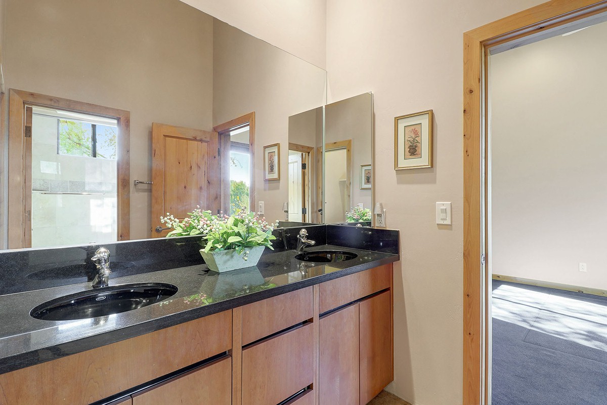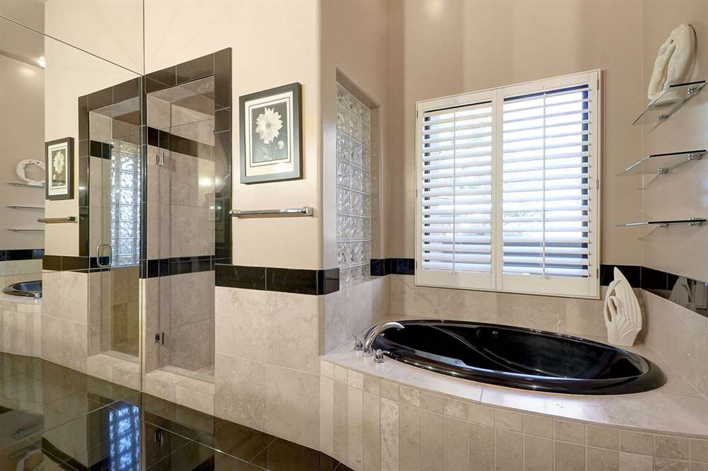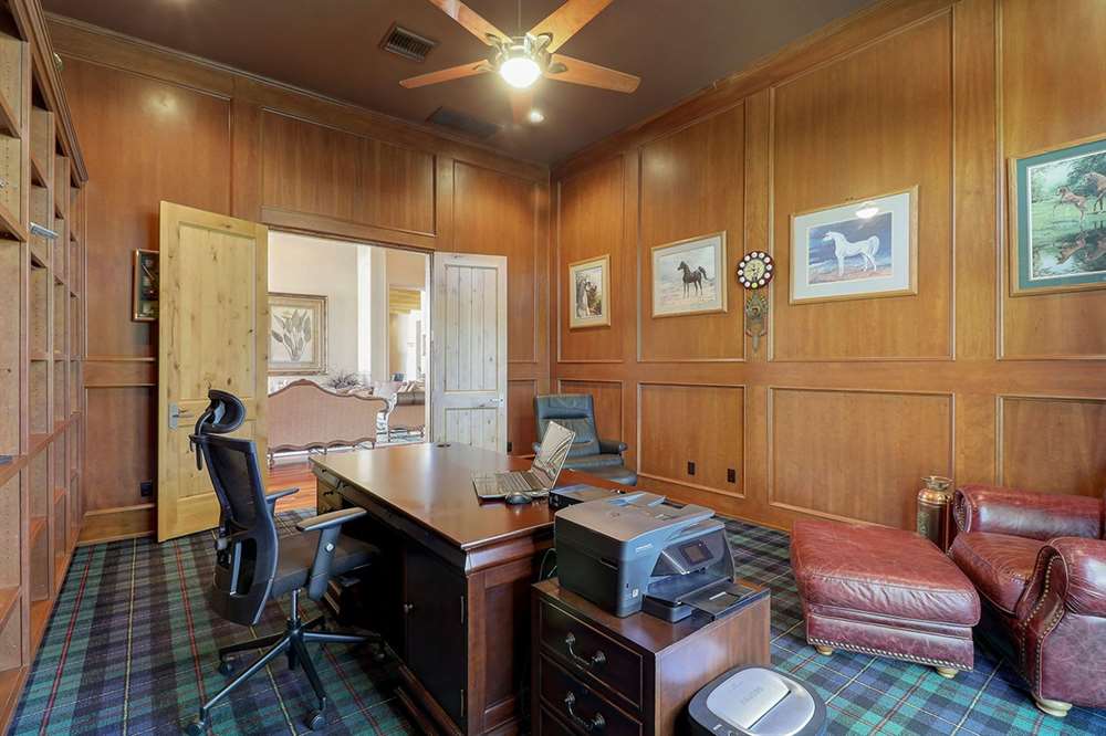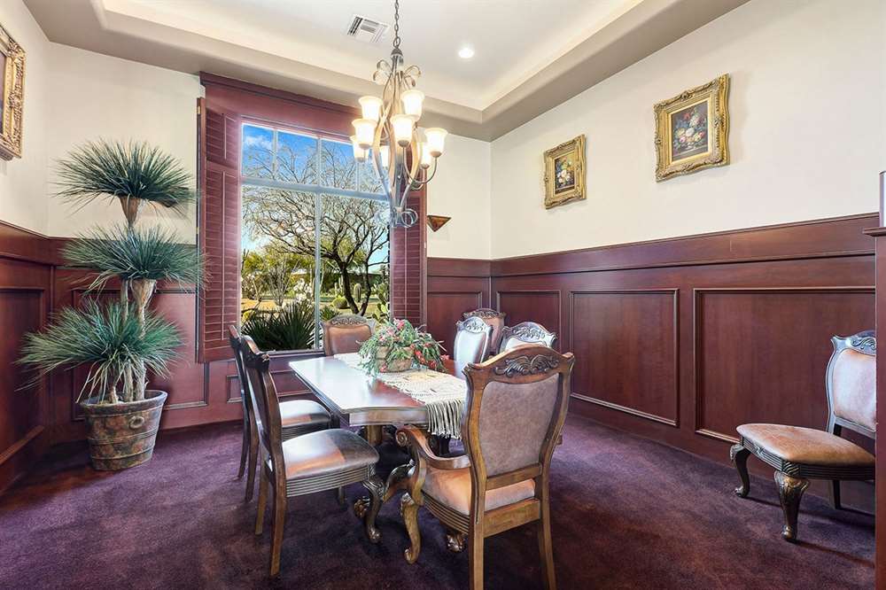 Other features include a three-car single bay garage with epoxy floors, wood accent doors, and built-in cabinets, formal dining and living spaces, a sitting room in the master, plantation shutters and wood blinds throughout, built-in barbecue, fruit trees, central vacuum, water softener, laundry room with sink and additional cabinetry, and a powder bath for guests.