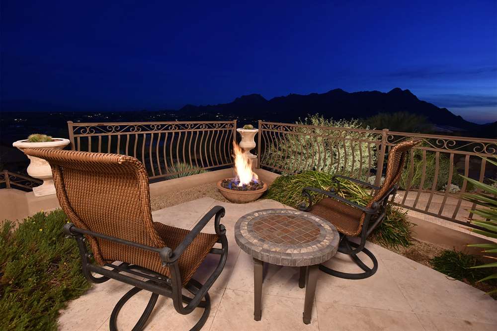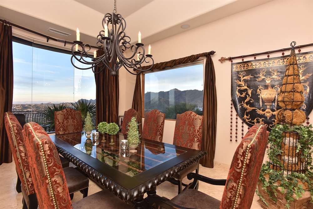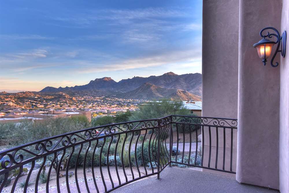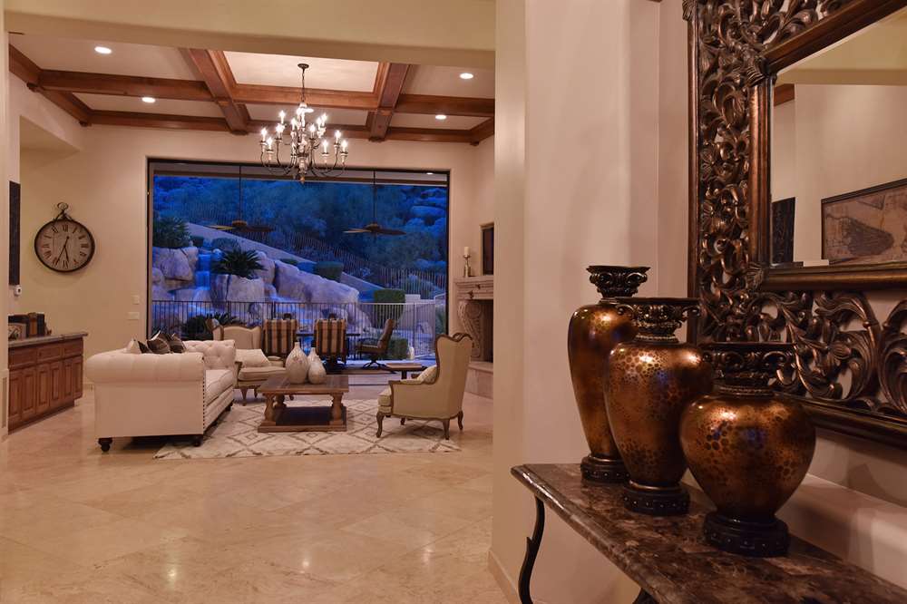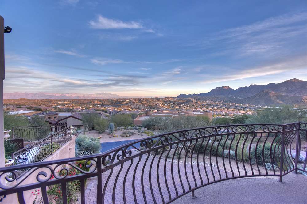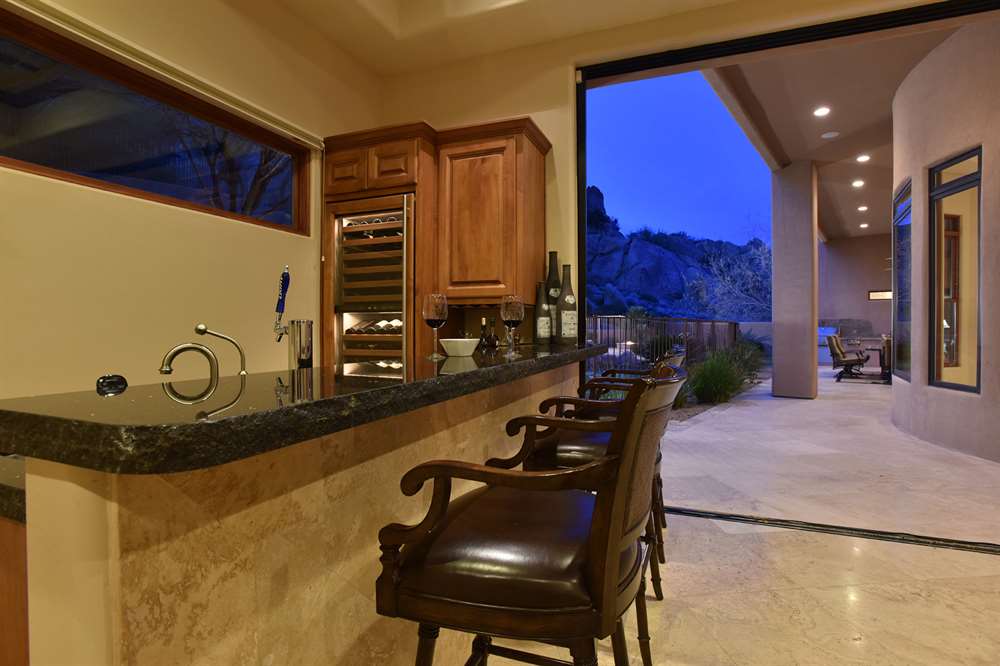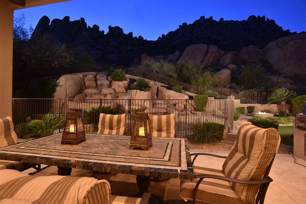 The backyard sets this property apart, blending harmoniously with Troon Mountains natural boulders by featuring a flagstone deck surrounding a sparkling pool complete with its own boulder water feature; spa; covered travertine patio featuring outdoor TV and cooking station, and private putting green.  This home will wow inside and out with views leaving you breathless!