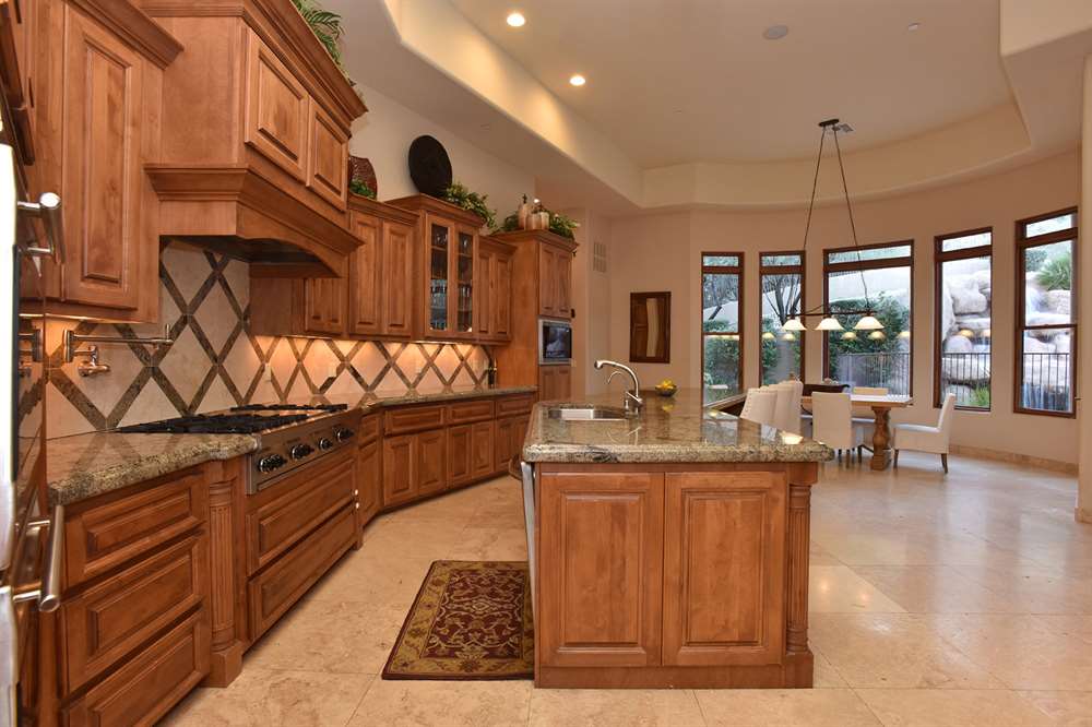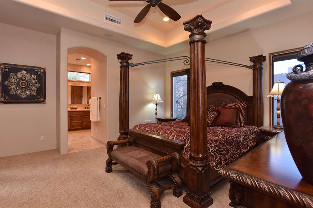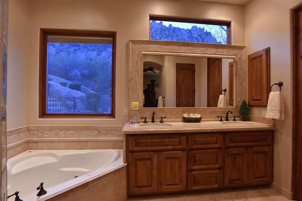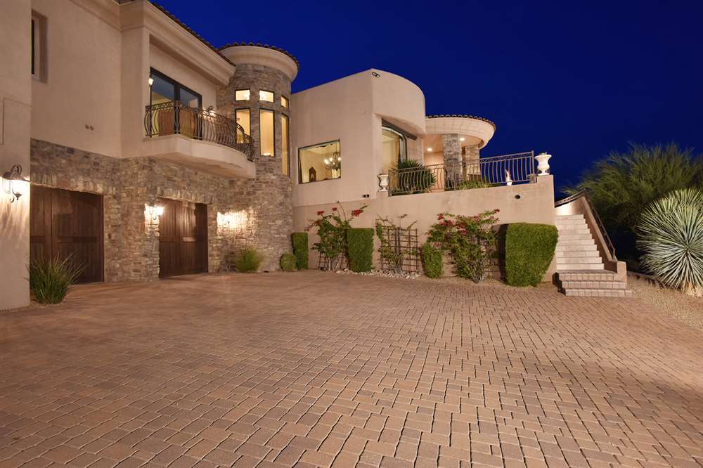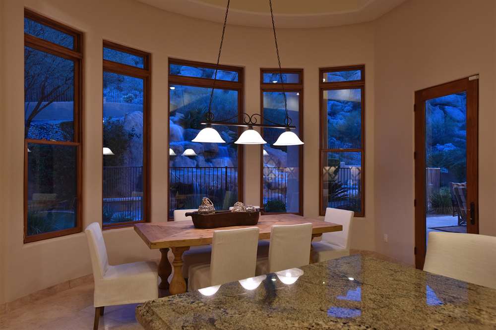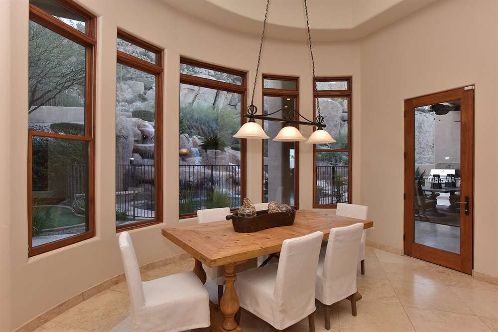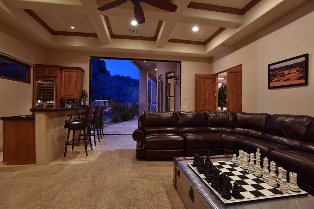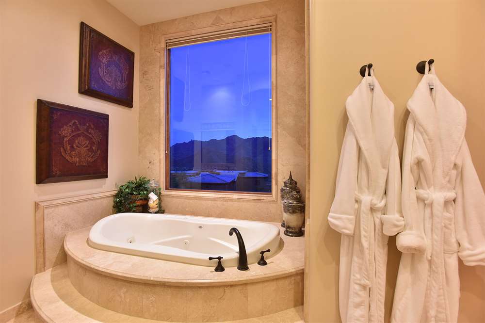 The backyard sets this property apart, blending harmoniously with Troon Mountains natural boulders by featuring a flagstone deck surrounding a sparkling pool complete with its own boulder water feature; spa; covered travertine patio featuring outdoor TV and cooking station, and private putting green.  This home will wow inside and out with views leaving you breathless!