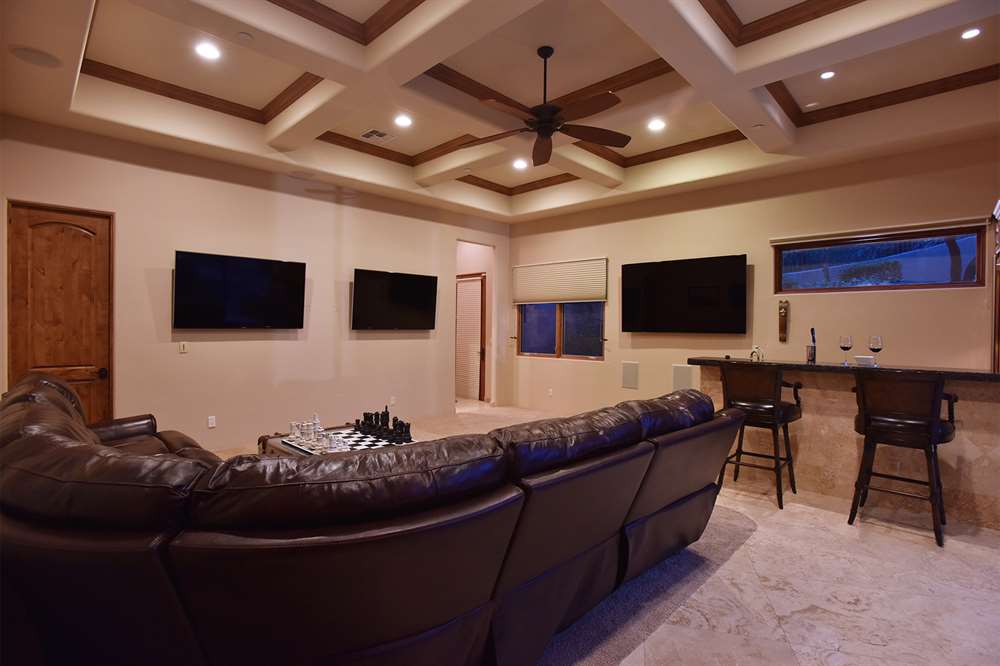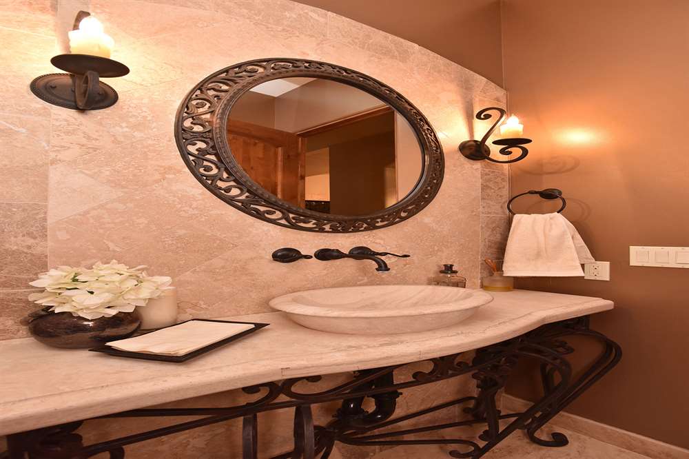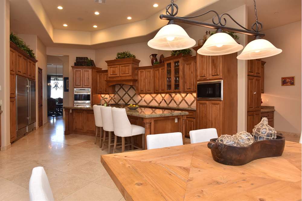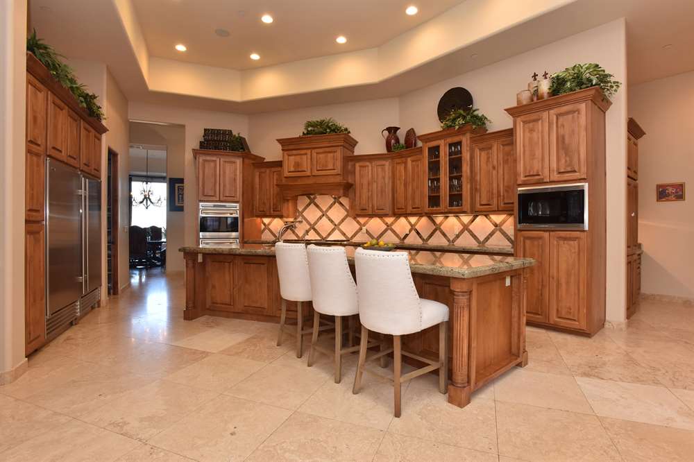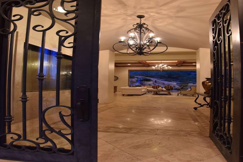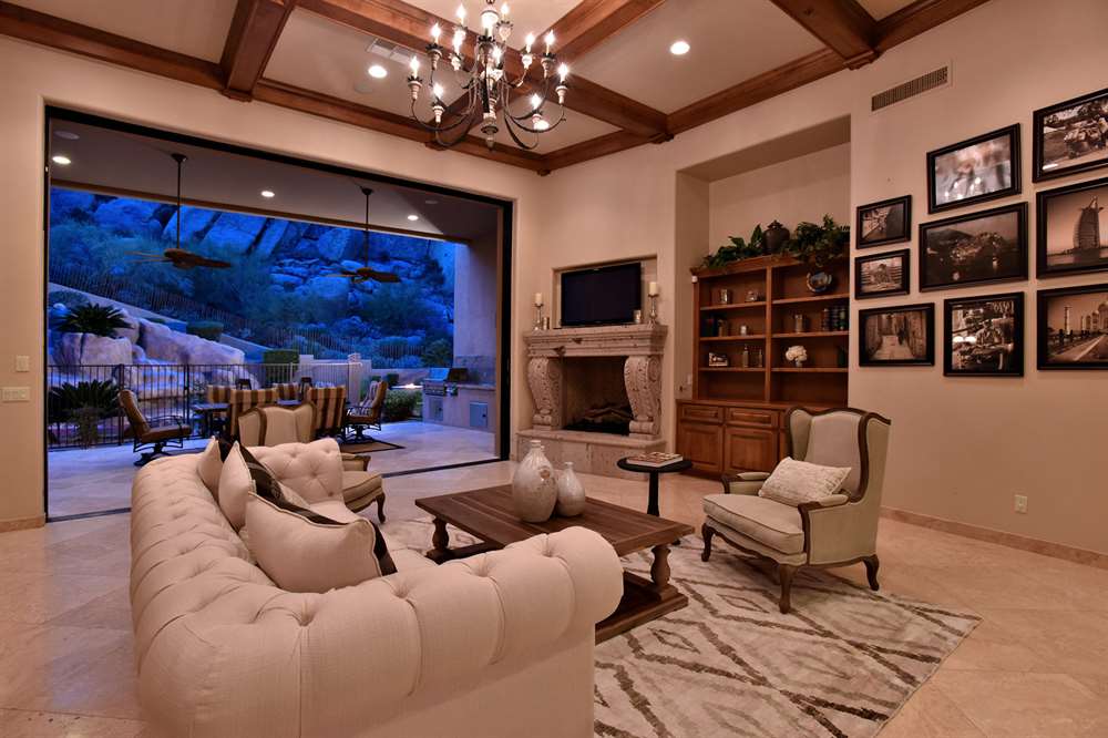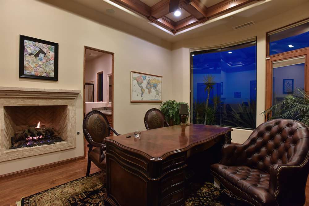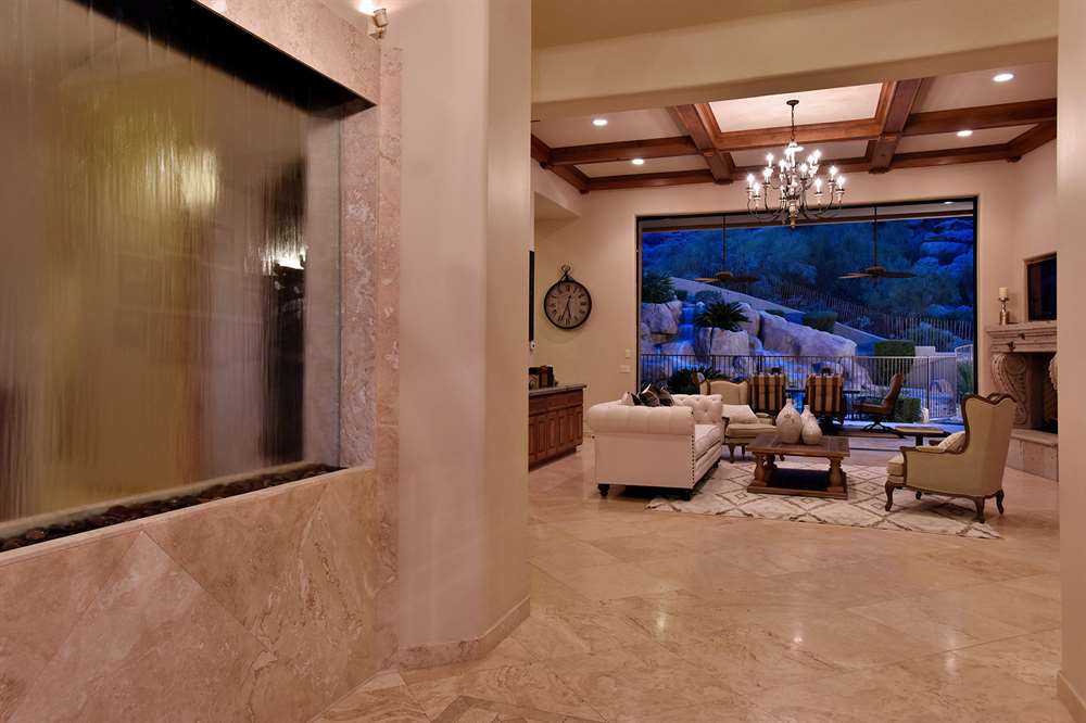18 inch travertine tile, cantera fireplaces, butted windows, retractable glass walls and wood beamed ceilings highlight the living spaces. Formal living and dining rooms with water wall feature plus family/bonus room with bar area and full size wine fridge; eat-in kitchen with designer backsplash, island/breakfast bar, dining area, and stainless steel appliances including hooded 8 gas burner range; master suite with private patio and luxurious bath area; guest suite with private bath and fireplace plus additional bedroom; office with private bath and patio; main floor features living spaces, master and office.