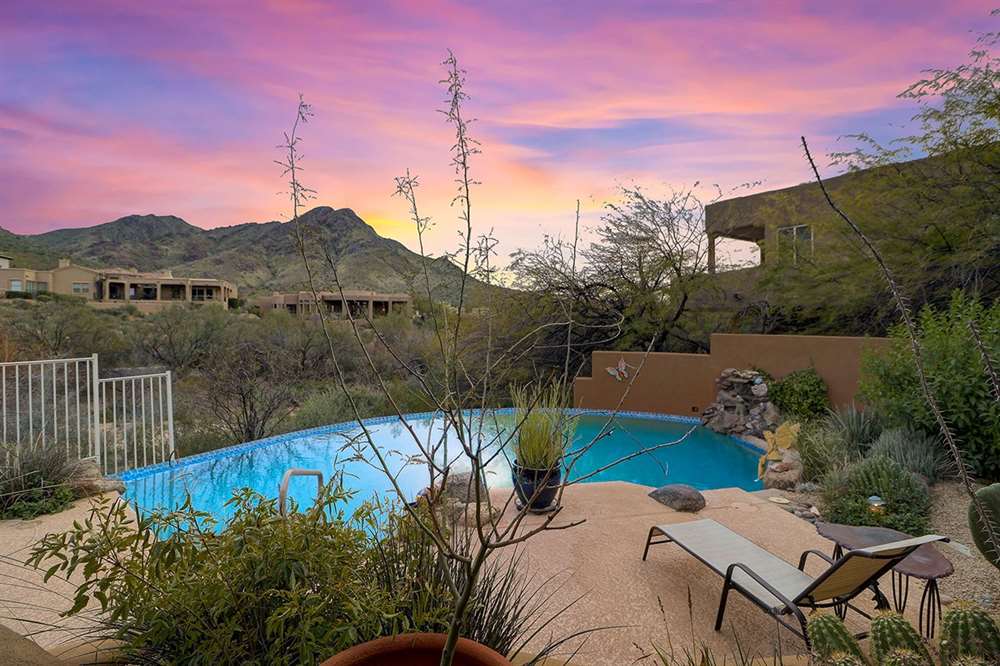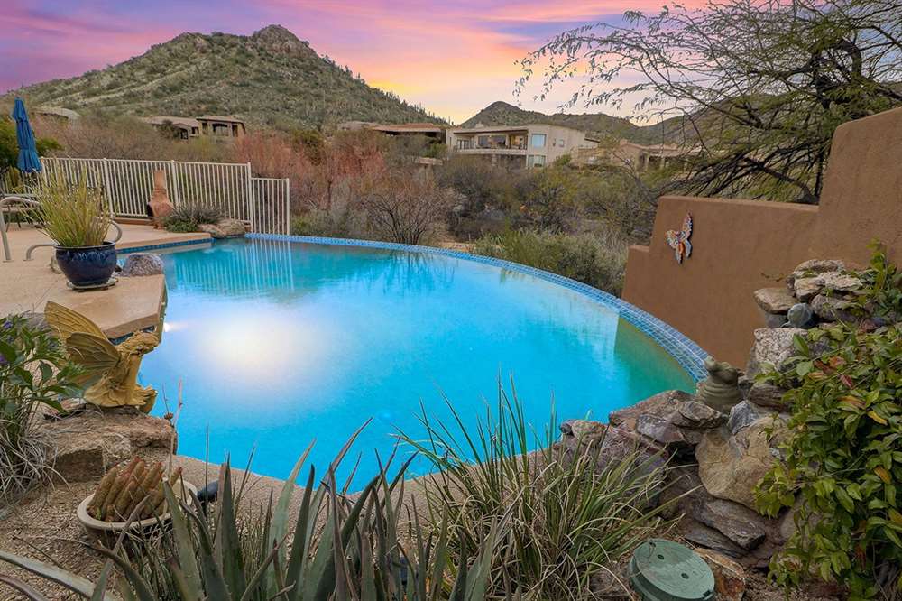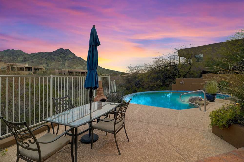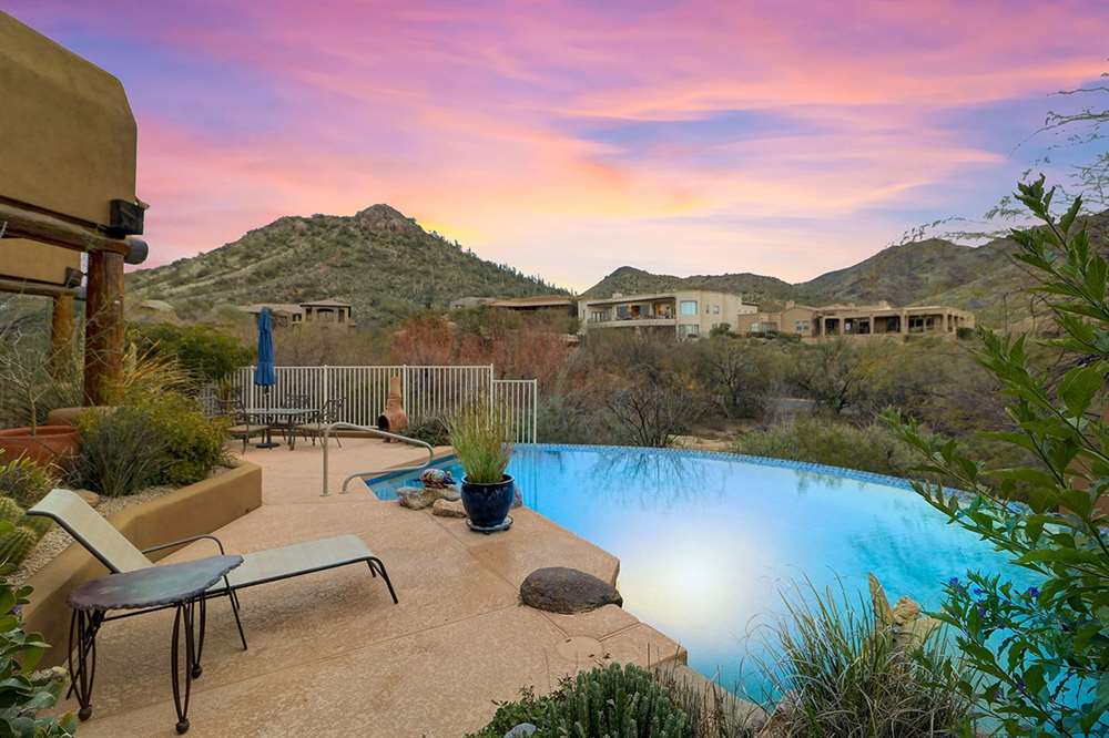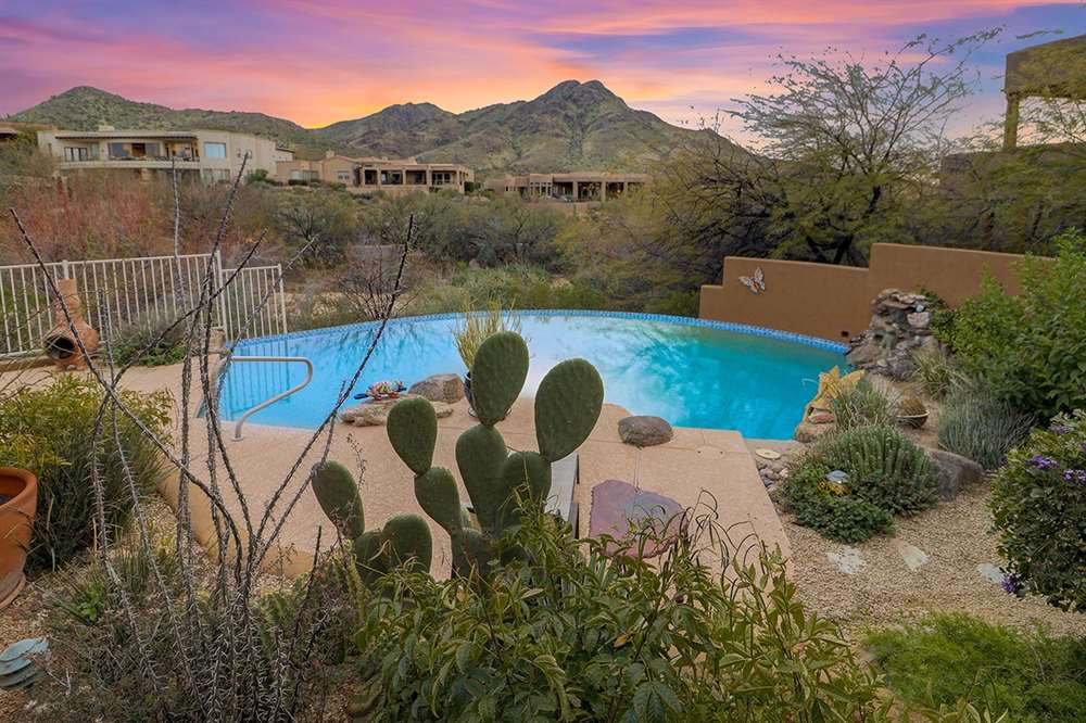 The backyard is a private get away with a covered patio for lounging, mature landscaping, a negative edge pool with water feature, an outdoor shower, a private trail leading to multiple hiking paths, and direct views of the McDowell Mountains.