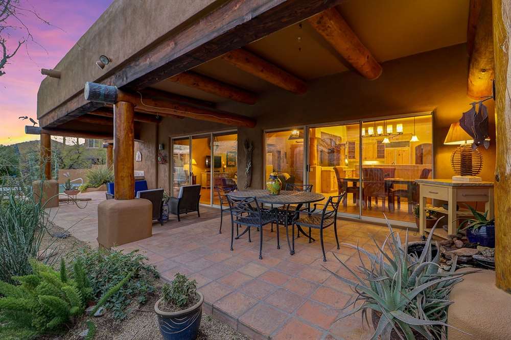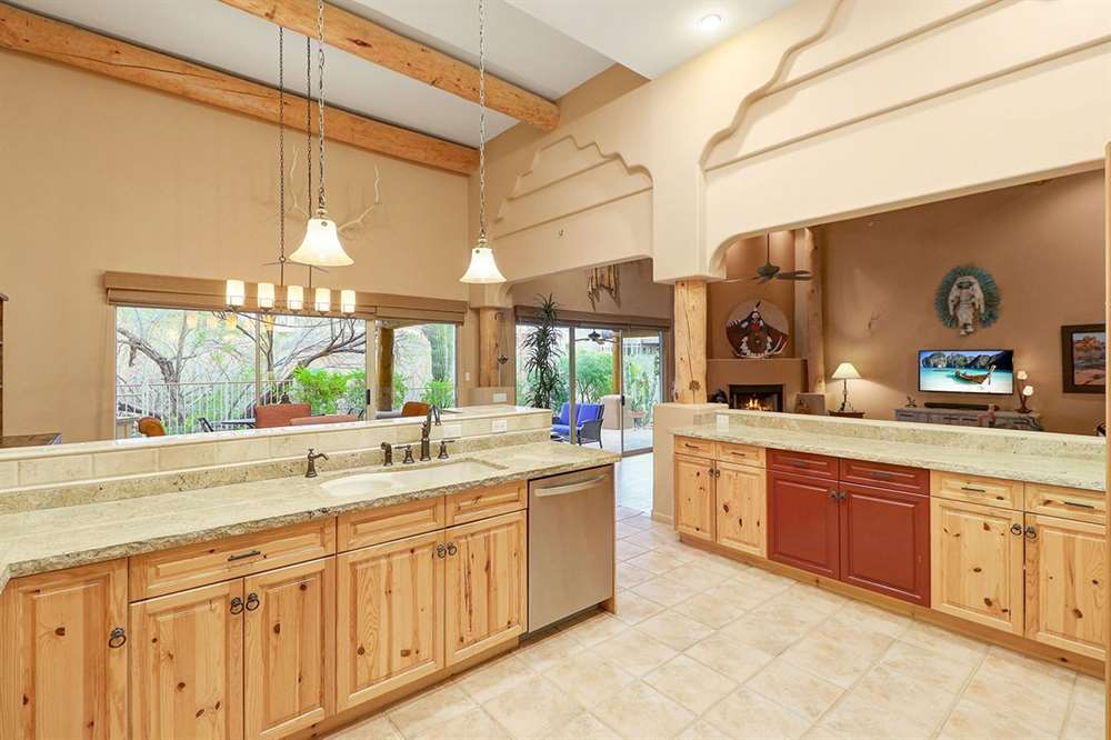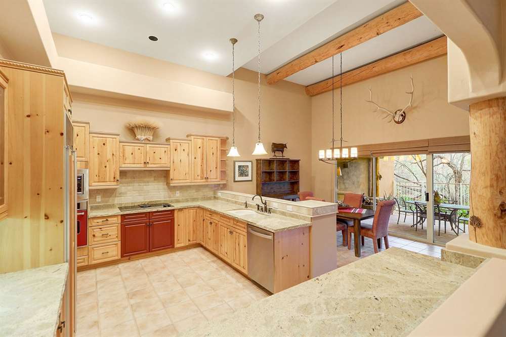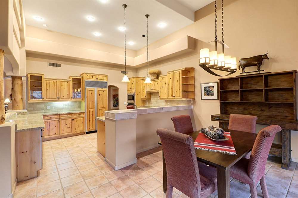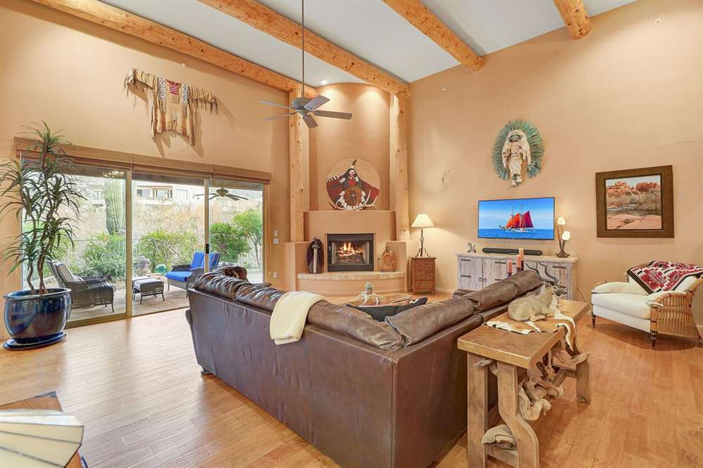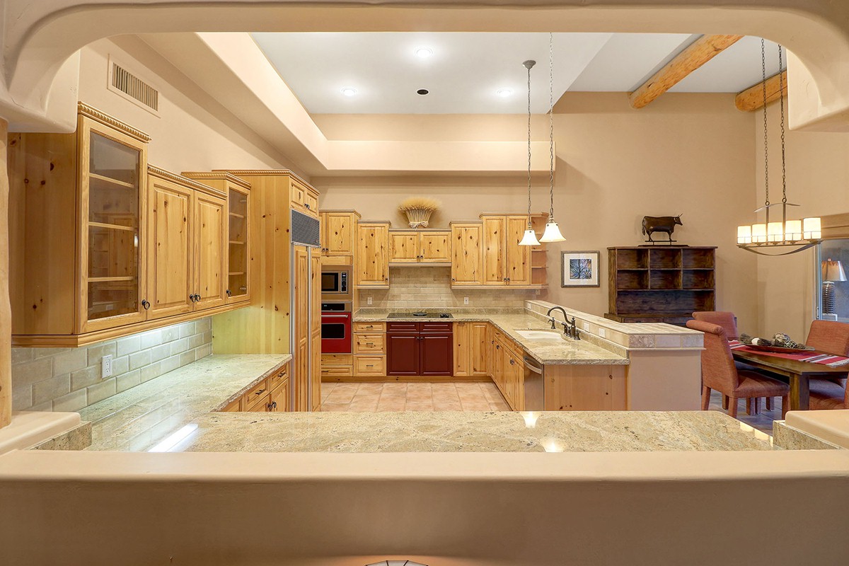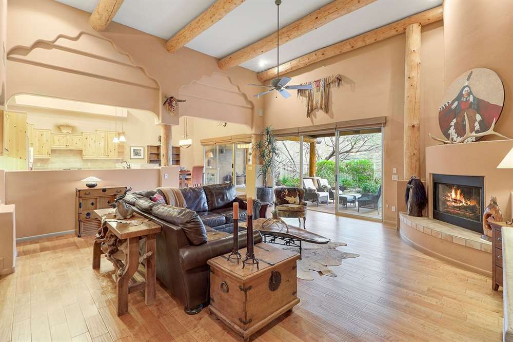 The interior has an open floor plan with the kitchen, breakfast area, and family room oriented to the backyard and views, featuring a corner kiva fireplace, hand peeled beams, hickory cabinetry, and high ceilings, making this the heart of the home. The master has a private patio access, free standing tub, large shower, dual sinks and a walk-in closet with custom closet shelving.