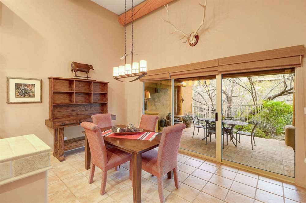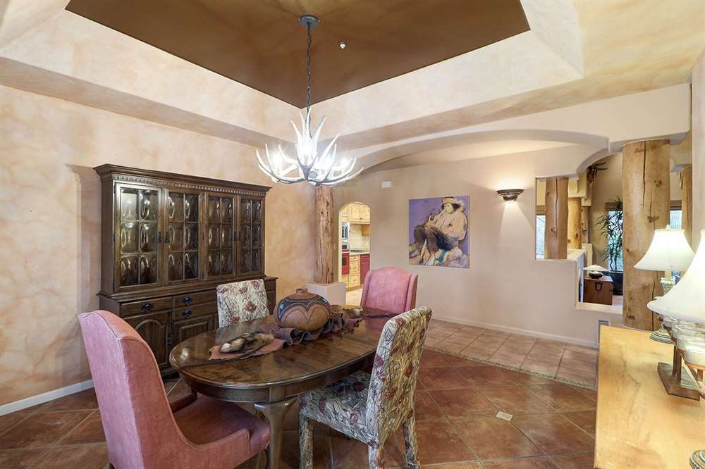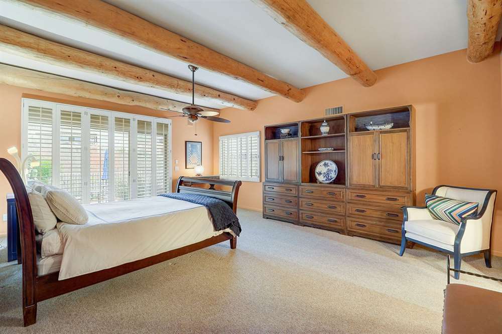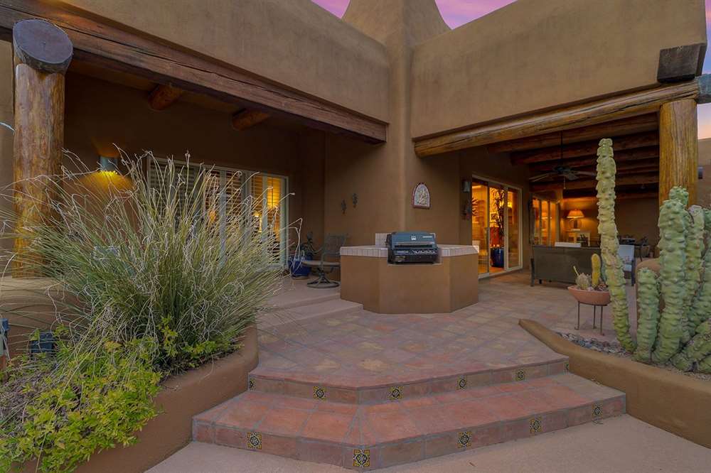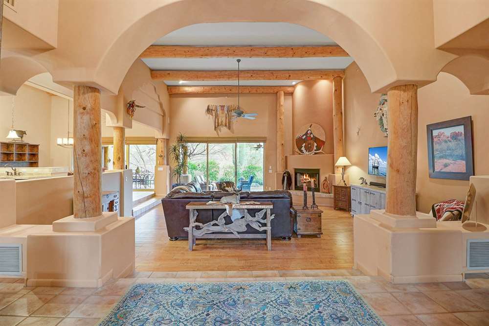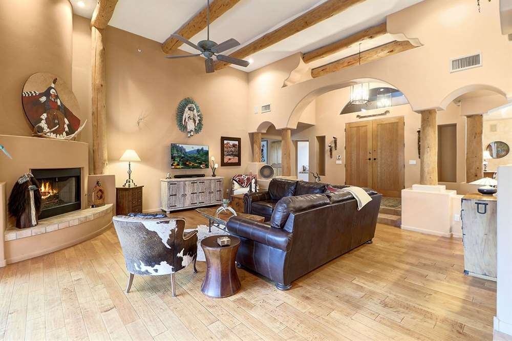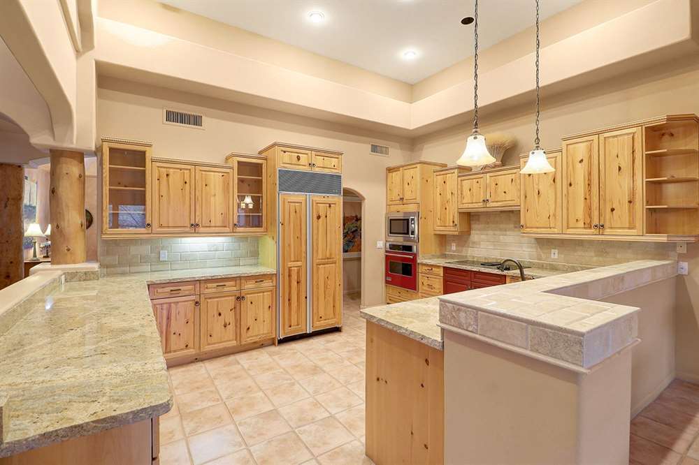 The interior has an open floor plan with the kitchen, breakfast area, and family room oriented to the backyard and views, featuring a corner kiva fireplace, hand peeled beams, hickory cabinetry, and high ceilings, making this the heart of the home. The master has a private patio access, free standing tub, large shower, dual sinks and a walk-in closet with custom closet shelving.
