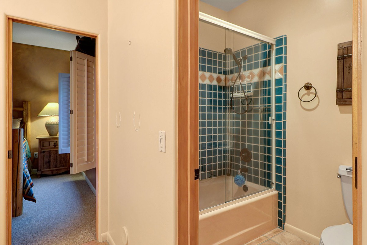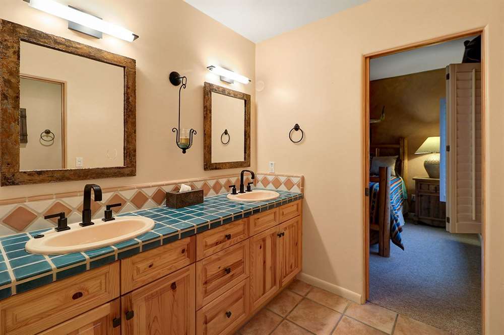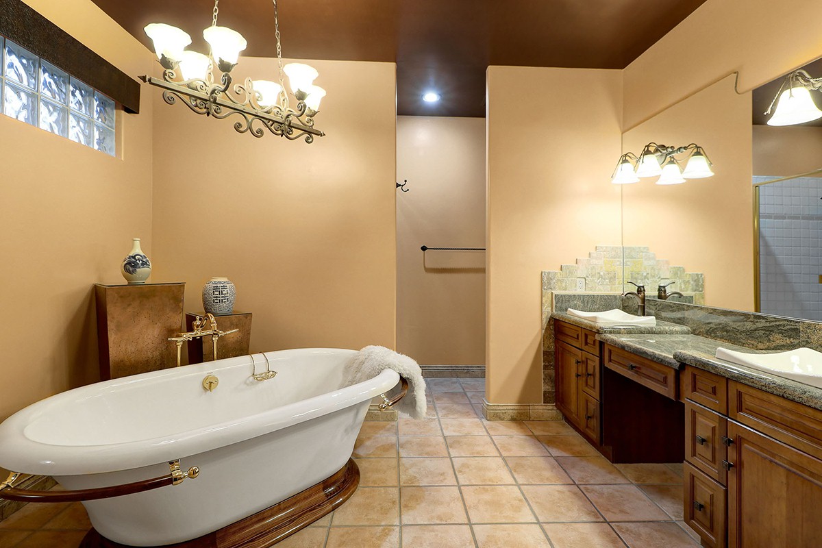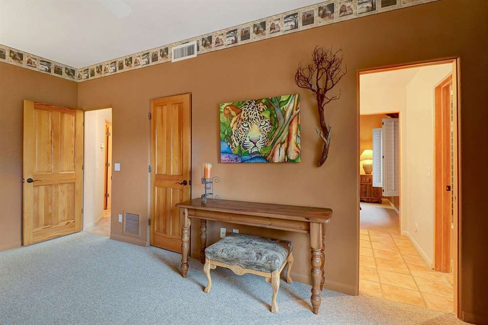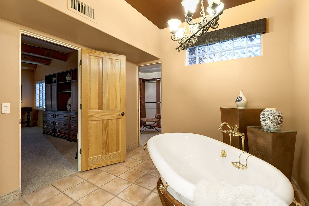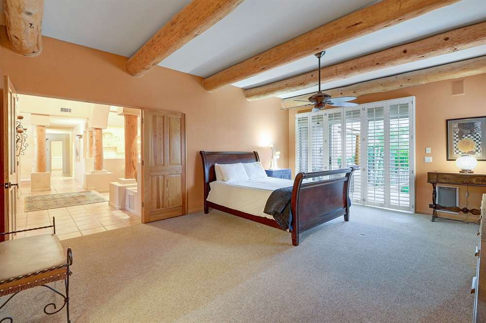 The interior has an open floor plan with the kitchen, breakfast area, and family room oriented to the backyard and views, featuring a corner kiva fireplace, hand peeled beams, hickory cabinetry, and high ceilings, making this the heart of the home. The master has a private patio access, free standing tub, large shower, dual sinks and a walk-in closet with custom closet shelving.