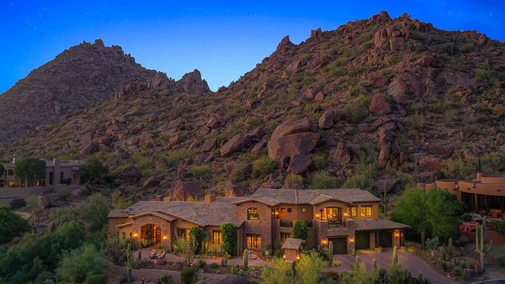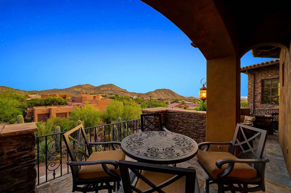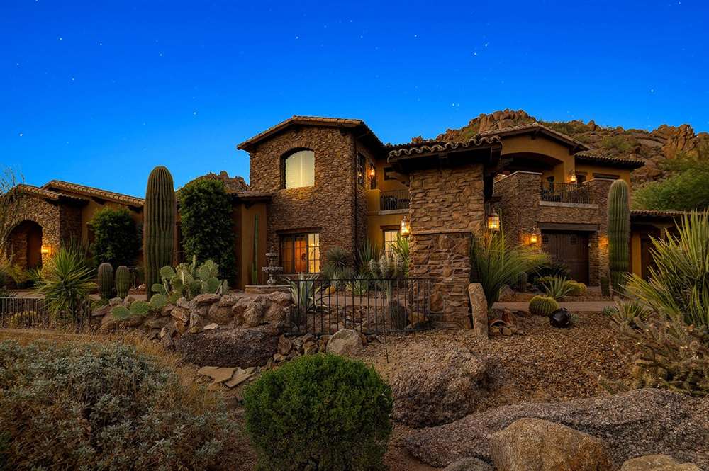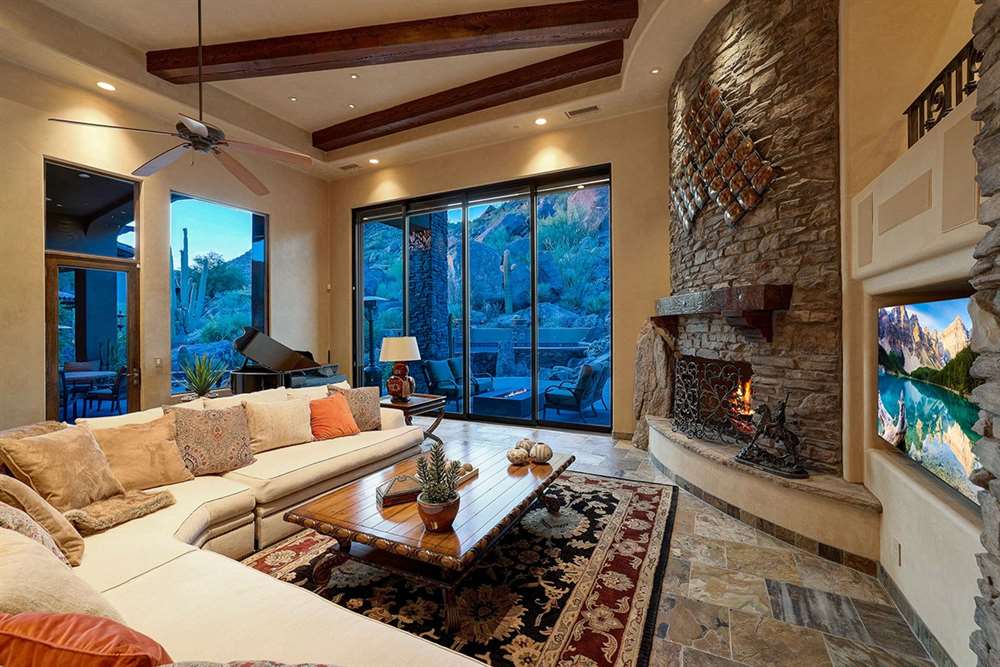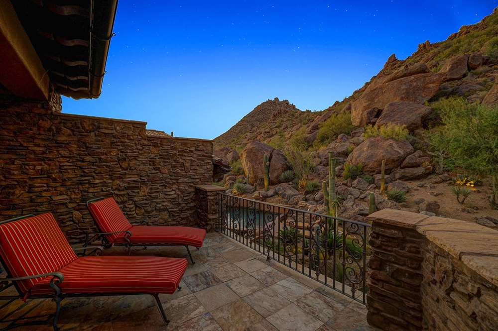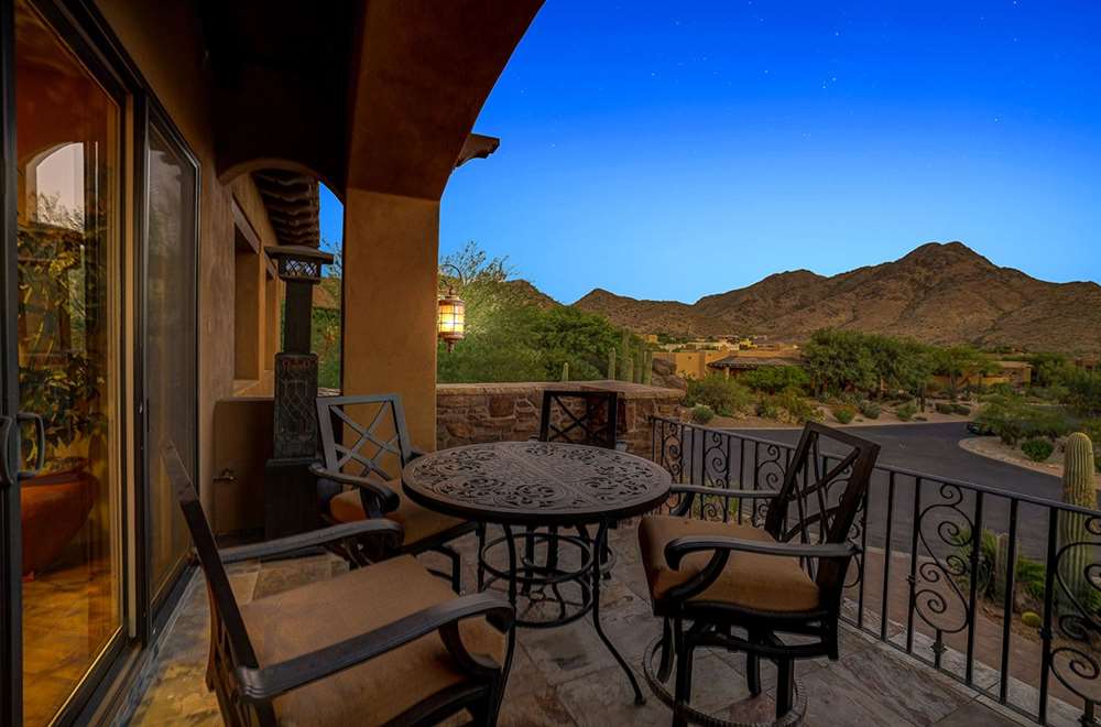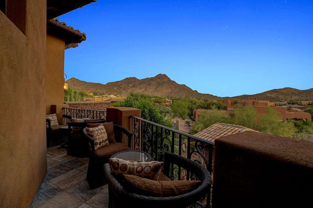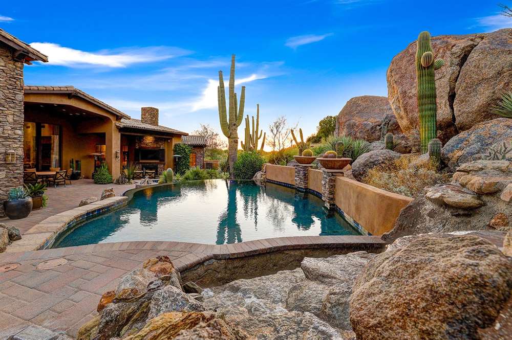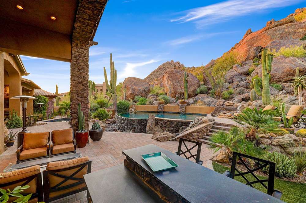 Embrace world-class luxury in this impeccable custom showcase built by RS Homes located in the gated community of Troon Ridge Estates at Troon Village. Delivering indoor-outdoor living through beautiful craftsmanship, this 6,975 square foot home sits on three and half hillside acres backing to Troon Mountain. The home went through an extensive upgrade and renovation in 2018-2019. Fine stone work, wide-plank wood and slate stone floors, wood beam ceilings, custom millwork and cabinetry, and soaring ceilings highlight the Tuscan styling and timeless architecture with views from every single room. A true resort-style yard with ample space for entertaining, has multiple patio and balcony spaces, artificial turf putting green, Whisper Rock Club inspired fireplace setting, negative edge elevated pool, separate heated spa, outdoor bar with built-in barbecue, lush desert landscaping, all set to a dramatic natural boulder and saguaro cacti backdrop.