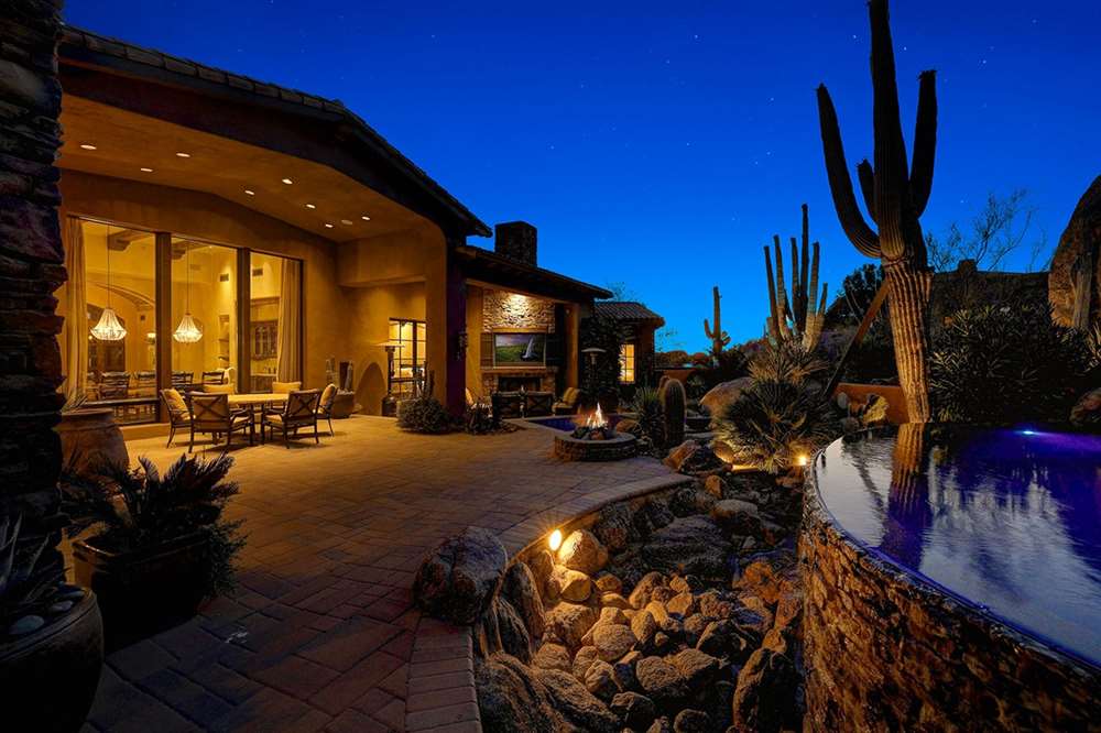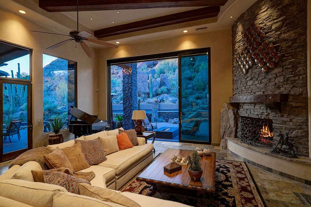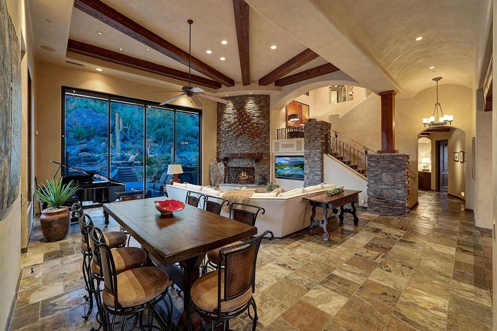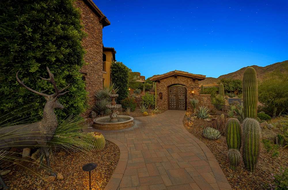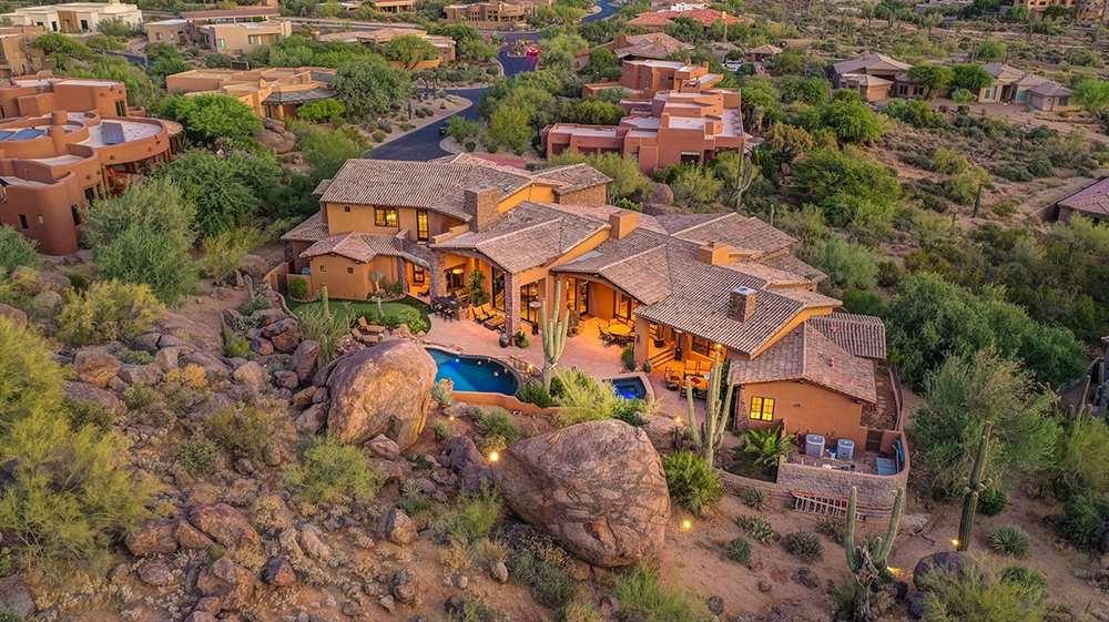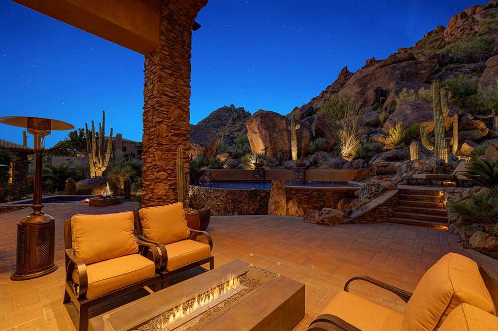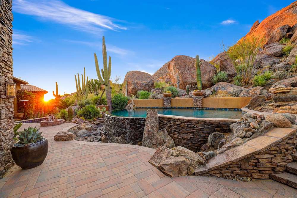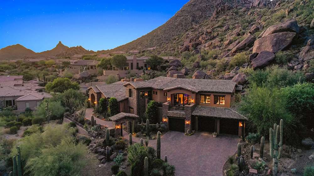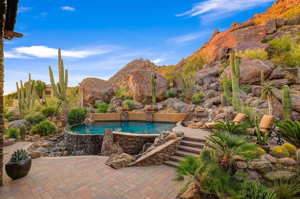 Embrace world-class luxury in this impeccable custom showcase built by RS Homes located in the gated community of Troon Ridge Estates at Troon Village. Delivering indoor-outdoor living through beautiful craftsmanship, this 6,975 square foot home sits on three and half hillside acres backing to Troon Mountain. The home went through an extensive upgrade and renovation in 2018-2019. Fine stone work, wide-plank wood and slate stone floors, wood beam ceilings, custom millwork and cabinetry, and soaring ceilings highlight the Tuscan styling and timeless architecture with views from every single room. A true resort-style yard with ample space for entertaining, has multiple patio and balcony spaces, artificial turf putting green, Whisper Rock Club inspired fireplace setting, negative edge elevated pool, separate heated spa, outdoor bar with built-in barbecue, lush desert landscaping, all set to a dramatic natural boulder and saguaro cacti backdrop.