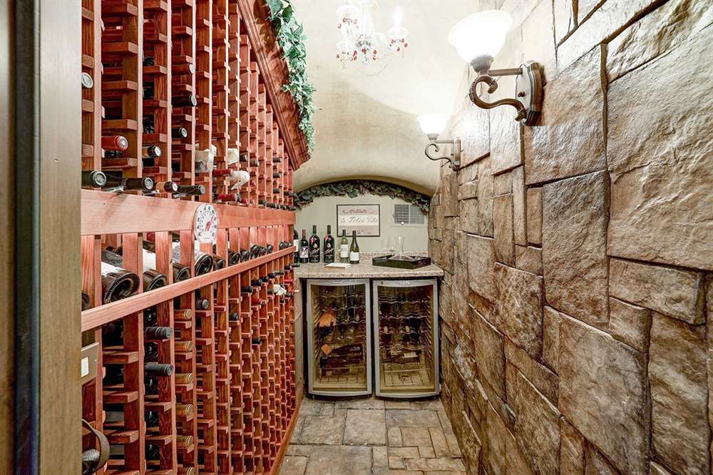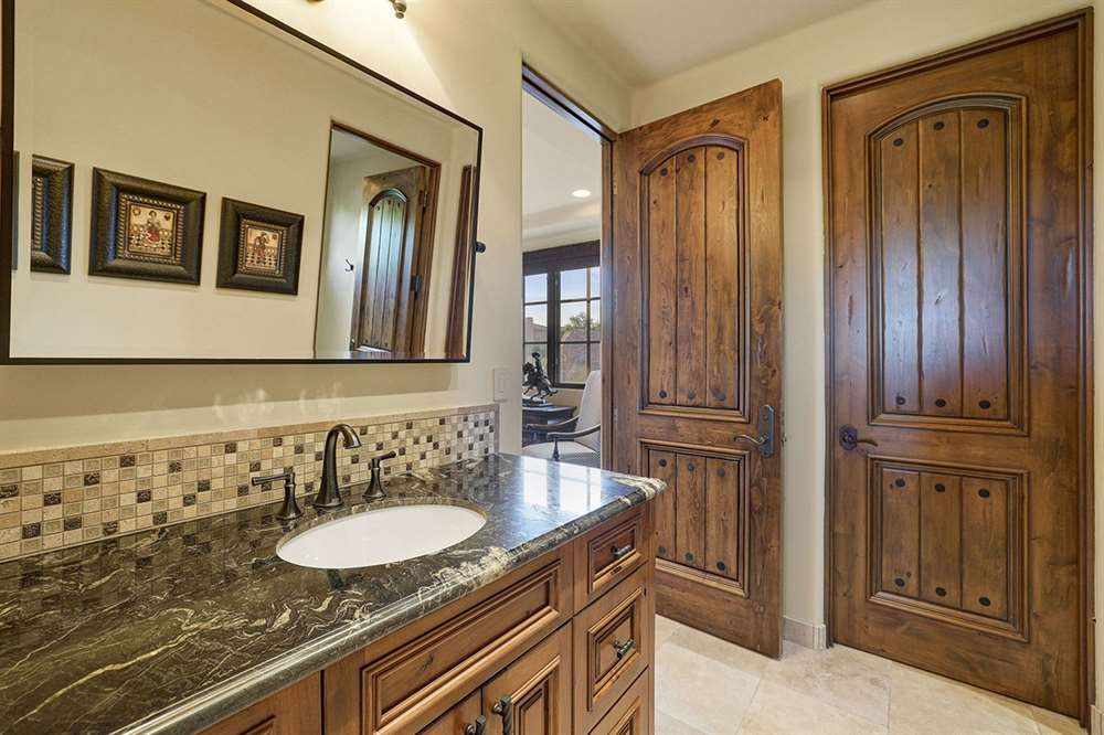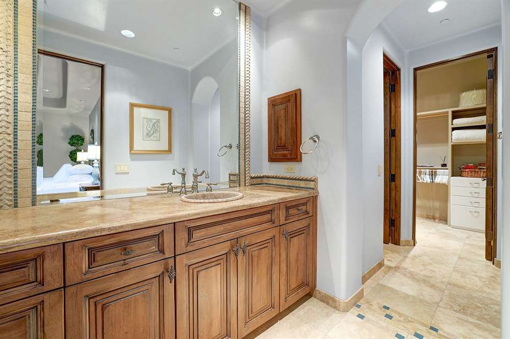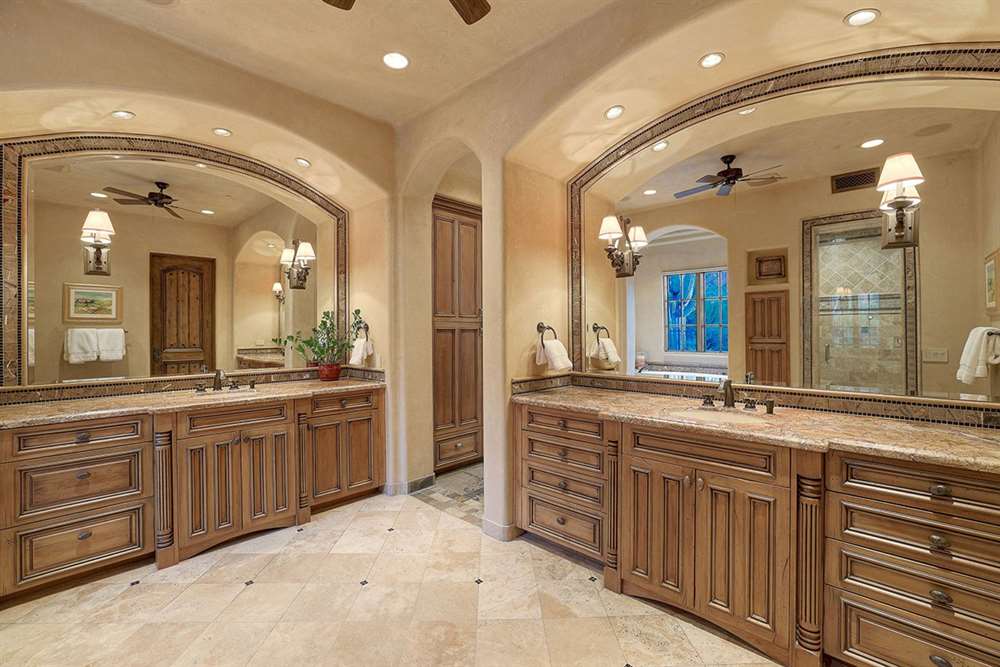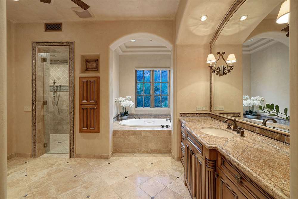 The main living level: great room area with gourmet kitchen with two islands, high-end stainless steel appliances, family room and breakfast area; formal dining room with cantera stone fireplace and display bar; office with built-in book shelves; oversized laundry with ample cabinetry; temperature controlled wine room; two master suites. The main master bedroom has exterior access, centerpiece fireplace, dual vanities, separate shower and soaking tub, and walk-in closet with custom organizational system. The secondary master also features exterior access, coved ceilings, and a travertine clad bathroom with walk-in closet.