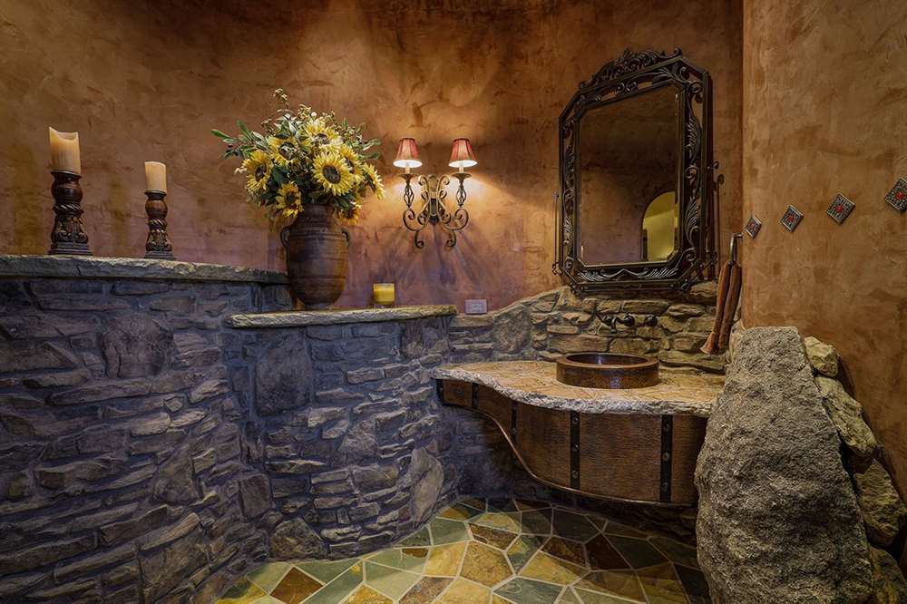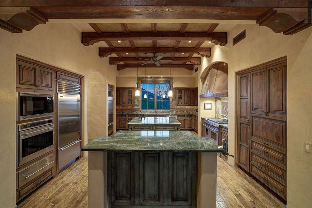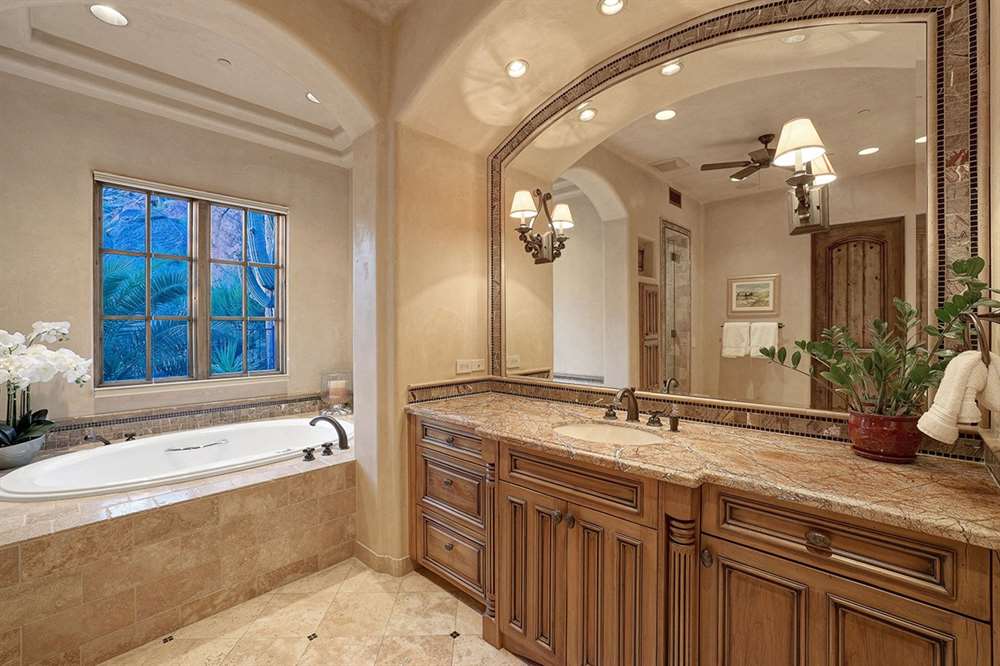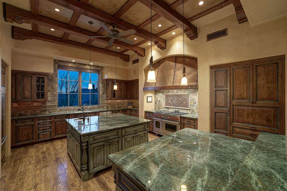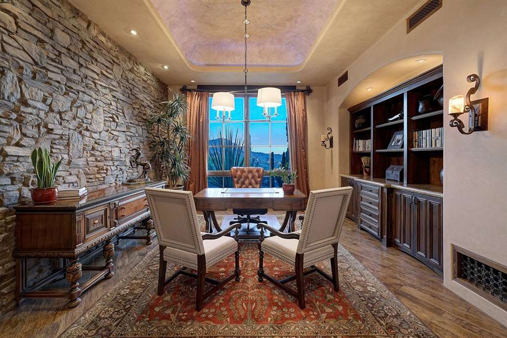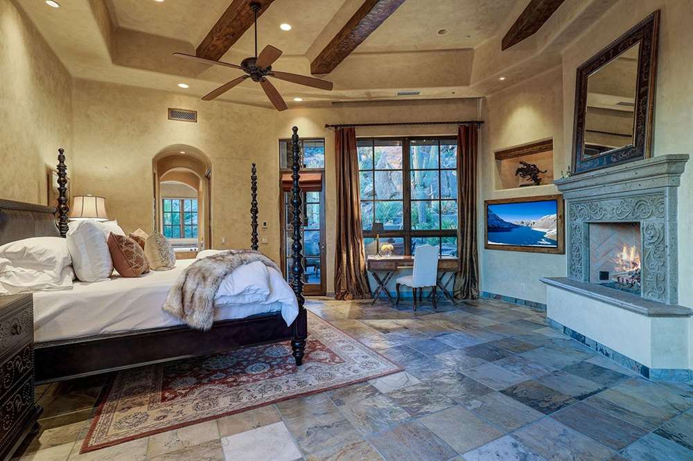 The main living level: great room area with gourmet kitchen with two islands, high-end stainless steel appliances, family room and breakfast area; formal dining room with cantera stone fireplace and display bar; office with built-in book shelves; oversized laundry with ample cabinetry; temperature controlled wine room; two master suites. The main master bedroom has exterior access, centerpiece fireplace, dual vanities, separate shower and soaking tub, and walk-in closet with custom organizational system. The secondary master also features exterior access, coved ceilings, and a travertine clad bathroom with walk-in closet.