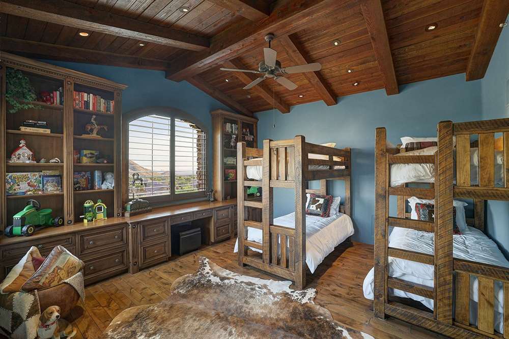 The upper living level: den/family room with balcony, wet bar, and mountain views; two additional guest en suites with private balconies; bonus room perfect for an office or playroom (currently displayed as additional sleeping quarters).