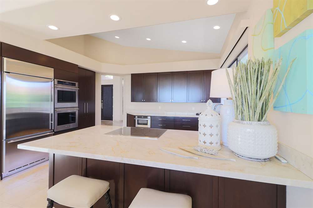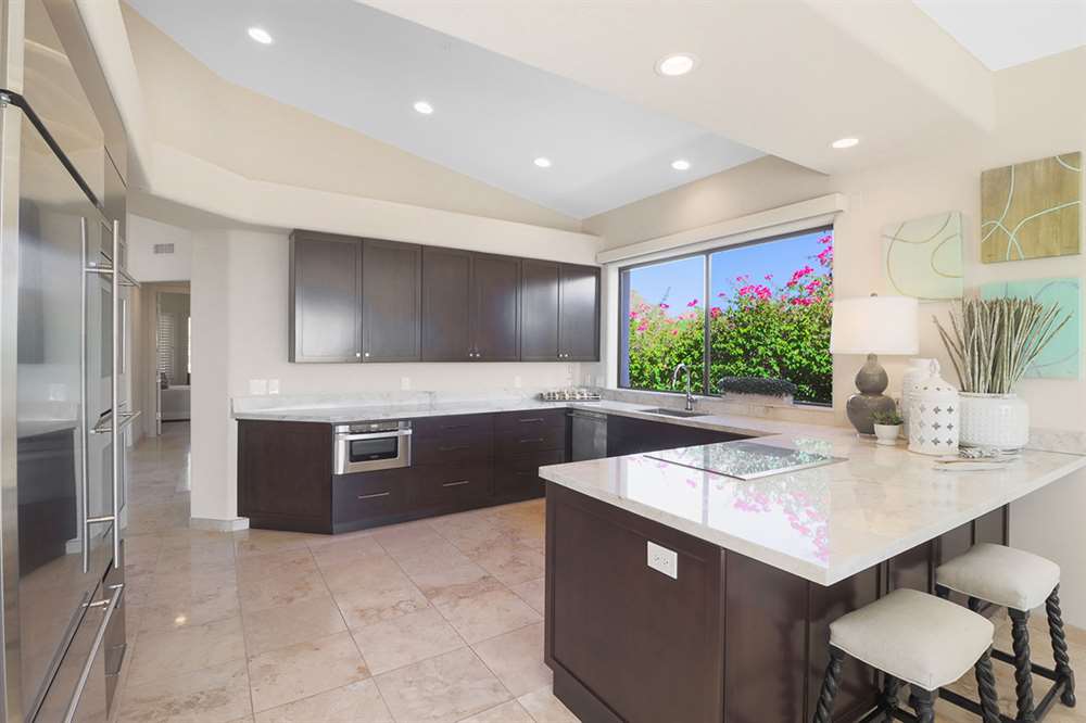 Complete remodel was done in 2015 leaving no detail behind including new kitchen and bathroom cabinetry and countertops, neutral paint, and updated fixtures and finished throughout. The kitchen has modern flat panel dark cabinets with complimentary stone counters, stainless steel appliances, built-in microwave, double ovens, convection stove top, and overlooks the dining room with views over looking the backyard and beyond.