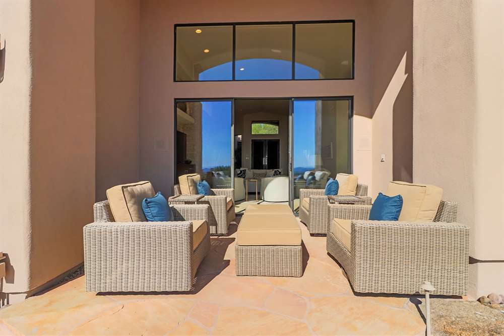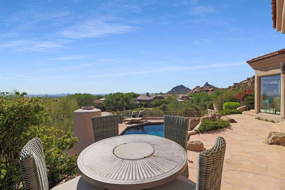 The backyard has multiple entertaining areas including covered and uncovered dining, lounge areas, kiva fireplace, heated pool with waterfall feature, boulder accents, and view fencing to take in the surrounding views.
